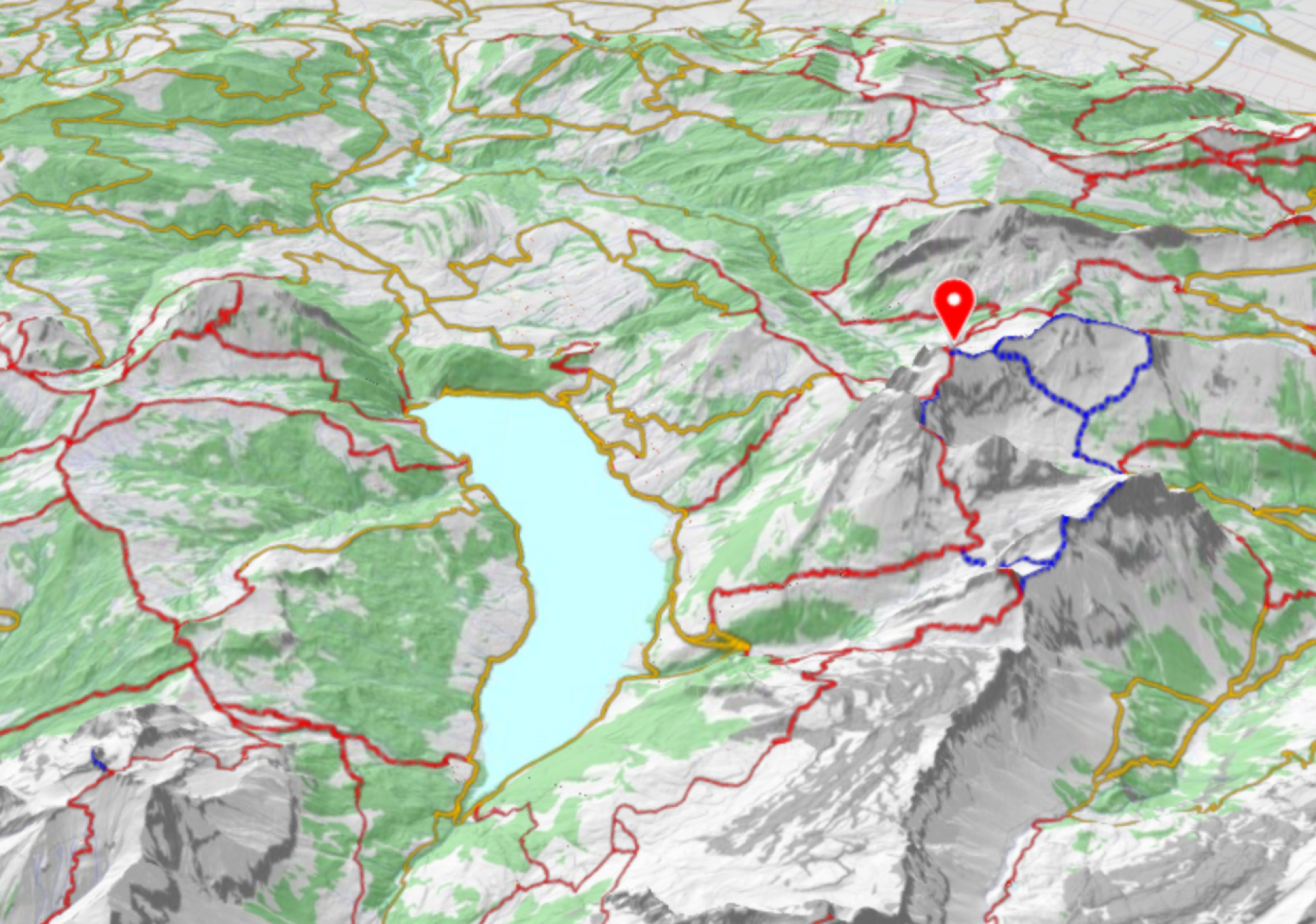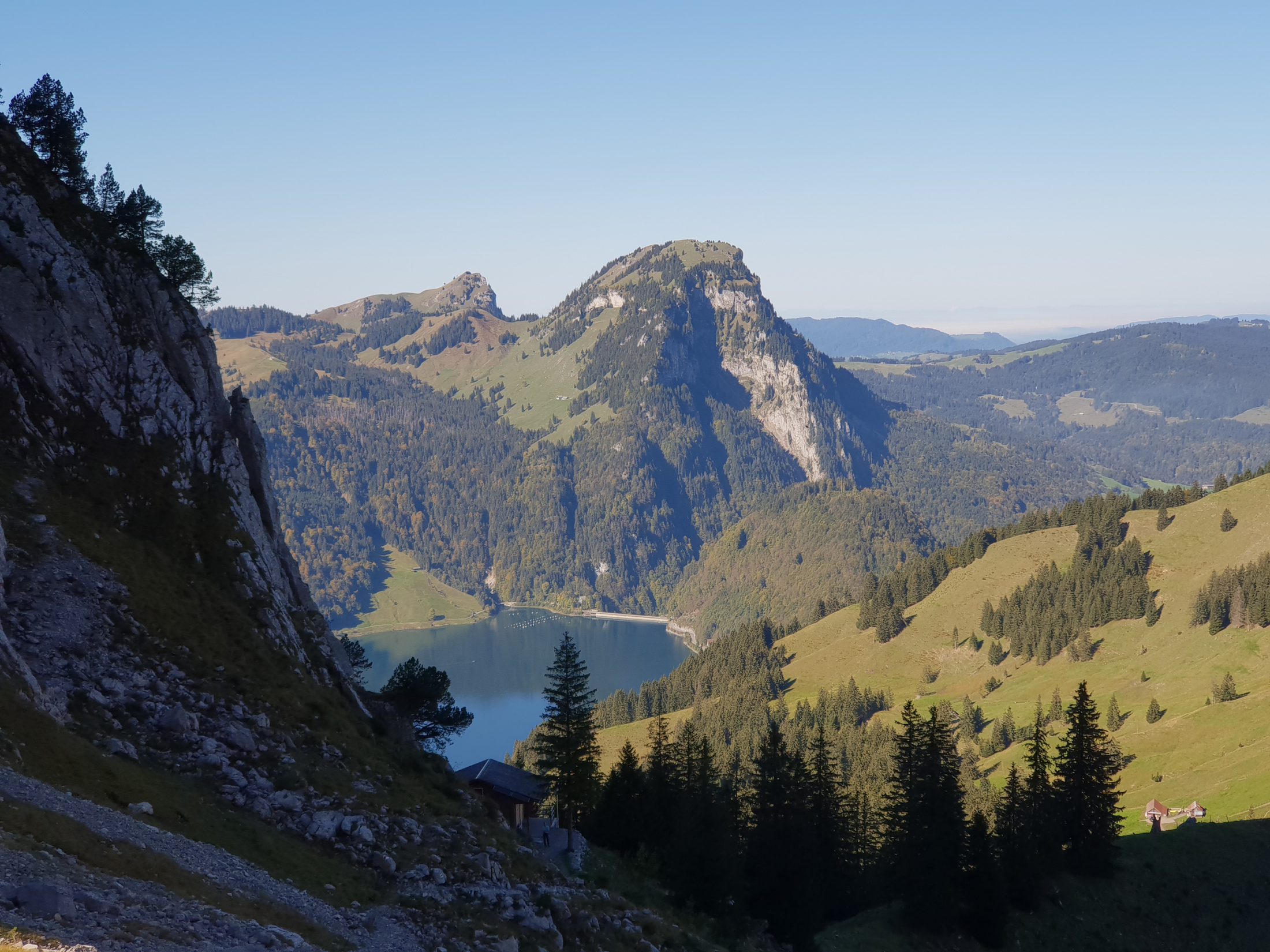 Man fliegt über dem Wanderweg zurück zum Gestade des Wägitalersees. Gelandet werden kann auf den nicht ganz ebenen Weiden beim Restaurant Oberhof. Schwierigkeitsgrad: mittel. Für Wenigerfahrene empfiehlt sich eine Besichtigung vor Ort.