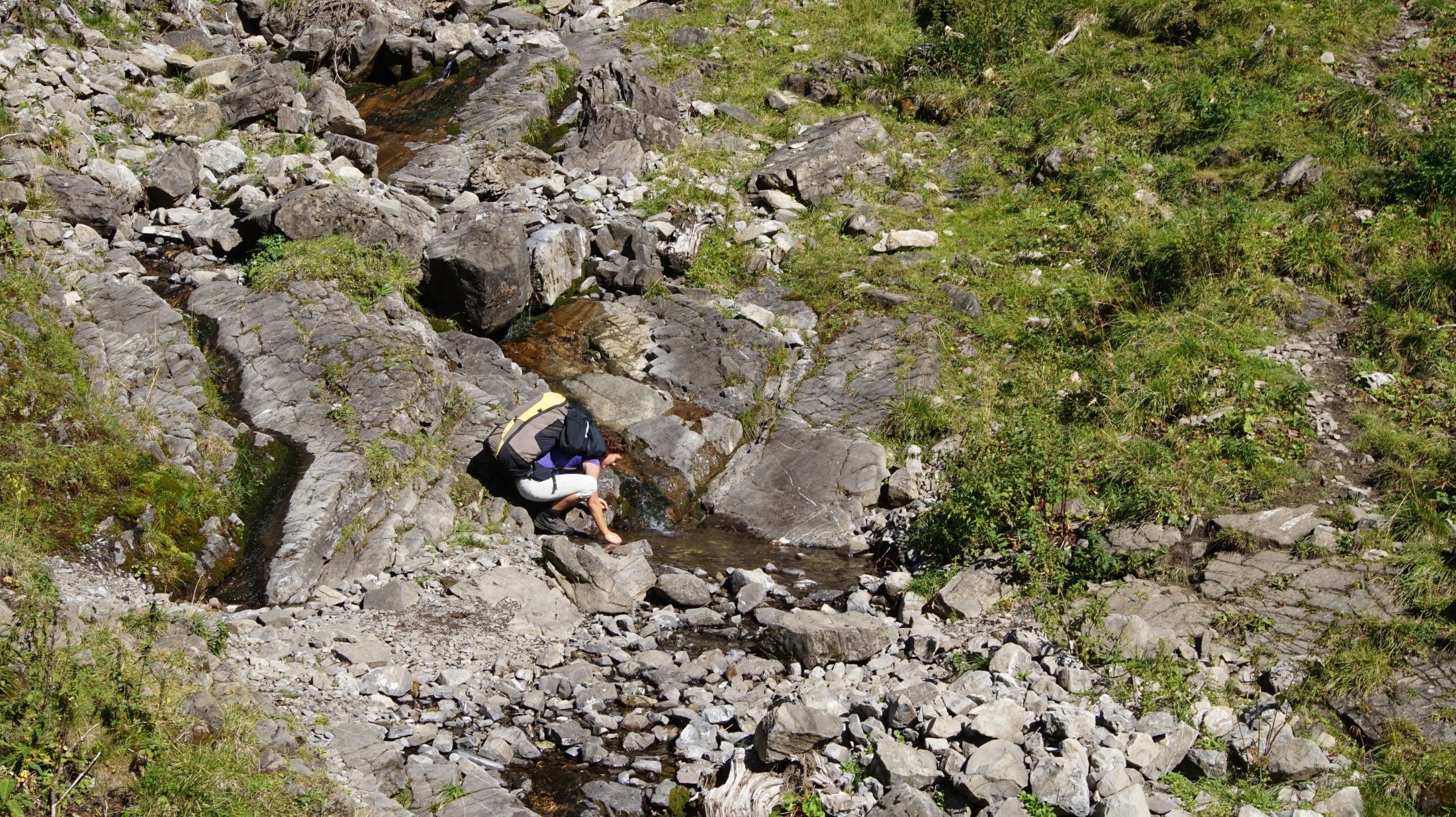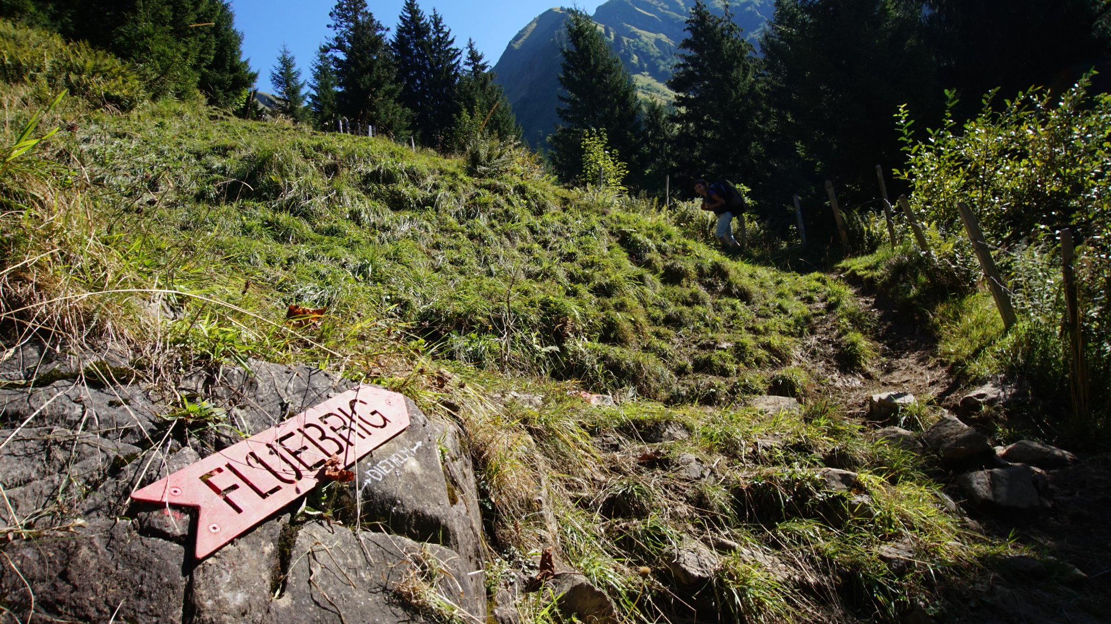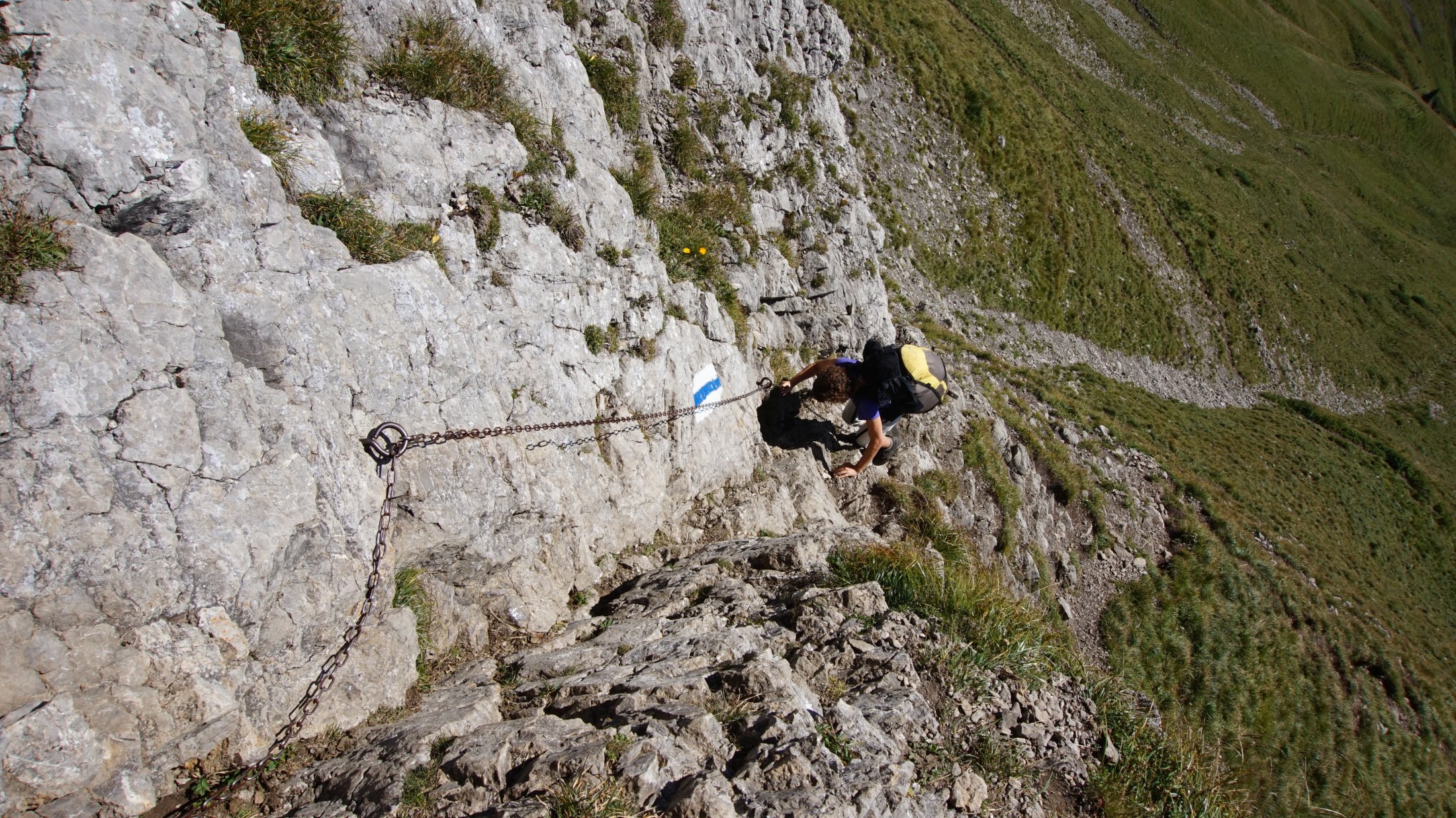 Ab Ochsenboden (930 m) führt der Weg vorbei am Golfplatz in den Wald und steigt leicht in einer langen Traverse bis zum Punkt 1297 m, den man nach ca. einer Stunde erreicht. Ab diesem Punkt verläuft der Weg nicht mehr durch den kühlenden Wald und steigt im Zickzack dem Turnerbach entlang in die Höhe. Wir passieren Schärm (1568 m) und Obergross (1839 m) und gelangen zum Punkt 1950 m, zwischen Wändlispitz und Diethelm gelegen. Verlief bis zu diesem Punkt der Weg auf Wald- und Weidpfaden ohne Schikanen, wird es nun steil und anspruchsvoller. Um auf den Diethelm zu gelangen müssen eine steile Halde und zwei Felsbänder durchstiegen werden. Der Einstieg in das erste Band erfolgt über eine Leiter, danach sind Fixseile angebracht -> dieser finale Abschnitt gilt als T4, demnach als alpines Wandern und ist weiss/blau/weiss markiert. Bedenke dass Du zu diesem Zeitpunkt schon ca. 2 1/2 Stunden in den Beinen, einen schweren Rucksack auf dem Rücken hast. Hier sind Tritt- und Griffsicherheit, sowie Schwindelfreiheit unabdingbar. Hat man das zweite Band durchstiegen, gelangt man auf die Gipfelflanke und zu einem Ausblick, dass einem die Augen übergehen. In "normalem" Tempo waren wir ab Ochsenboden in 3 Stunden auf dem Gipfel.
