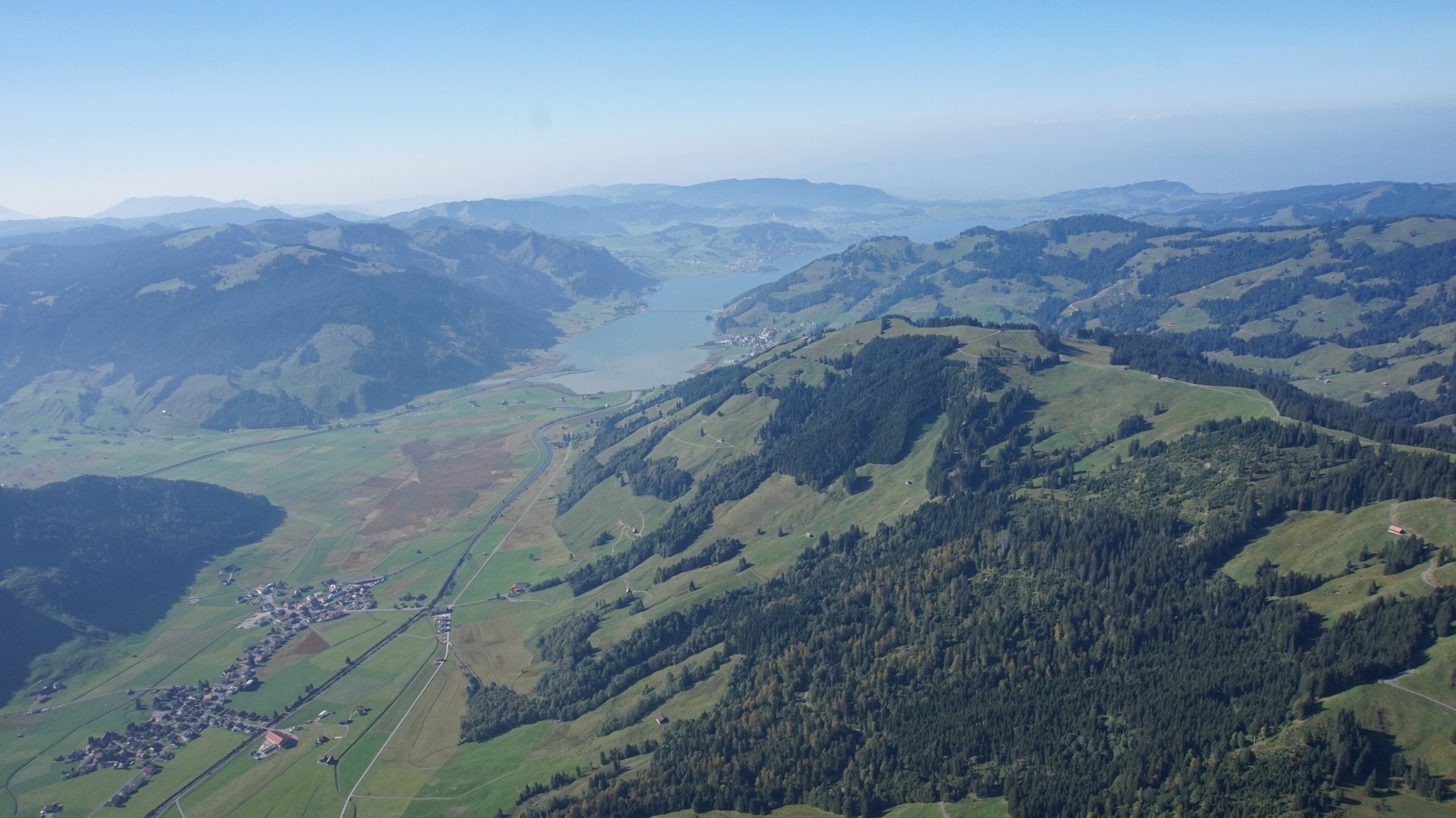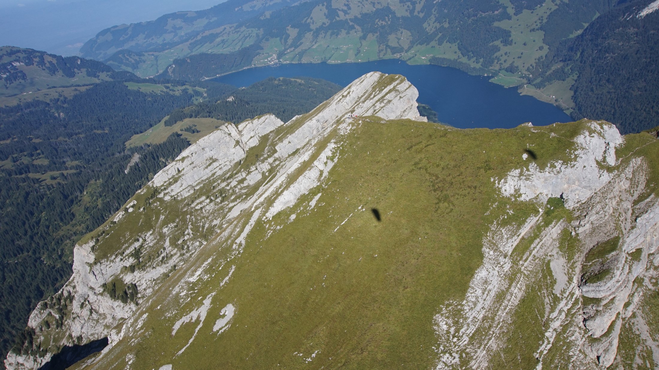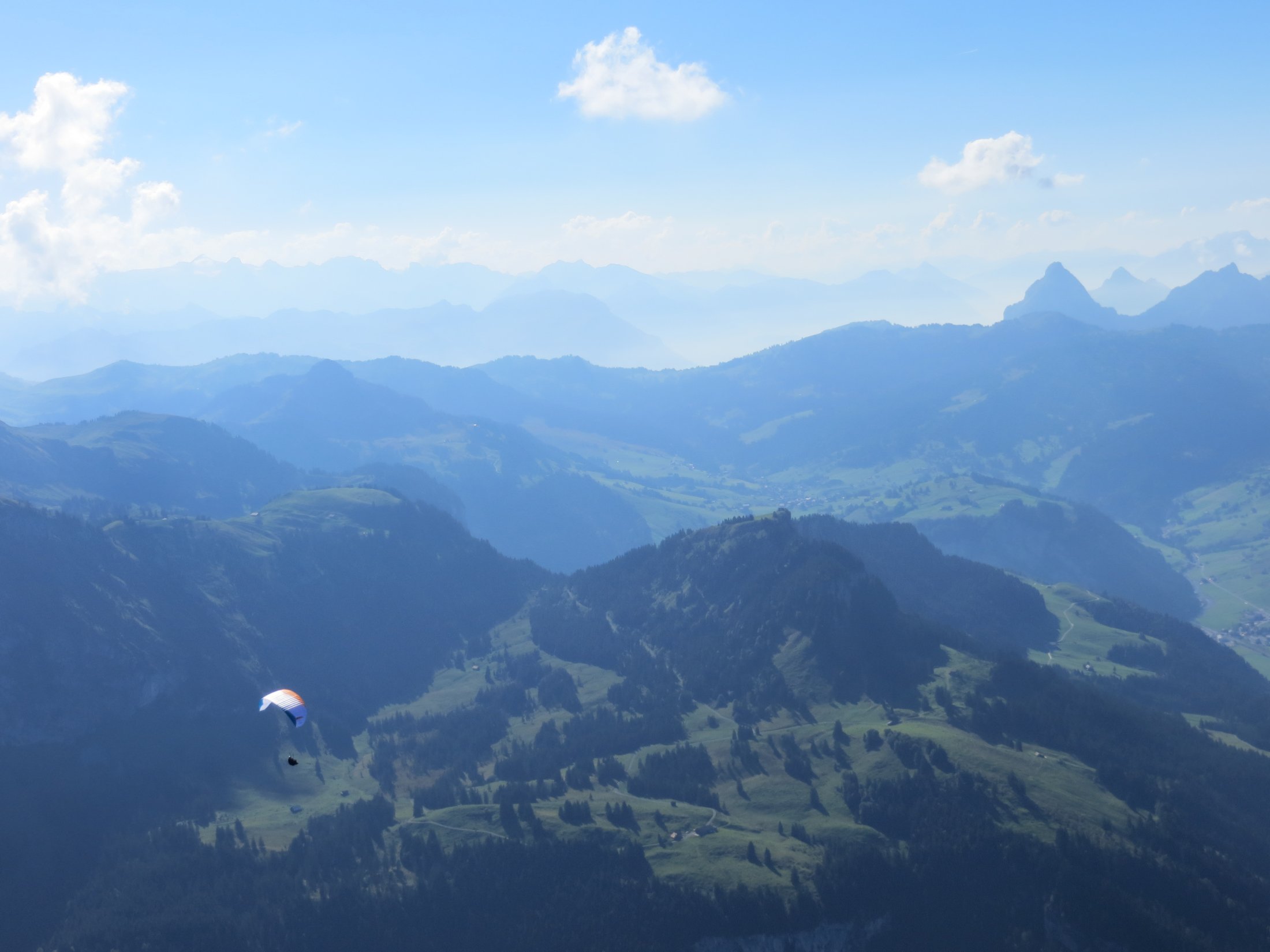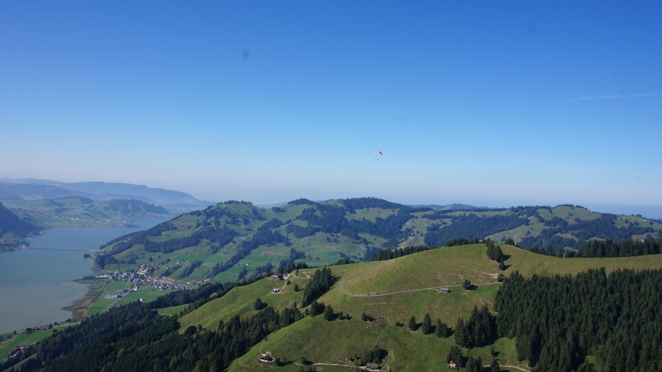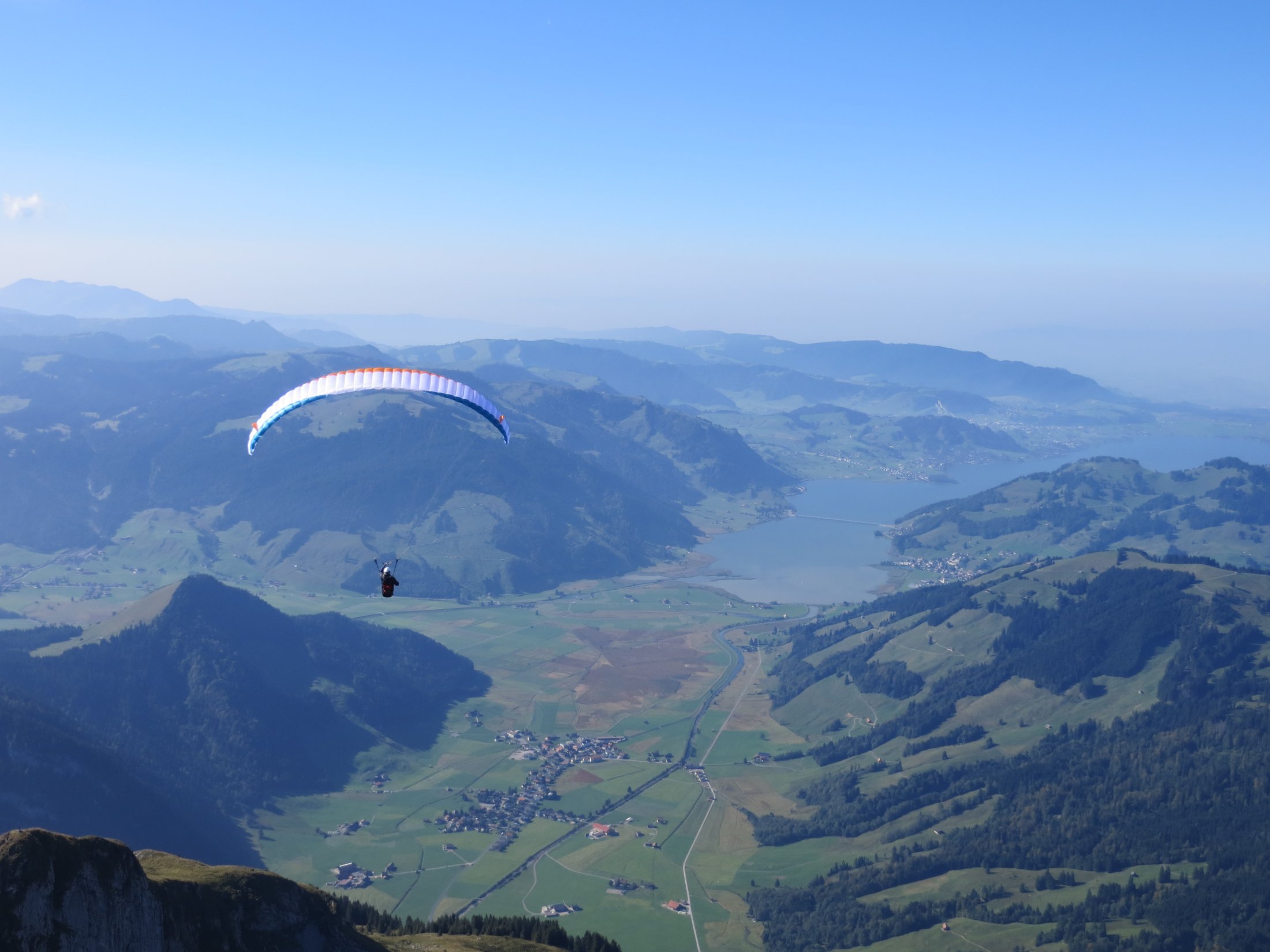 Es folgt die Kür. Wir genossen flotte Semptemberthermik, konnten den Gipfel überhöhen und über Stockrain (1411 m) zum Landeplatz in Euthal (Unterschweig 891 m) gleiten und direkt am Sihlsee landen. Zu beachten gilt es den an manchen Tagen ausgeprägten Talwind. Von da weisen die roten Sonnenschirme den Weg zum Gaden und Landebier. Dort hält das Postauto (Euthal Höhport) und bringt einem zurück nach Einsiedeln. Alternative: Die ganze Sihlebene ist ein einziger Landeplatz, sollte es nicht bis nach Euthal reichen.