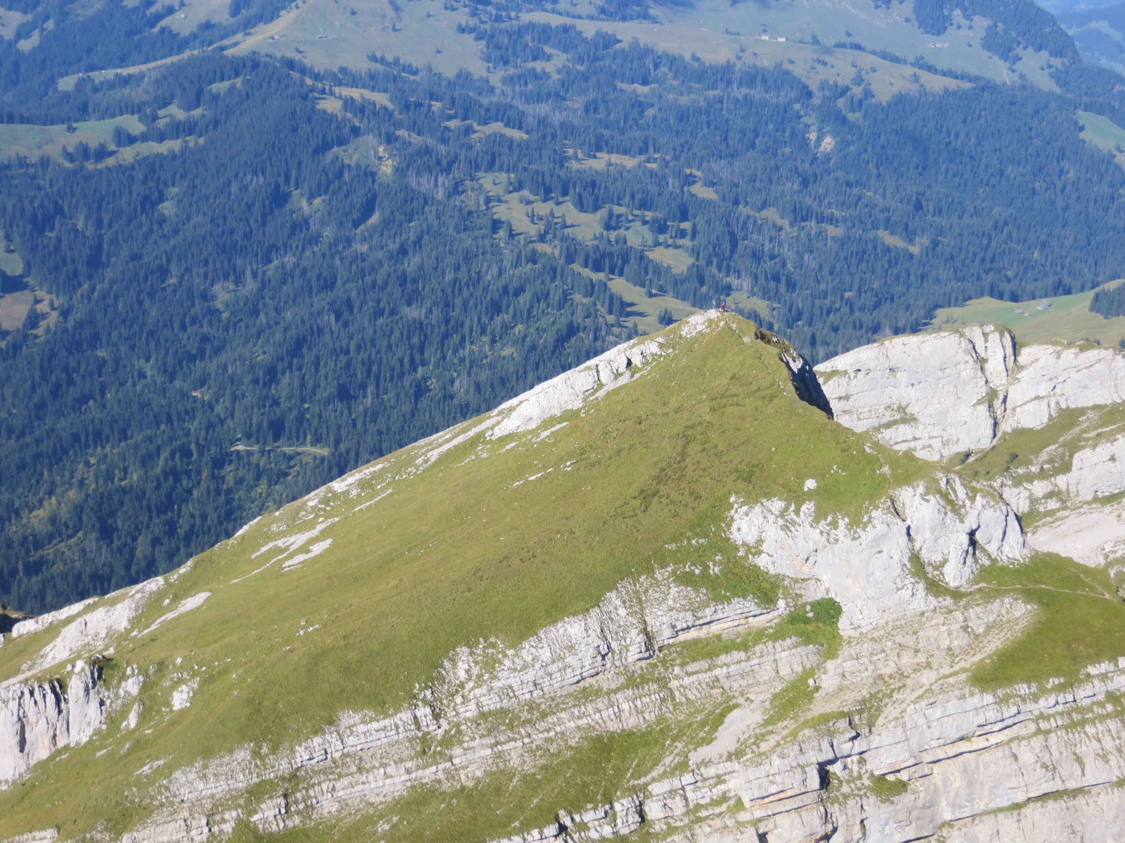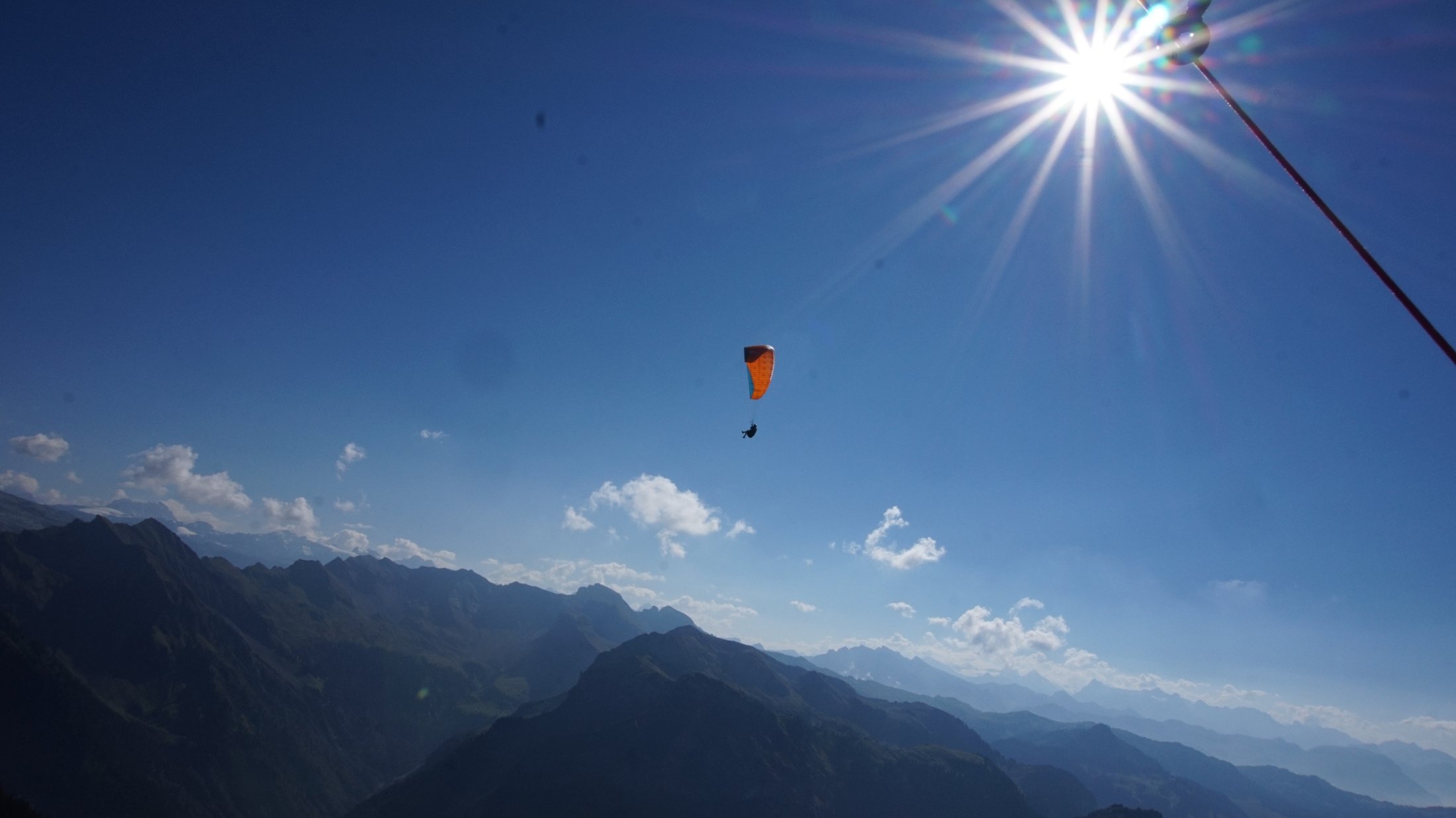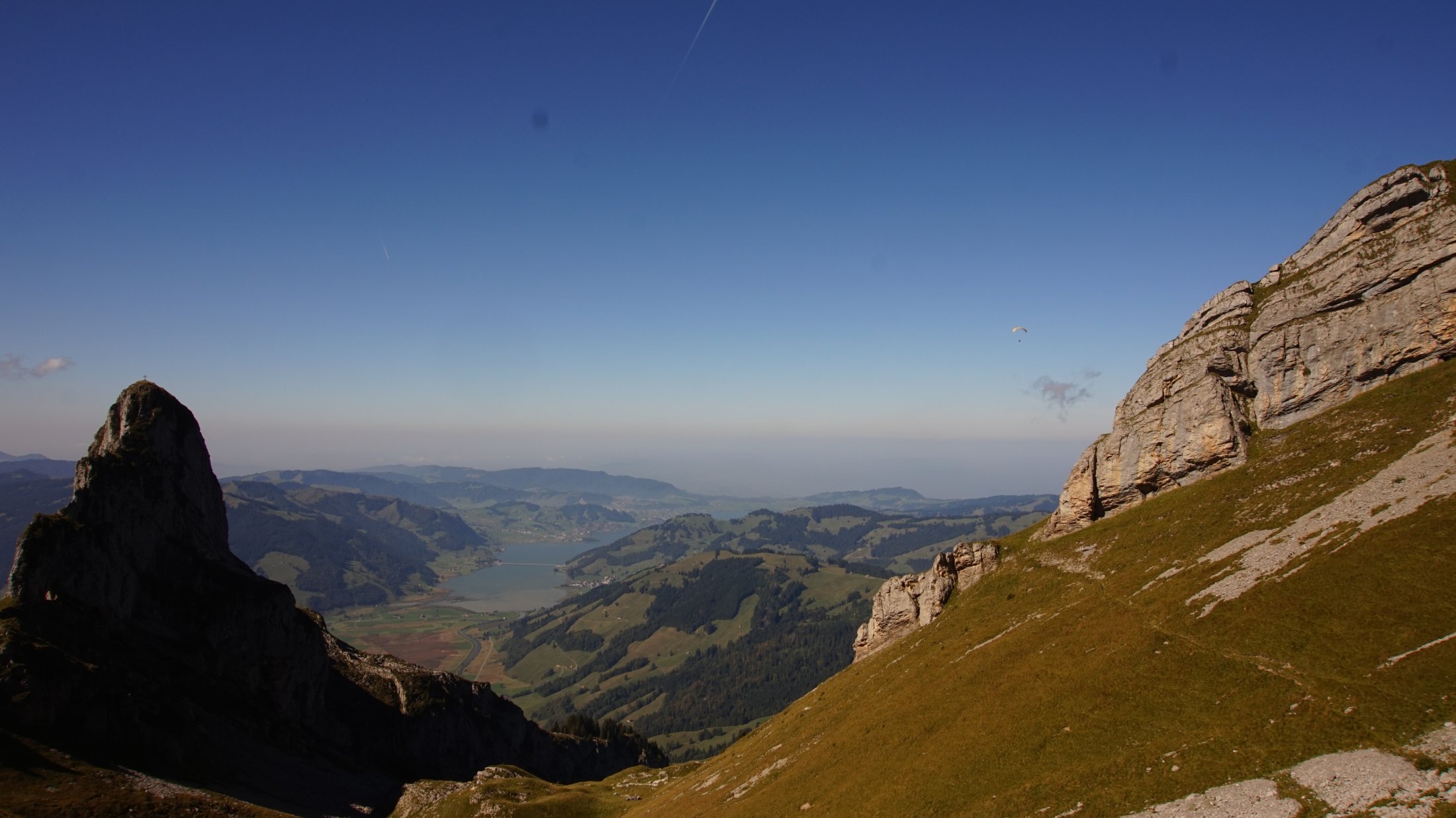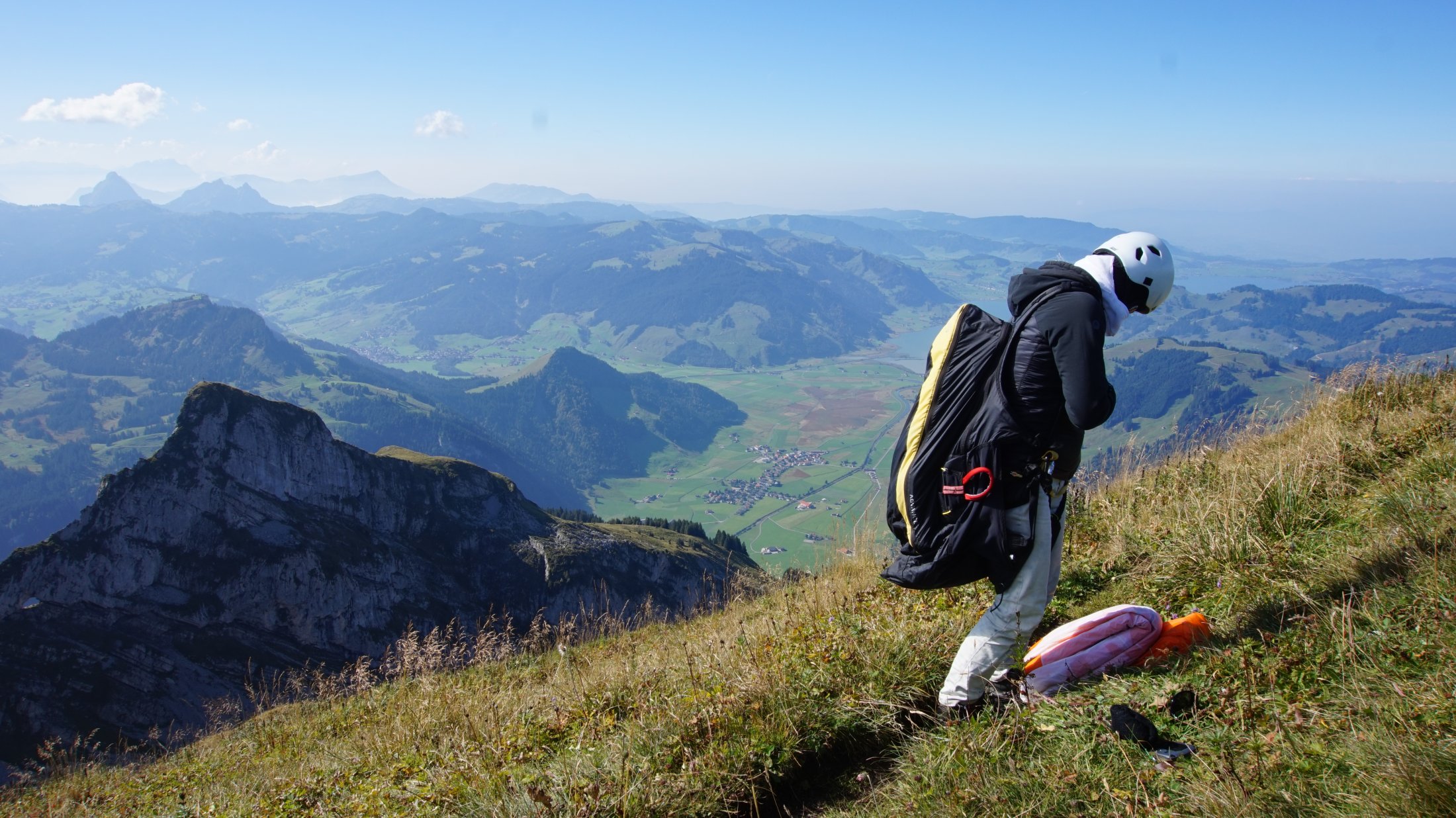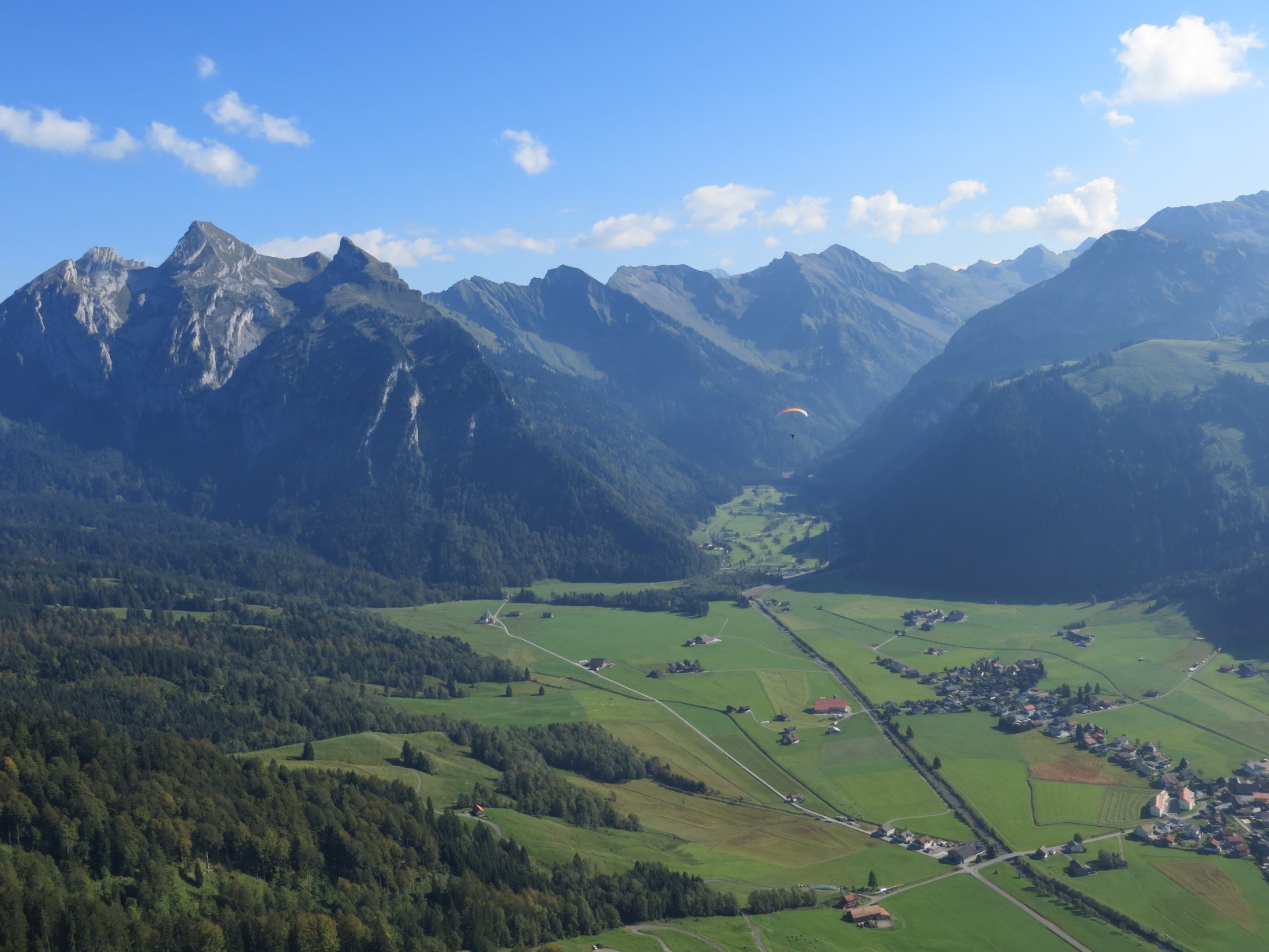 Es folgt die Kür. Wir genossen flotte Semptemberthermik, konnten den Gipfel überhöhen und über Stockrain (1411 m) zum Landeplatz in Euthal (Unterschweig 891 m) gleiten und direkt am Sihlsee landen. Zu beachten gilt es den an manchen Tagen ausgeprägten Talwind. Von da weisen die roten Sonnenschirme den Weg zum Gaden und Landebier. Dort hält das Postauto (Euthal Höhport) und bringt einem zurück nach Einsiedeln. Alternative: Die ganze Sihlebene ist ein einziger Landeplatz, sollte es nicht bis nach Euthal reichen.