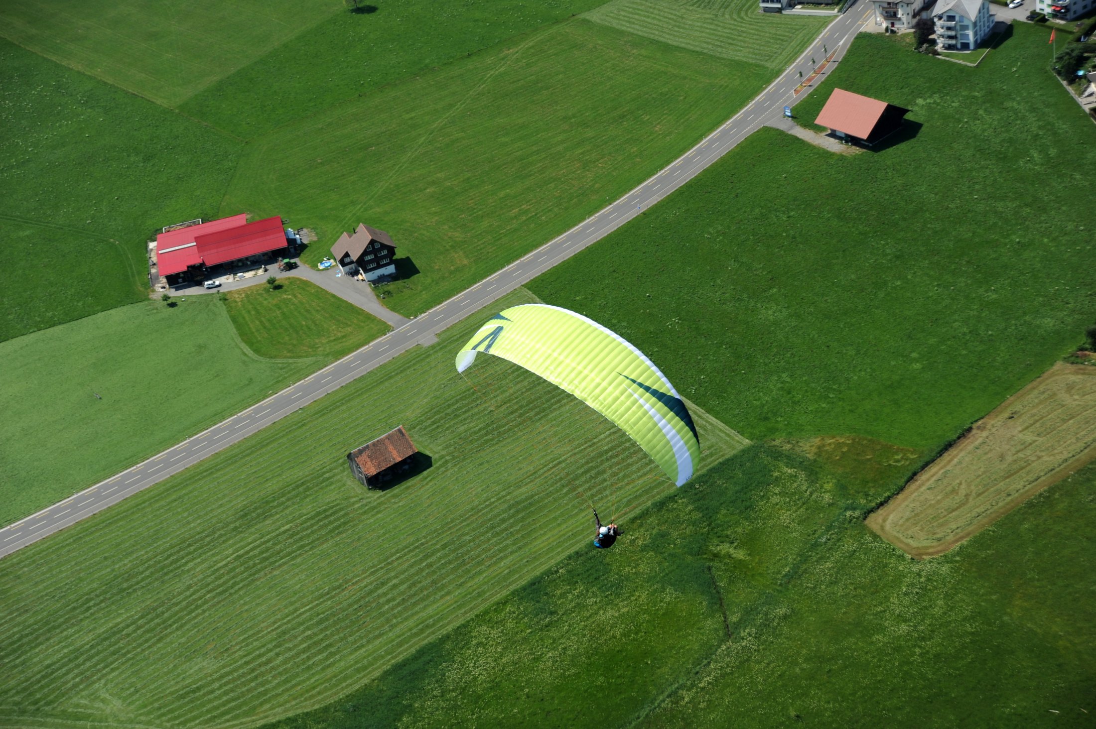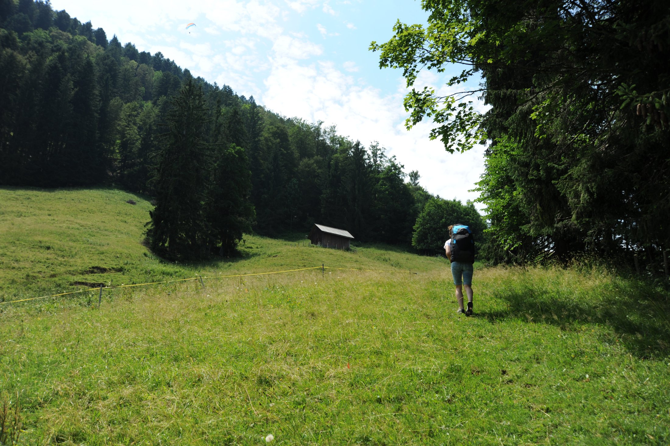 Kurze Wanderung. Ab Schützenhaus der Hauptstrasse entlang taleinwärts und nach ca. 150 m rechts weg (über Landeplatz) auf Weideweg den Hang. Zwei Viehtore müssen passiert werden, dann ca. 300 m auf nicht immer gut sichtbarem Wiesenpfad grad den Hang hoch zum Waldrand. Ab da ist der Weg gut markiert. Den unteren Startplatz passieren und wieder rein in den Wald. Über Punkt 1178 und Unterhummel zum oberen Startplatz hoch (auf ca. 1360 m), Windsack und Infotafel vorhanden.