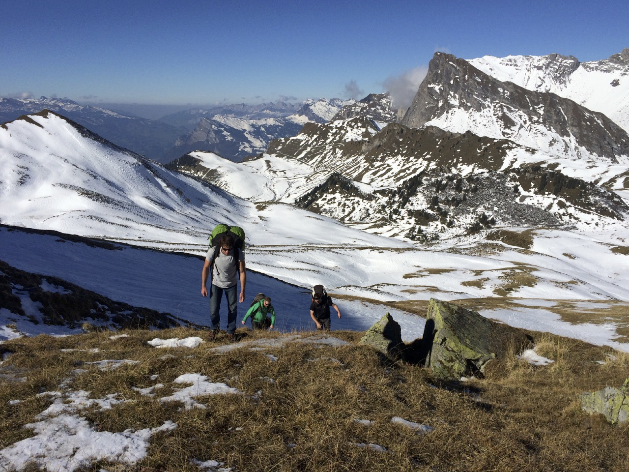 Direkt ab dem Gipfel in nach N, mittelsteil Wiese, eher kleinräumig, mittelschwer. Nach S auf Nebengipfel (2350 m), grosse Flur, einfach.