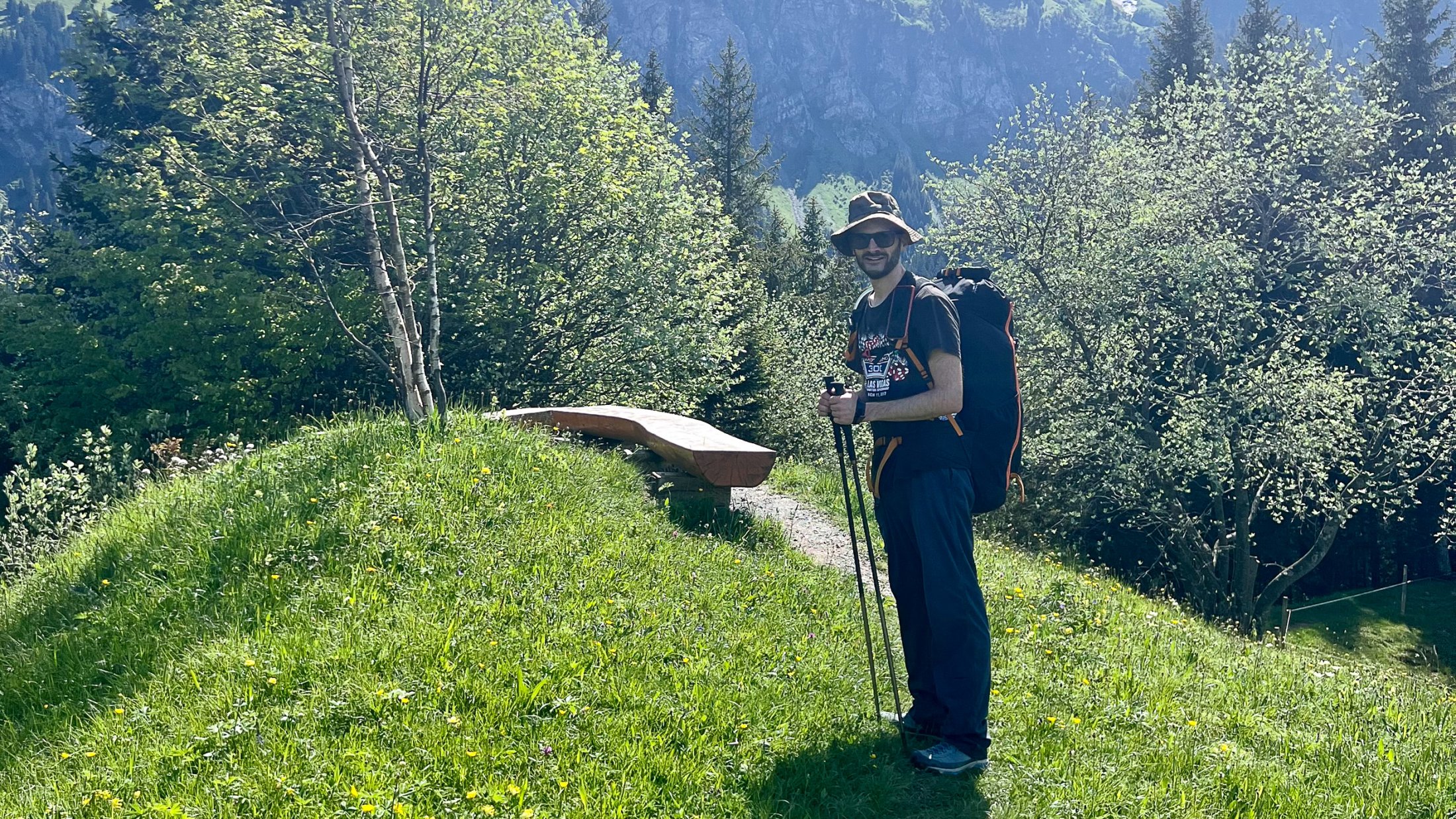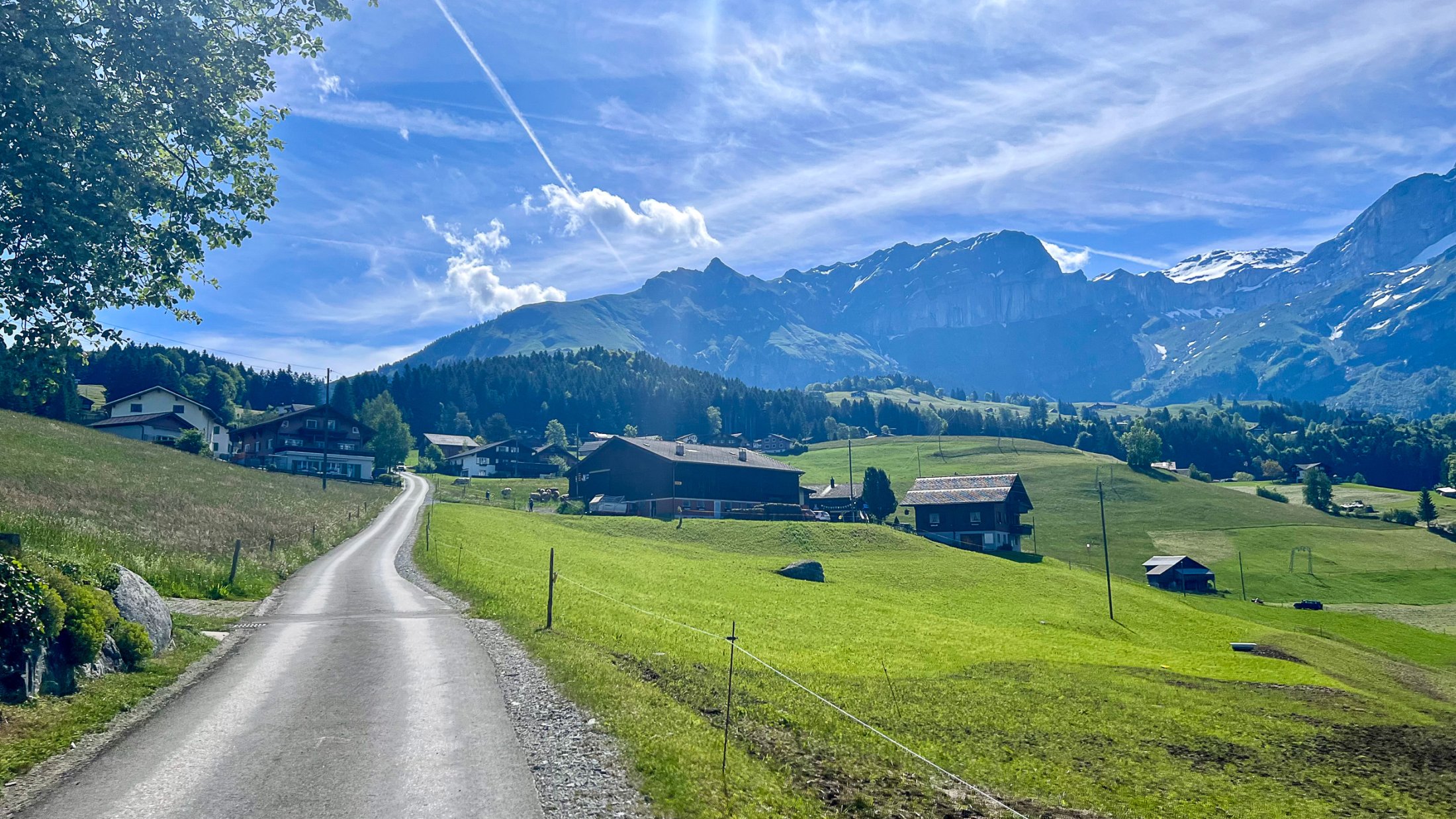 Die ersten 600 Höhenmeter von Schattdorf bis zum Haldi lassen wir uns bequem von der Luftseilbahn tragen. Sobald wir die Bergstation erreicht haben, ist unser Ziel bereits in Sicht und wir folgen dem schmalen Strässchen für einen halben Kilometer in östlicher Richtung. An einem Stall mit zahlreichen Wegweisern biegen wir nach links ab und setzen unseren Weg fort. Der Wanderweg, der uns durch malerische Wäldchen, über blühende Wiesen und kleine Strässchen führt, weist eine moderate Steigung auf. Immer wieder erhaschen wir einen Blick auf den markanten Zacken des Wängihorns, der uns mit jedem Schritt ein Stück näher kommt.