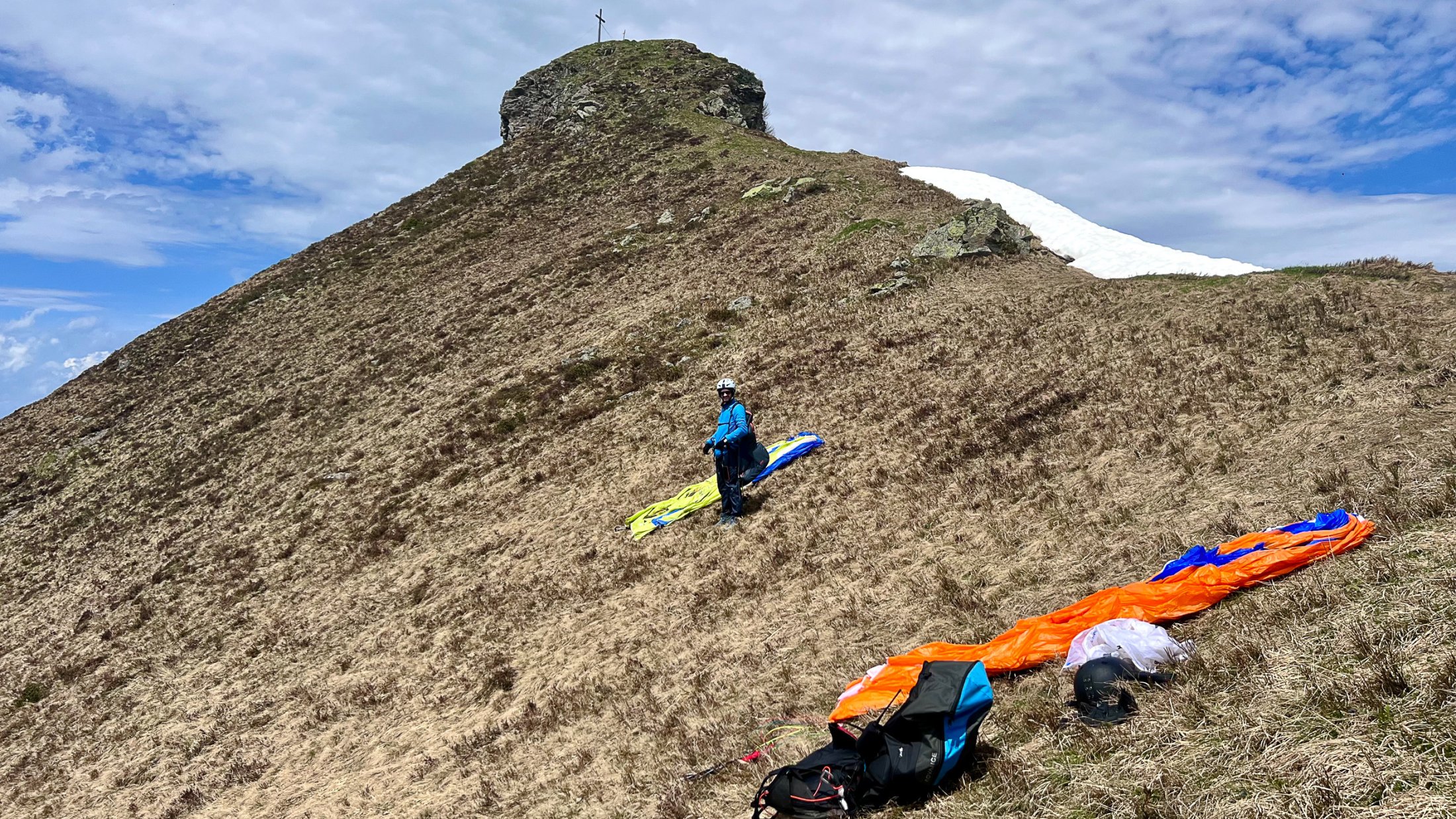 Man steigt die letzten paar Meter vom Gipfel wieder ab und findet dort eine WSW ausgerichtete, mittelsteile Wiese, auf der es sich bei West- oder Südwestwind einfach starten lässt.