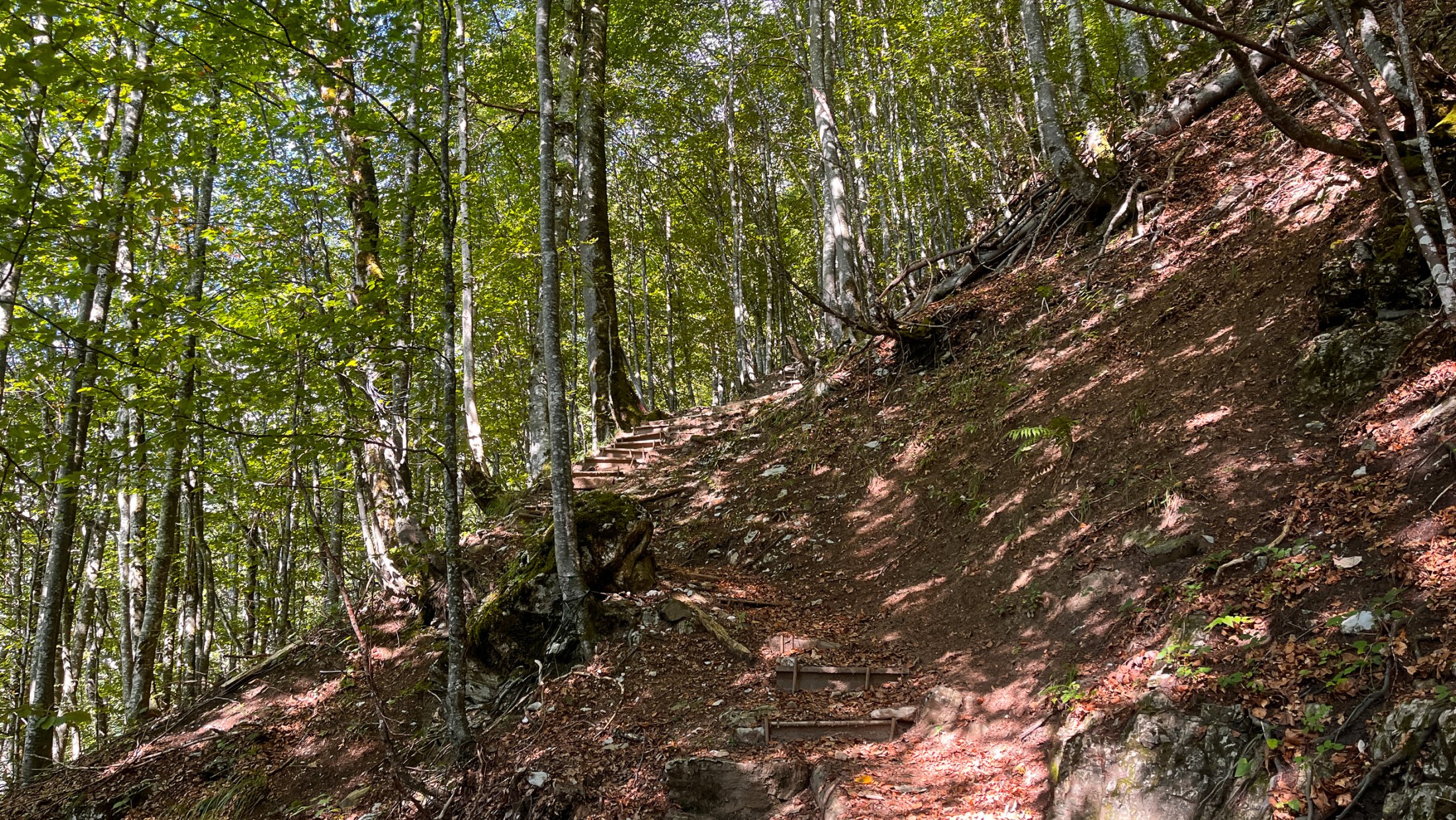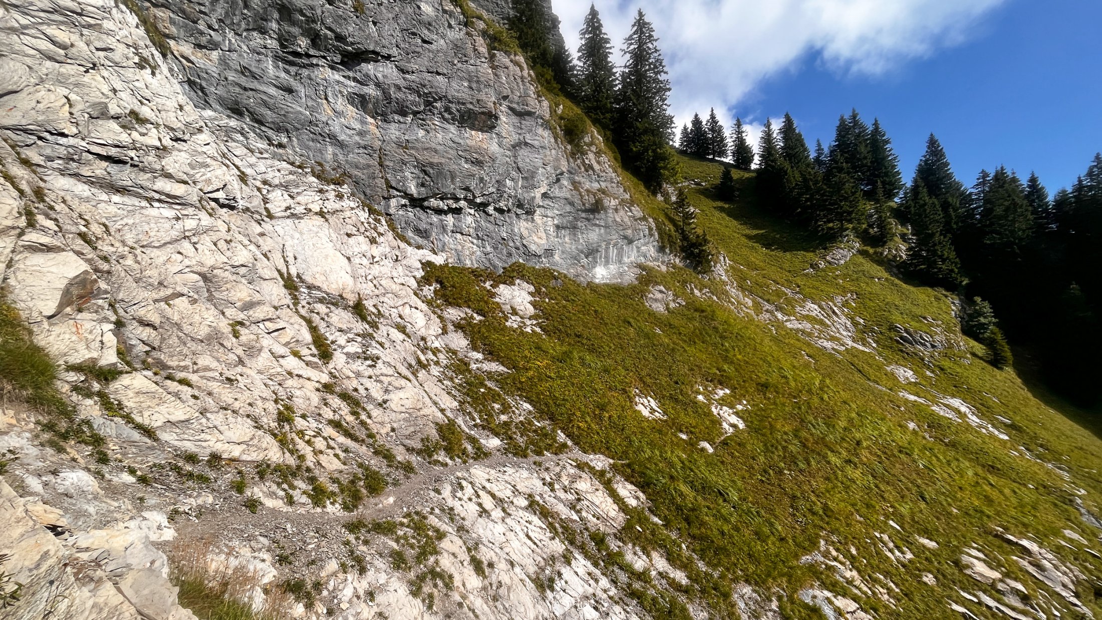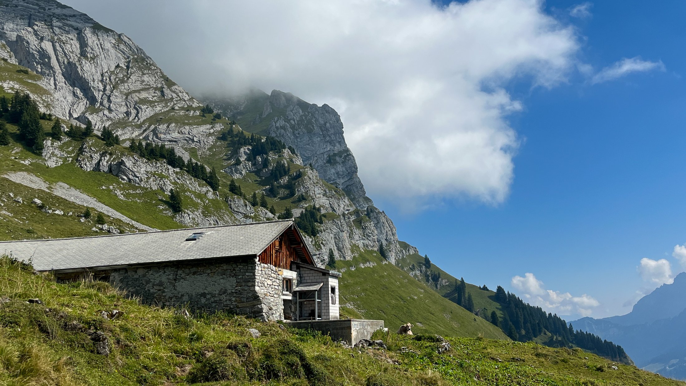 Um einige Höhenmeter zu sparen, wählen wir den Aufstieg vom Klöntal über den Wiggis.Von der Bushaltestelle Rhodannenberg geht es ein paar Meter die Straße hinunter, wo links ein Pfad über die Wiese zur dahinter liegenden Alpstrasse führt. Der Weg zur Auerenalp ist nicht als Wanderweg ausgeschildert, aber in sehr gutem Zustand und gut begehbar. Die Spur führt zunächst steil über Wiesen und durch Wald bis zur Wegspur, die in den Wiesen nicht immer gut sichtbar ist, aber man kann sich eigentlich nicht verlaufen. Wieder durch etwas bewaldetes und steiles Gelände erreicht man über einige Stufen Stögg 1270m. Am Brunnen kann man seine Trinkflasche mit herrlichem Quellwasser auffüllen!