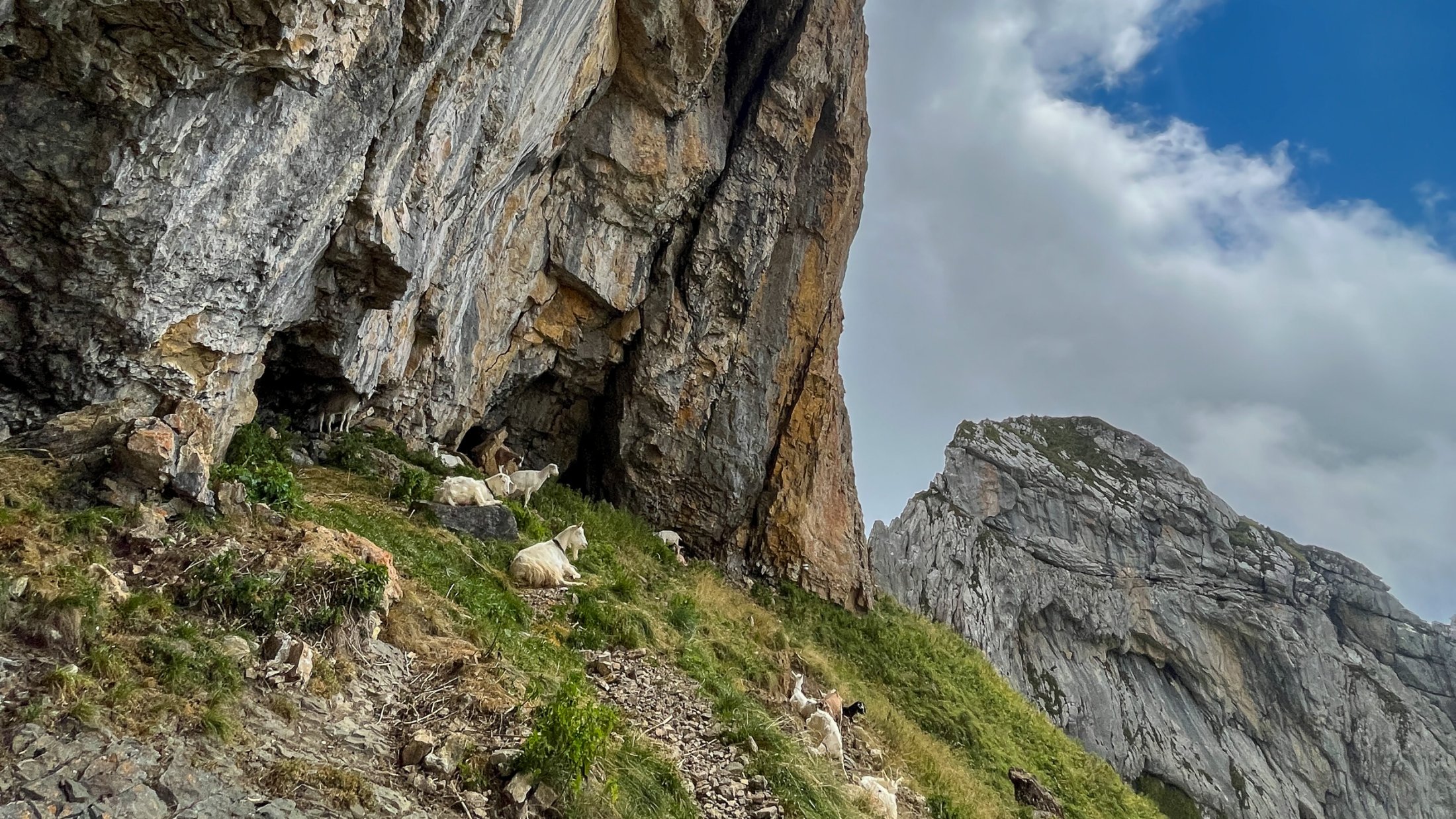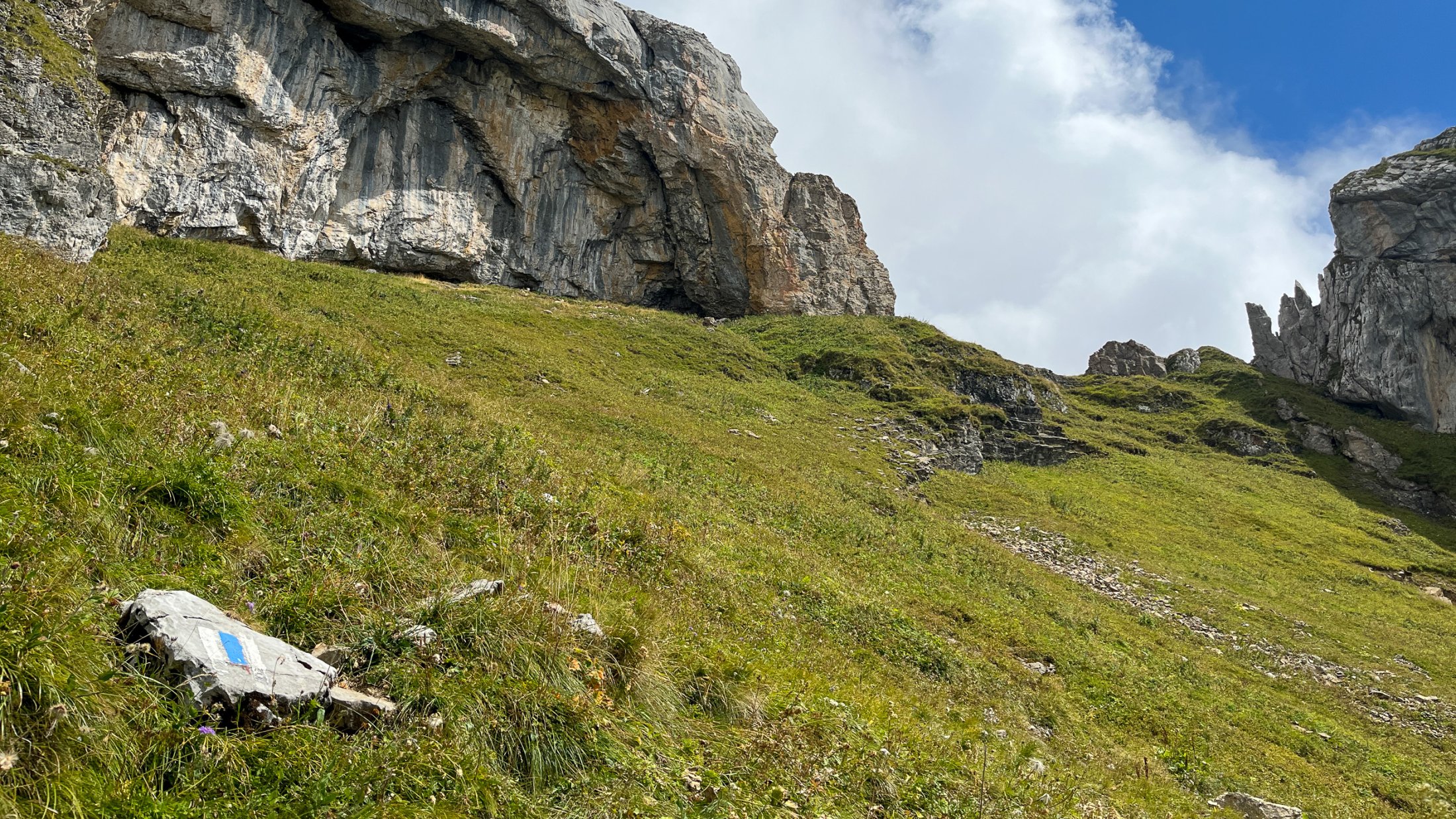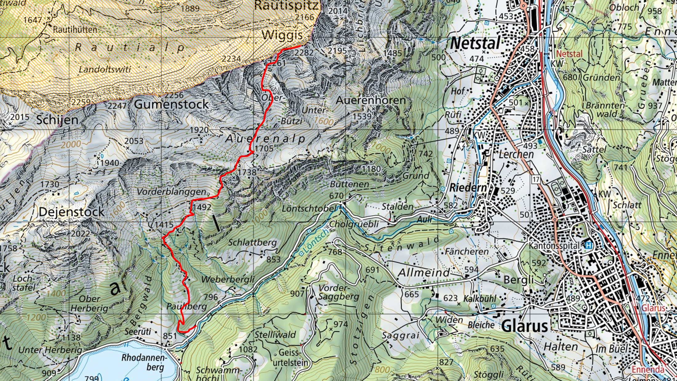 Von Stögg aus erreichen wir über Schwamm eine kleine Querung "Heulöchli" (T3), die aber leicht zu bewältigen ist. Nach ein paar weiteren Höhenmetern erreichen wir die Auernalp, wo wir am Brunnen unsere Trinkflaschen wieder auffüllen können. Hier treffen wir auch auf den offiziellen Wanderweg von Netstal her. Wir folgen dem blau-weiss markierten Wanderweg steil hinauf bis zu den überhängenden Felsen, denen wir folgen und durch das Tor auf den Gipfelgrat verlassen.