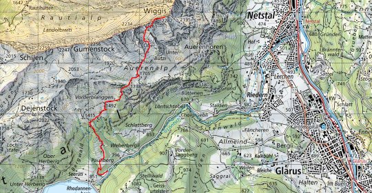 Variante 2: Es kann sein, dass sich durch den thermischen Aufwind vor dem Startplatz Wiggis Wolken bilden. In diesem Fall kann allenfalls auf dem benachbarten Rautispitz gestartet werden. Achtung: Der Weg vom Wiggis zum Rautispitz ist exponiert, aber gut gesichert. Sowohl der Rautispitz als auch der Wiggis liegen am Rand des Jagdbanngebietes. Auf dem Rautispitz kann man ganz am östlichen Rand auf dem Gratweg starten und dann direkt nach Osten über die Felswand gleiten (informationen einholen zu der Grenze des Jagdbanngebietes!).