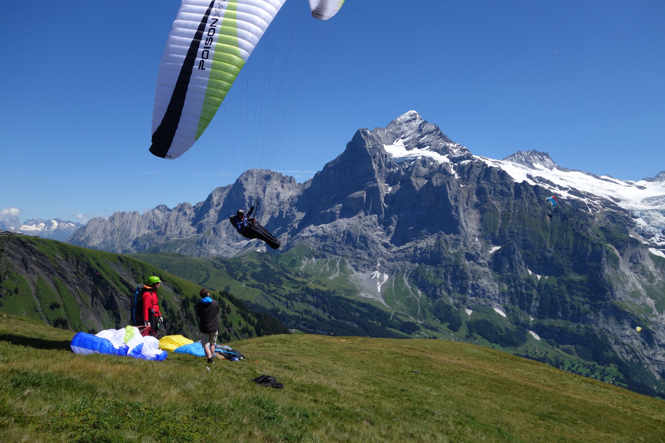 Bei meinem ersten Flug dachte ich schon beim Aufziehen, spätestens aber nach den ersten Metern in der Luft: den Schirm mag ich. Ein Flügel den man sofort versteht, angenehm weiche Steuerdrücke im oberen Drittel hat und ein präzises Handling mit eine solider Kappe vereint. Ob bei starkem Wind in der Haute Provence oder bei leichtem Abwind bei uns in den Schweizer Alpen, der Poison macht vom Start weg eine gute Falle. Die Kappe füllt sich immer gleichmässig, steigt sofort und schiesst nicht. Starten ist bei allen Bedingungen sehr einfach.