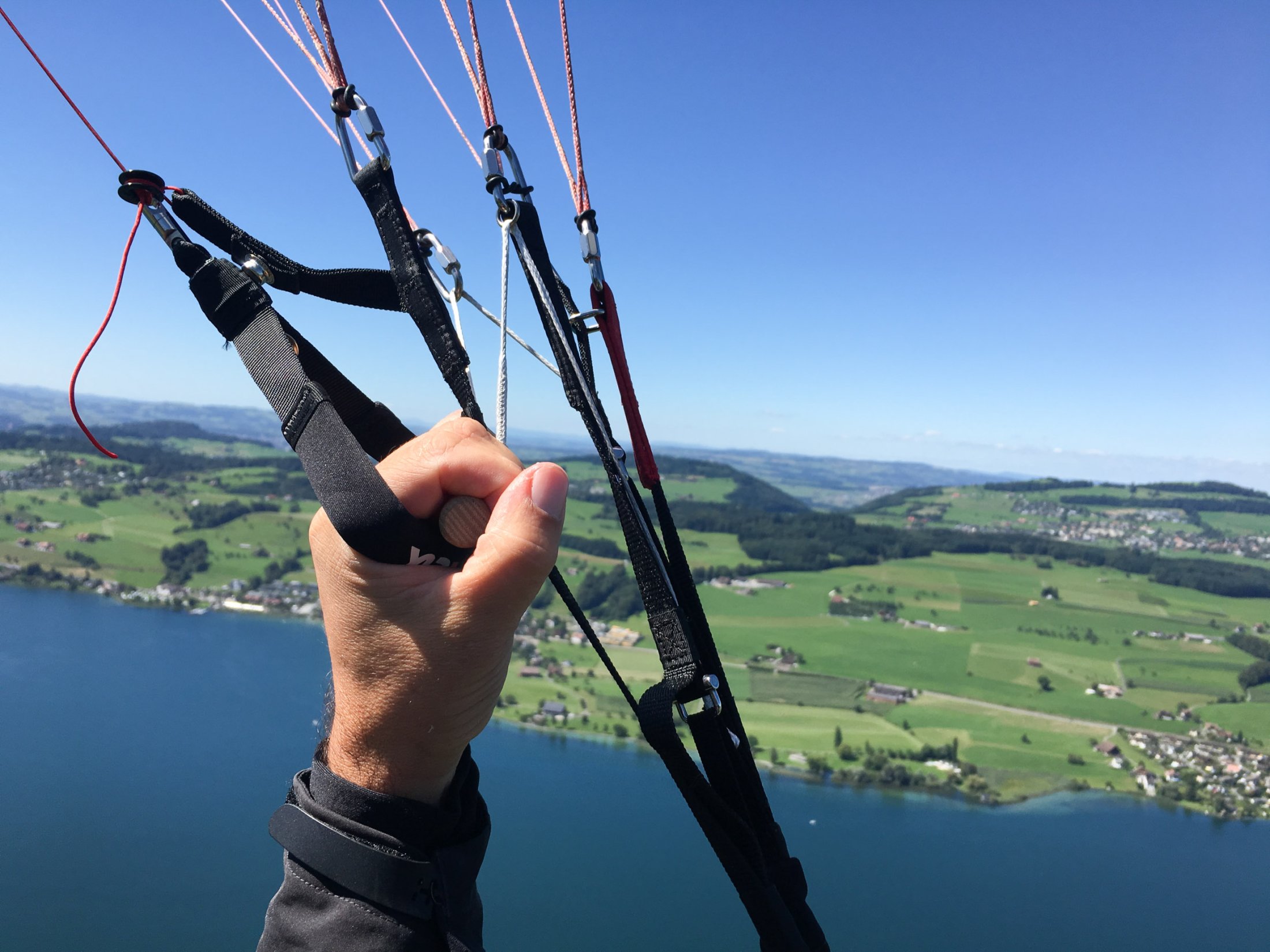 Im Flug zeigt der Hochleister seine wahre Stärke. Viel Leistung und eine stabile Kappe die, vor allem auch im beschleunigten Flug in turbulenter Luft, gut kontrollierbar ist und auch schwaches Steigen immer mitnimmt. Über die Holzhandles an den C - Gurten führt man den Flügel präzise, durch die Anlenkung auch auf die B - Ebene kommt schon fast zweileiner Feeling auf: Das Profil wird nicht verkrümmt wie bei anderen Dreileinern, nur der Anstellwinkel verändert sich.