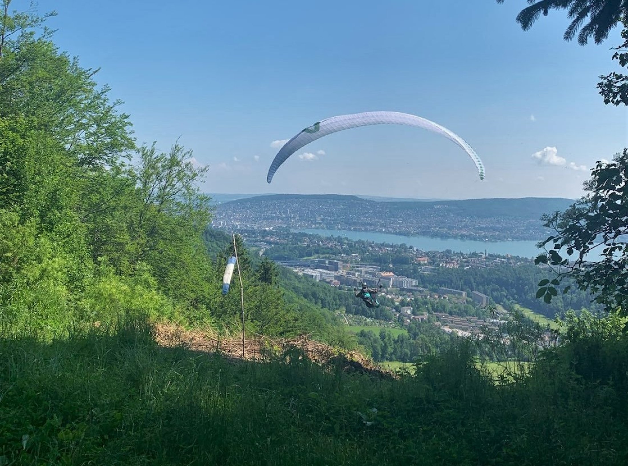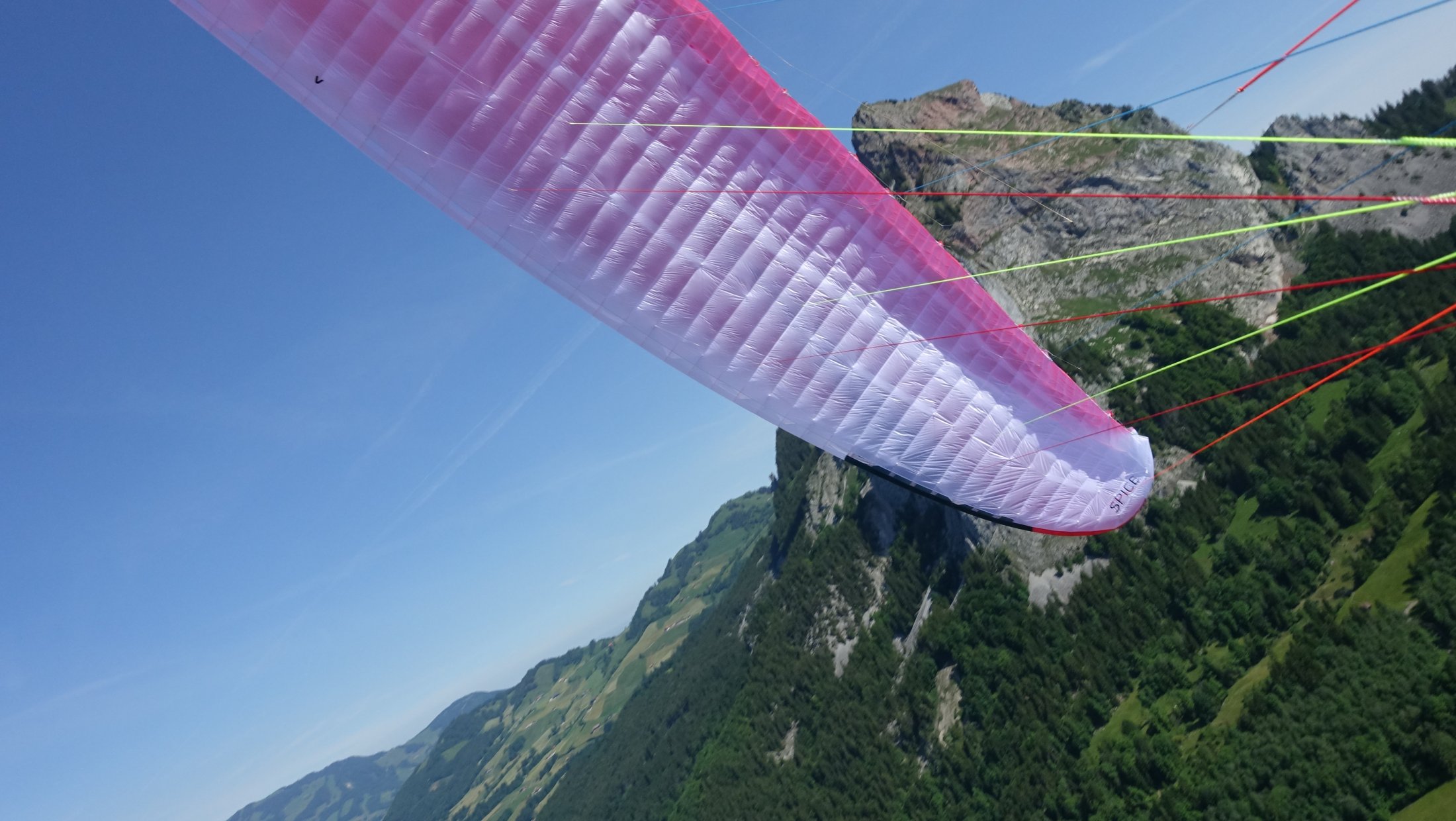 Hier kommt eine überaus positive Eigenschaft des SPICE 2 zu tragen: er lässt sich sehr flach drehen und steigt daher in schwacher Thermik sehr effizient. In starker Thermik neigt er vergleichsweise schnell zu Querlage und es braucht wohl einige Flüge Angewöhnung, um die Steigqualitäten des SPICE 2 auch in solchen Verhältnissen voll auszuschöpfen. Wie für Schirme aus dem Hause SKYWALK typisch, so beisst (nickt) auch der SPICE 2 deutlich in die Thermik rein. Das gefiel uns gut.