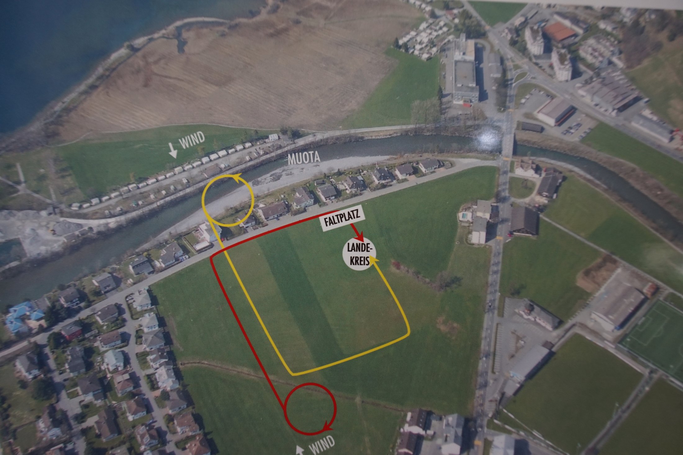 Der grosszügige Landeplatz liegt in Brunnen auf einem offenen Feld neben der Muota, unweit der Talstation. Gepackt wird an der Strasse. Bei Bise kann ab Gotterli und Schwand ebenfalls in Goldau gelandet, der Flug nach Brunnen ins Lee somit vermieden werden.