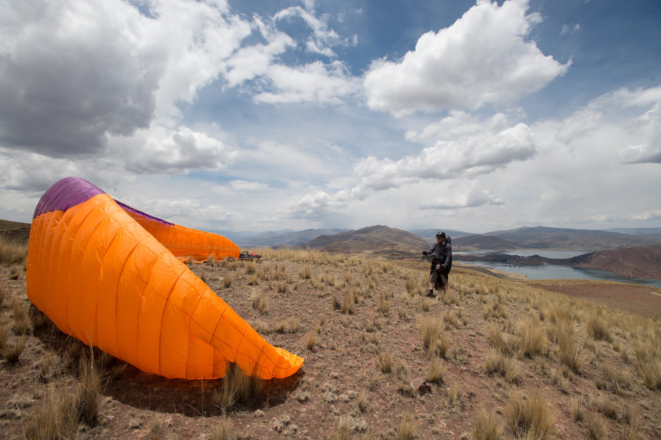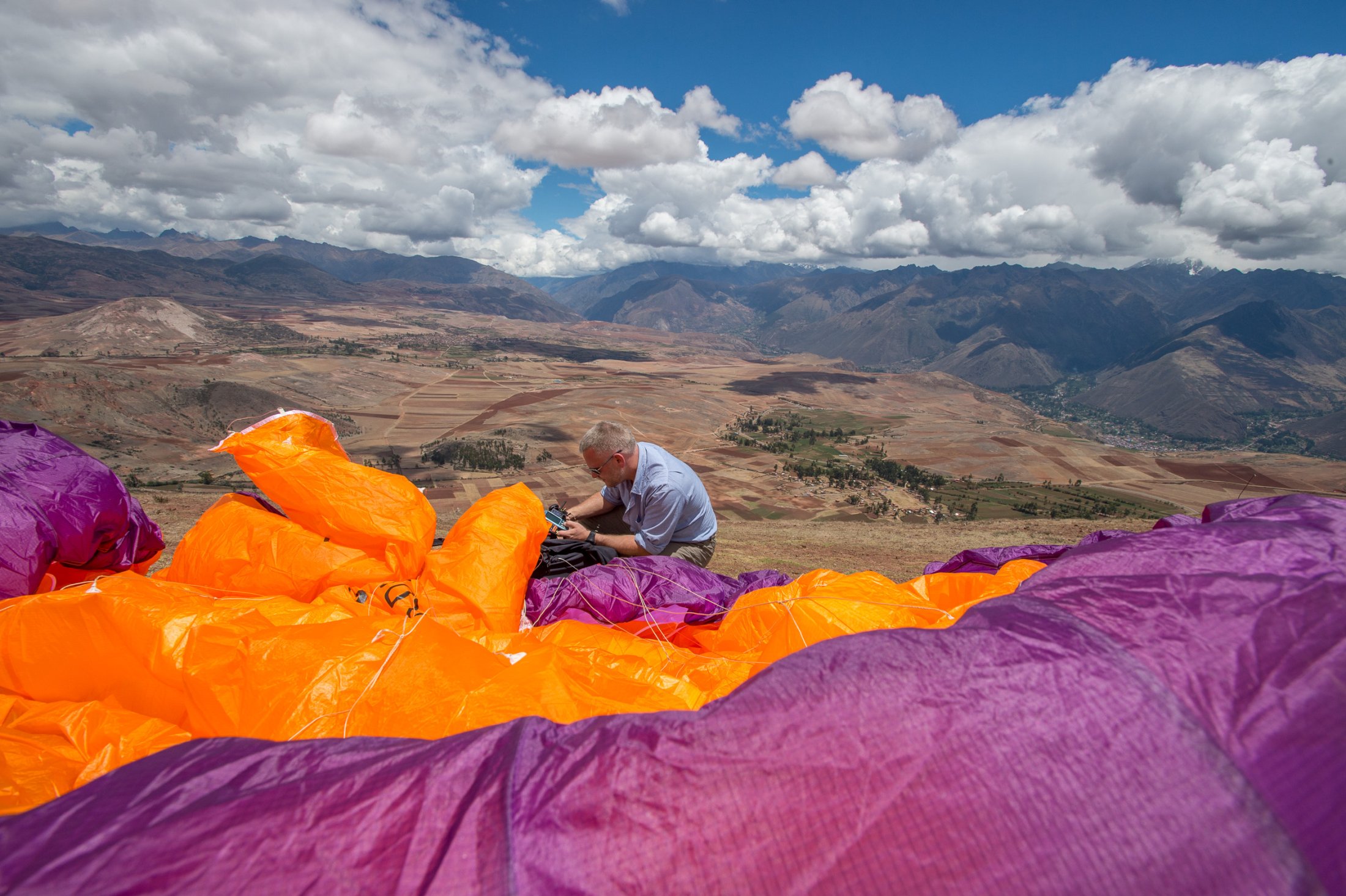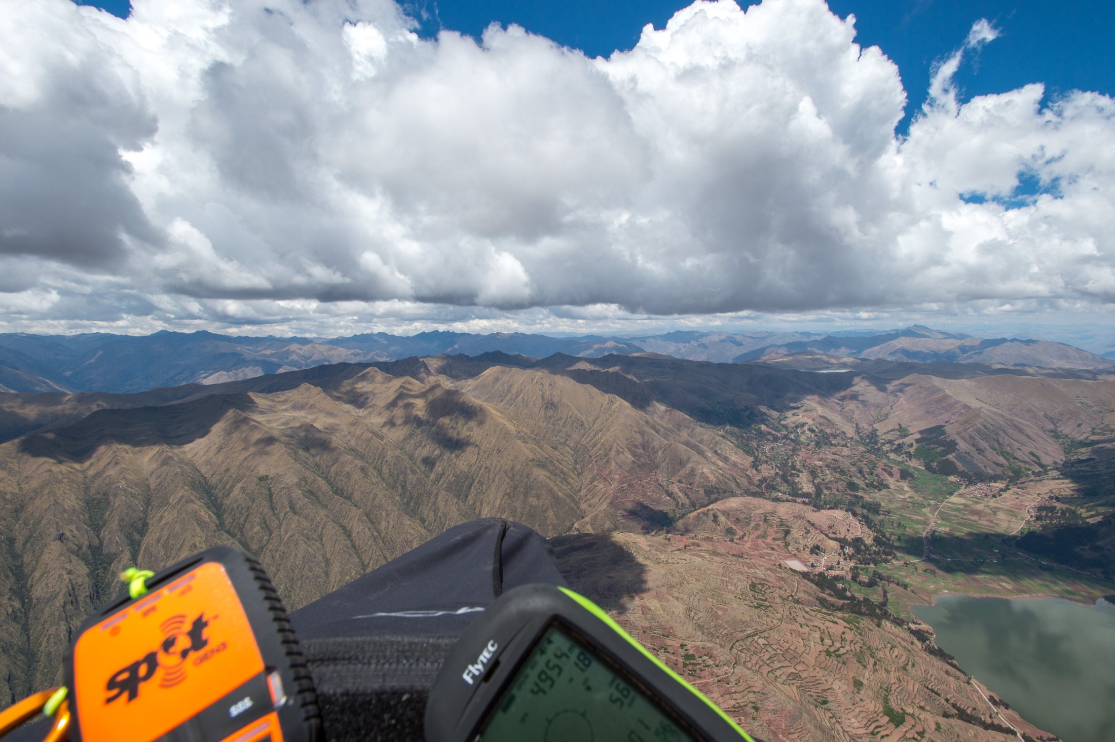 Schliesslich stehen wir frühmorgens am 23. Oktober auf 3800 Meter an unserem ersten peruanischen Startplatz, hoch über dem Urubamba-Tal. Die Luft ist dünn hier oben, und wir merken, dass wir noch nicht gut akklimatisiert sind. Die Morgenthermik lässt nicht lange auf sich warten und schon bald können wir starten. Schnell geht es hoch auf über 4700 Meter, zum Teil in starker Thermik. Ein ockerfarbener Teppich aus bewirtschafteten Feldern liegt tief unter uns, und der Blick öffnet sich weit auf die zerklüfteten Hochtäler des Valle Sagrada. Mit dem Wind im Rücken sausen wir auf Cuzco zu. Da wir jedoch unsicher sind, wie die Landschaft vor und um Cuzco herum aussehen würde und ein von dort abfliegender Airbus beeindruckend nahe in den Wolken verschwindet, landen wir nach etwas über einer Stunde nahe der Hauptstrasse. Chauffeur Luis entpuppt sich als guter Rückholer, der noch dazu eine hohe Funkdisziplin an den Tage legt: "Copia, vengo!".