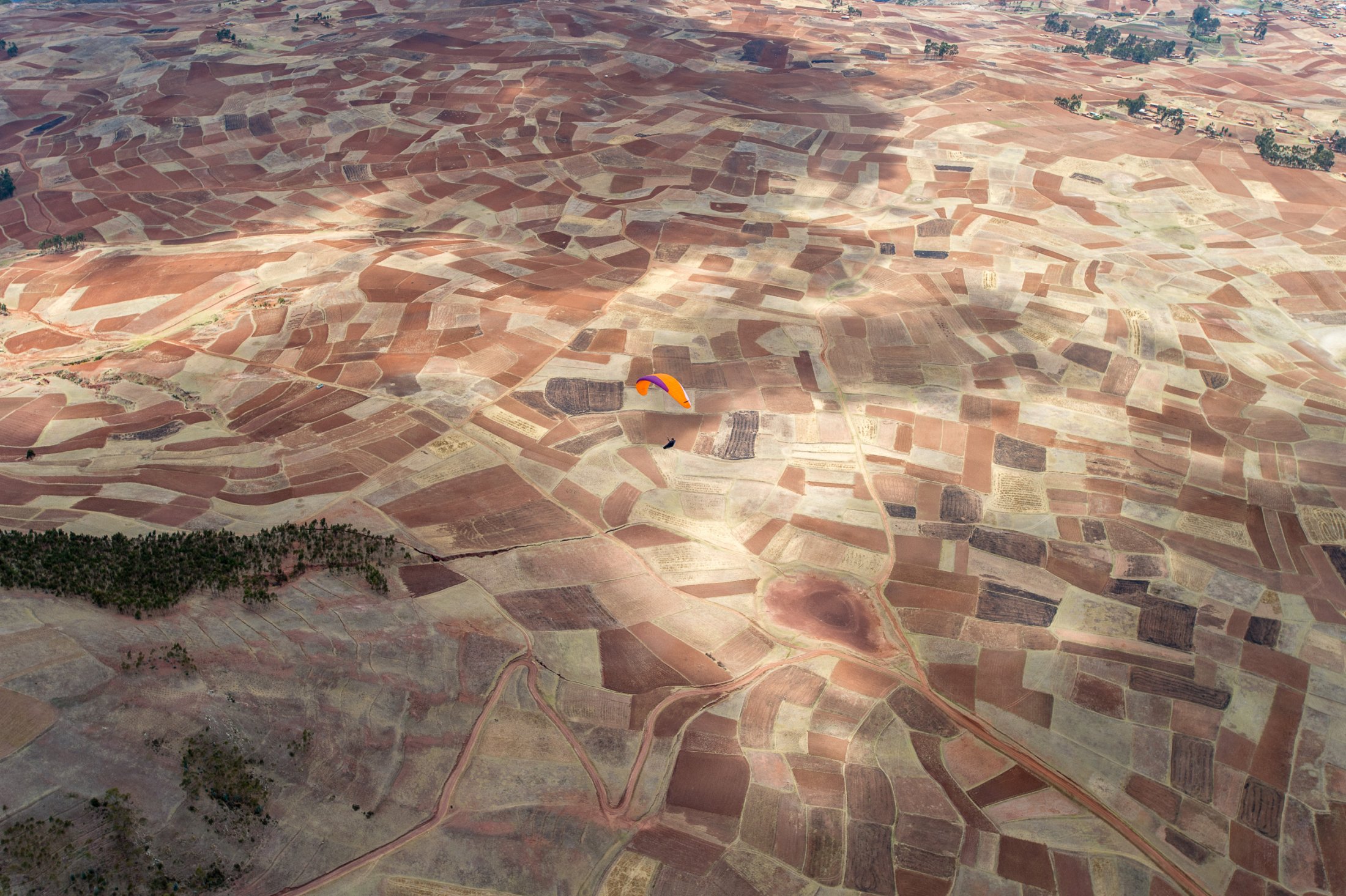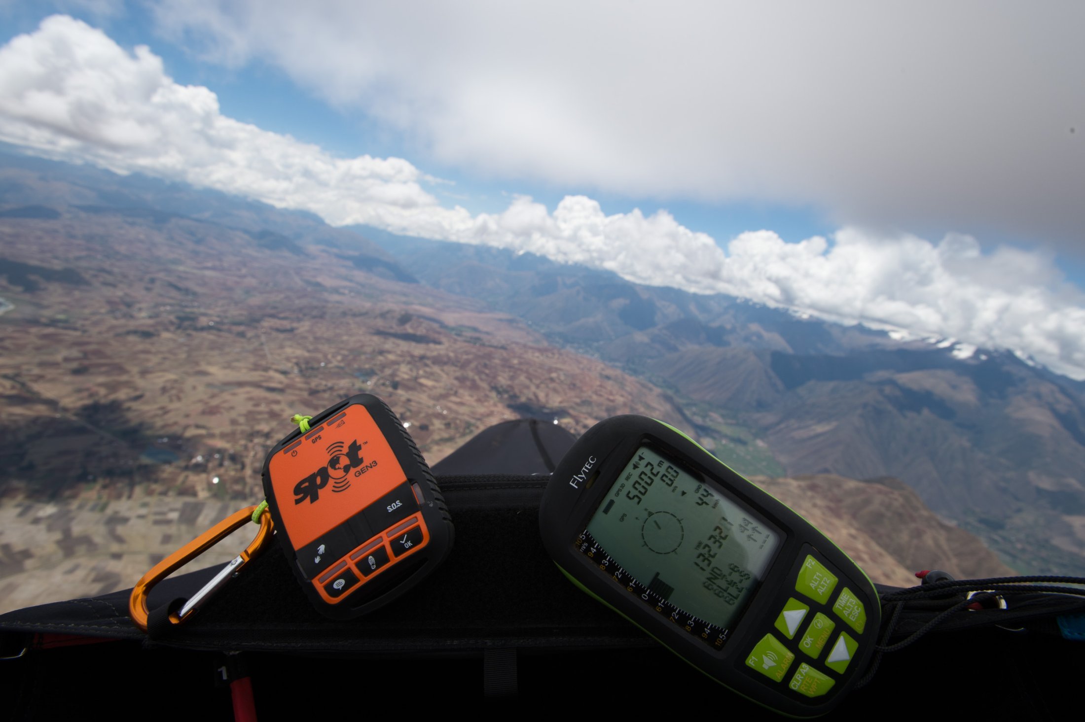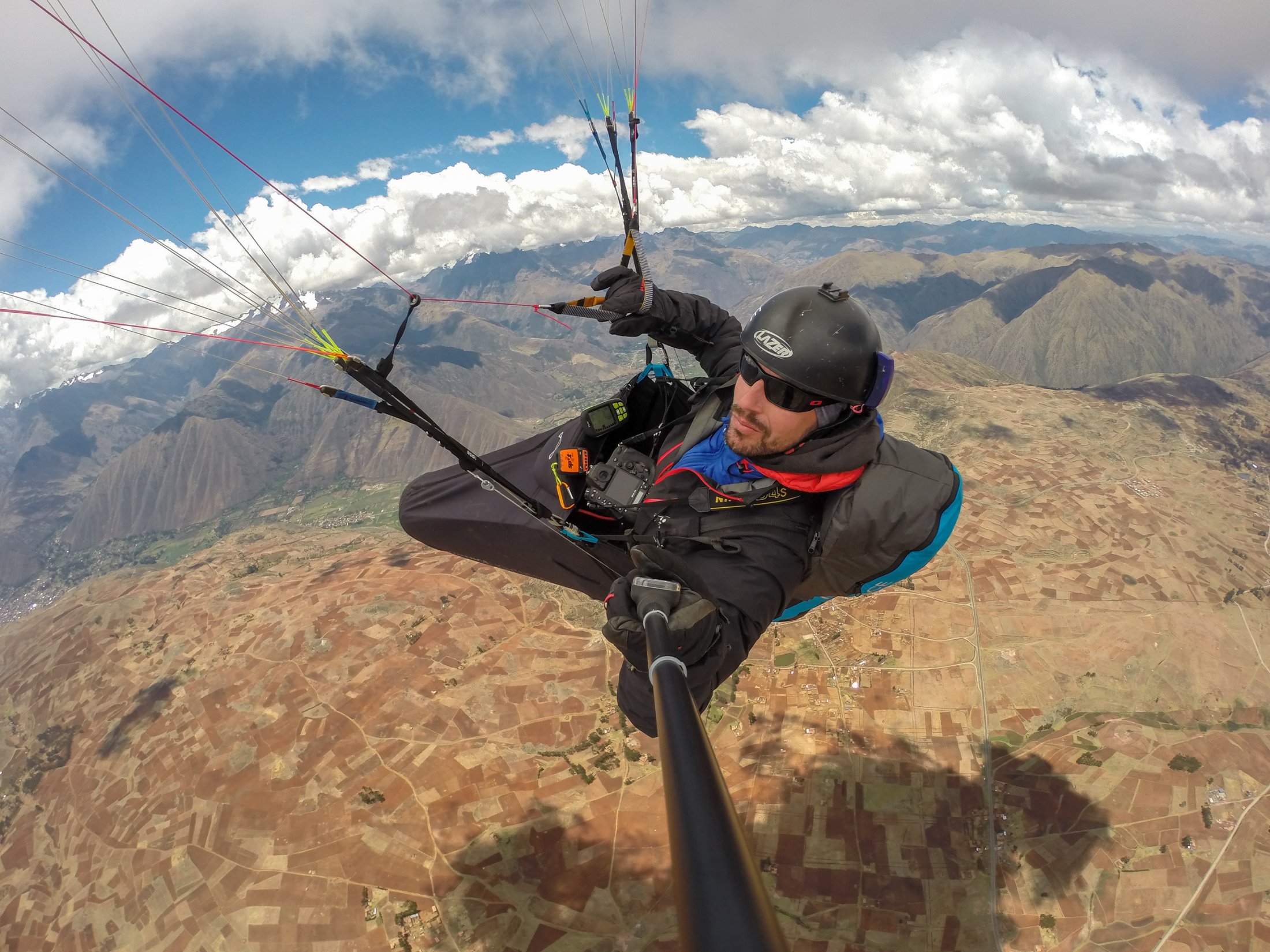 Schliesslich stehen wir frühmorgens am 23. Oktober auf 3800 Meter an unserem ersten peruanischen Startplatz, hoch über dem Urubamba-Tal. Die Luft ist dünn hier oben, und wir merken, dass wir noch nicht gut akklimatisiert sind. Die Morgenthermik lässt nicht lange auf sich warten und schon bald können wir starten. Schnell geht es hoch auf über 4700 Meter, zum Teil in starker Thermik. Ein ockerfarbener Teppich aus bewirtschafteten Feldern liegt tief unter uns, und der Blick öffnet sich weit auf die zerklüfteten Hochtäler des Valle Sagrada. Mit dem Wind im Rücken sausen wir auf Cuzco zu. Da wir jedoch unsicher sind, wie die Landschaft vor und um Cuzco herum aussehen würde und ein von dort abfliegender Airbus beeindruckend nahe in den Wolken verschwindet, landen wir nach etwas über einer Stunde nahe der Hauptstrasse. Chauffeur Luis entpuppt sich als guter Rückholer, der noch dazu eine hohe Funkdisziplin an den Tage legt: "Copia, vengo!".