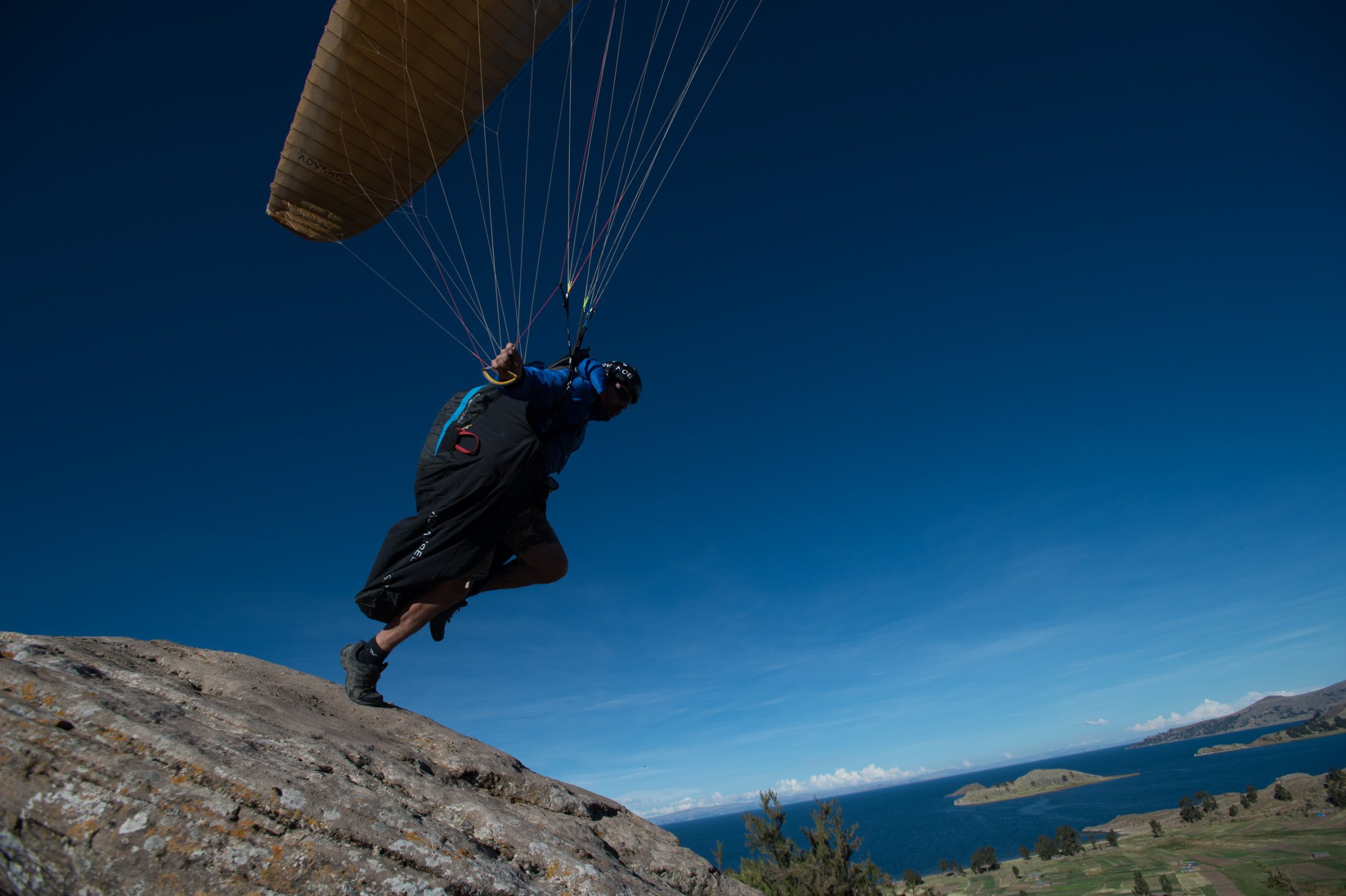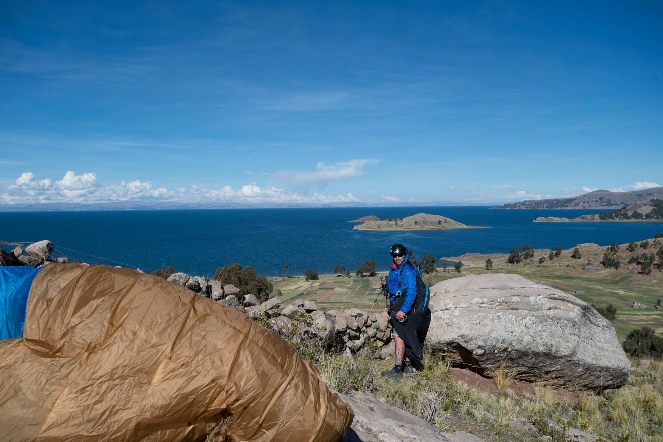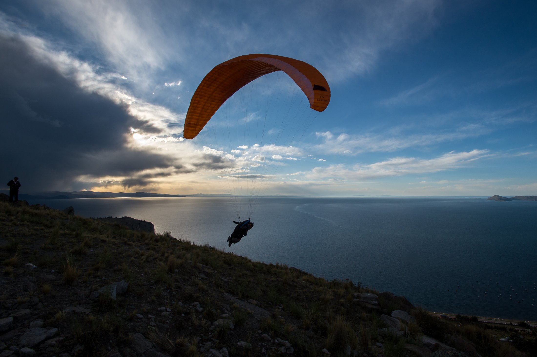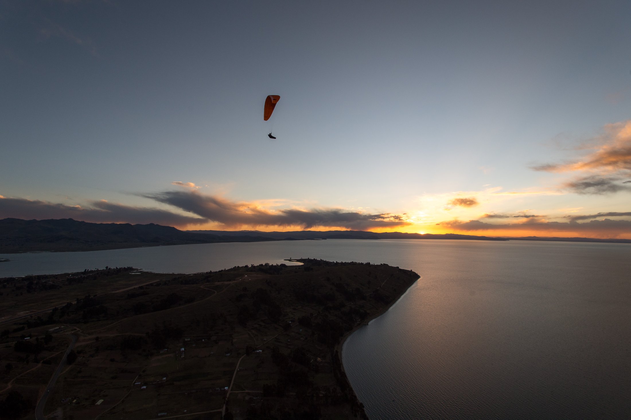 Die Reise geht weiter südwärts mit dem Etappenziel Lago Titicaca, dem grössten und höchstgelegenen Süsswassersee der Erde. Keine fünf Minuten nach der bolivianischen Grenze führt eine steile Strasse hoch zu den Antennenmasten über dem Städtchen Copacabana. Dort hinauf müssen wir. Kaum oben angelangt, heben wir ab. Die Szenerie, welche sich uns bei dieser Abendsoaring-Session bietet, ist einmalig: Im Westen sinkt die Sonne immer tiefer und schaut zwischen weit entfernten, peruanischen Gewitterwolken zu uns herüber. Nordwärts zeigt sich der Lago Titicaca in seiner ganzen, unfassbaren Grösse und bildet mit dem Horizont eine Linie. Im Osten stehen die verschneiten Sechseinhalbtausender Boliviens in der Abendsonne. Und mittendrin, hoch über Copacabana, "Los Suizos" unter ihren farbigen Tüchern. Wir überfliegen das Städtchen und setzen uns über den Cerro Calvario, den lokalen Aussichtspunkt, wo auch andere Touristen den Sonnenuntergang geniessen. In der Abenddämmerung landen wir schliesslich stilgerecht an der Copacabana Beach und sind damit definitiv in Bolivien angekommen.