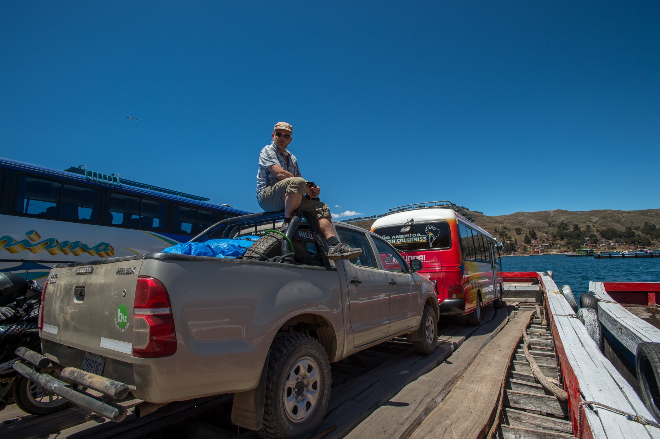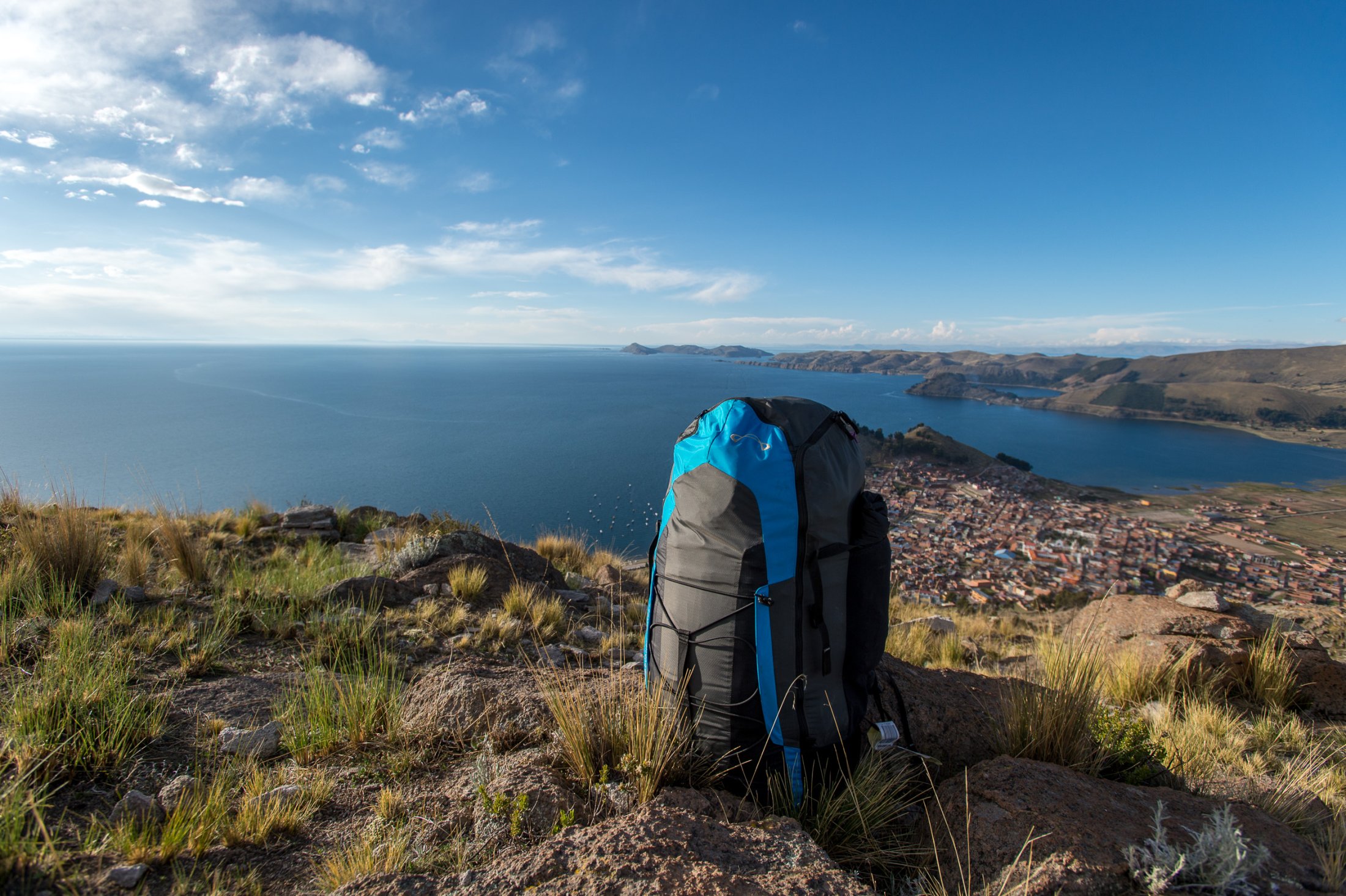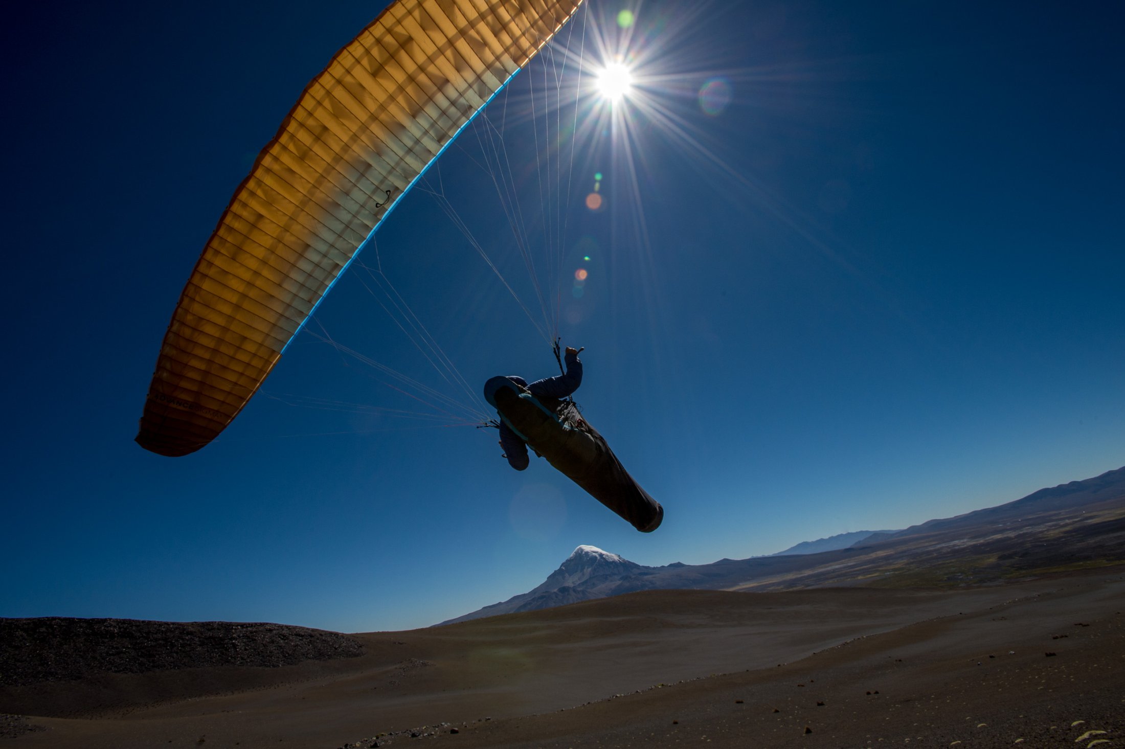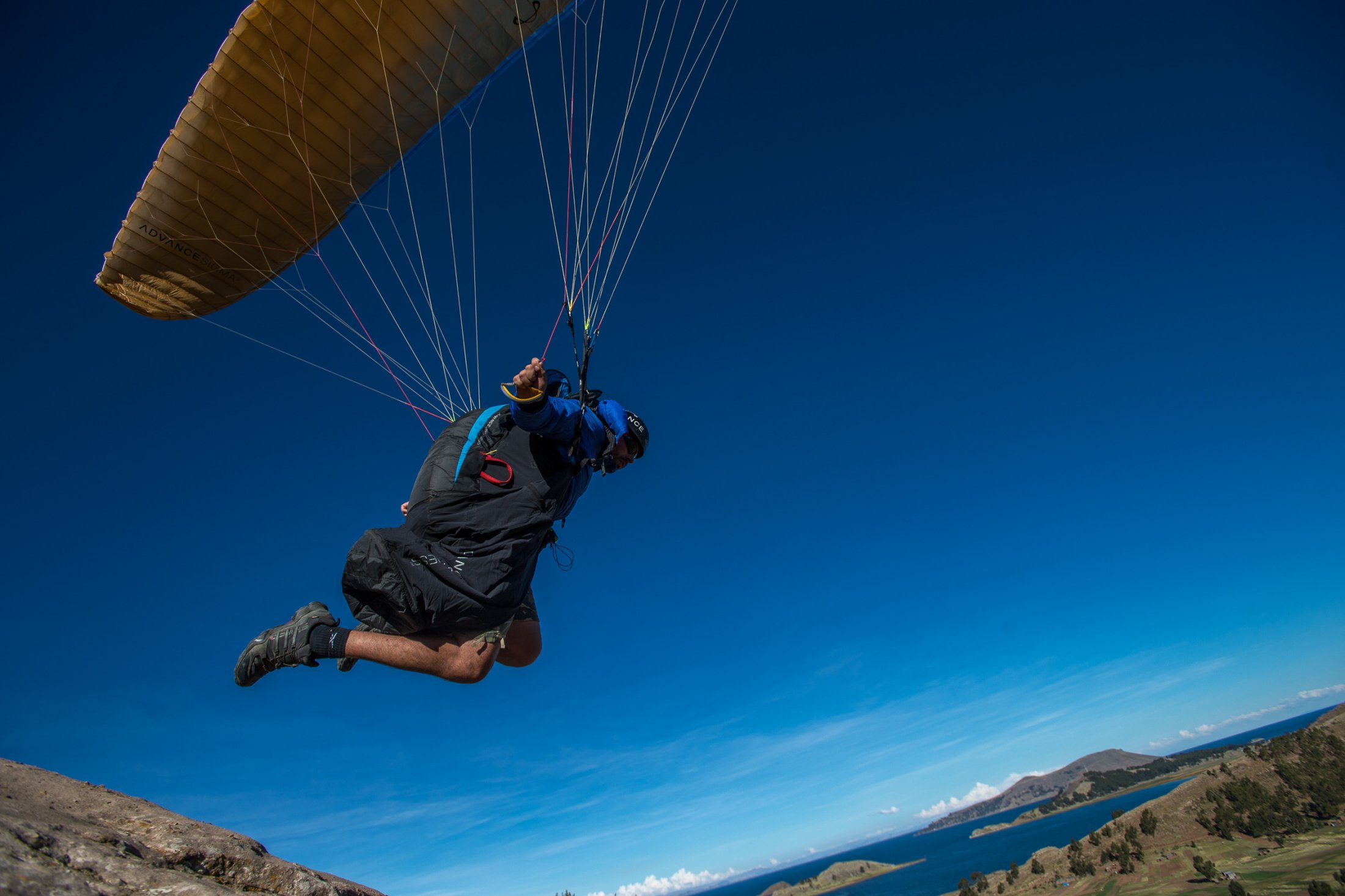 Die Reise geht weiter südwärts mit dem Etappenziel Lago Titicaca, dem grössten und höchstgelegenen Süsswassersee der Erde. Keine fünf Minuten nach der bolivianischen Grenze führt eine steile Strasse hoch zu den Antennenmasten über dem Städtchen Copacabana. Dort hinauf müssen wir. Kaum oben angelangt, heben wir ab. Die Szenerie, welche sich uns bei dieser Abendsoaring-Session bietet, ist einmalig: Im Westen sinkt die Sonne immer tiefer und schaut zwischen weit entfernten, peruanischen Gewitterwolken zu uns herüber. Nordwärts zeigt sich der Lago Titicaca in seiner ganzen, unfassbaren Grösse und bildet mit dem Horizont eine Linie. Im Osten stehen die verschneiten Sechseinhalbtausender Boliviens in der Abendsonne. Und mittendrin, hoch über Copacabana, "Los Suizos" unter ihren farbigen Tüchern. Wir überfliegen das Städtchen und setzen uns über den Cerro Calvario, den lokalen Aussichtspunkt, wo auch andere Touristen den Sonnenuntergang geniessen. In der Abenddämmerung landen wir schliesslich stilgerecht an der Copacabana Beach und sind damit definitiv in Bolivien angekommen.