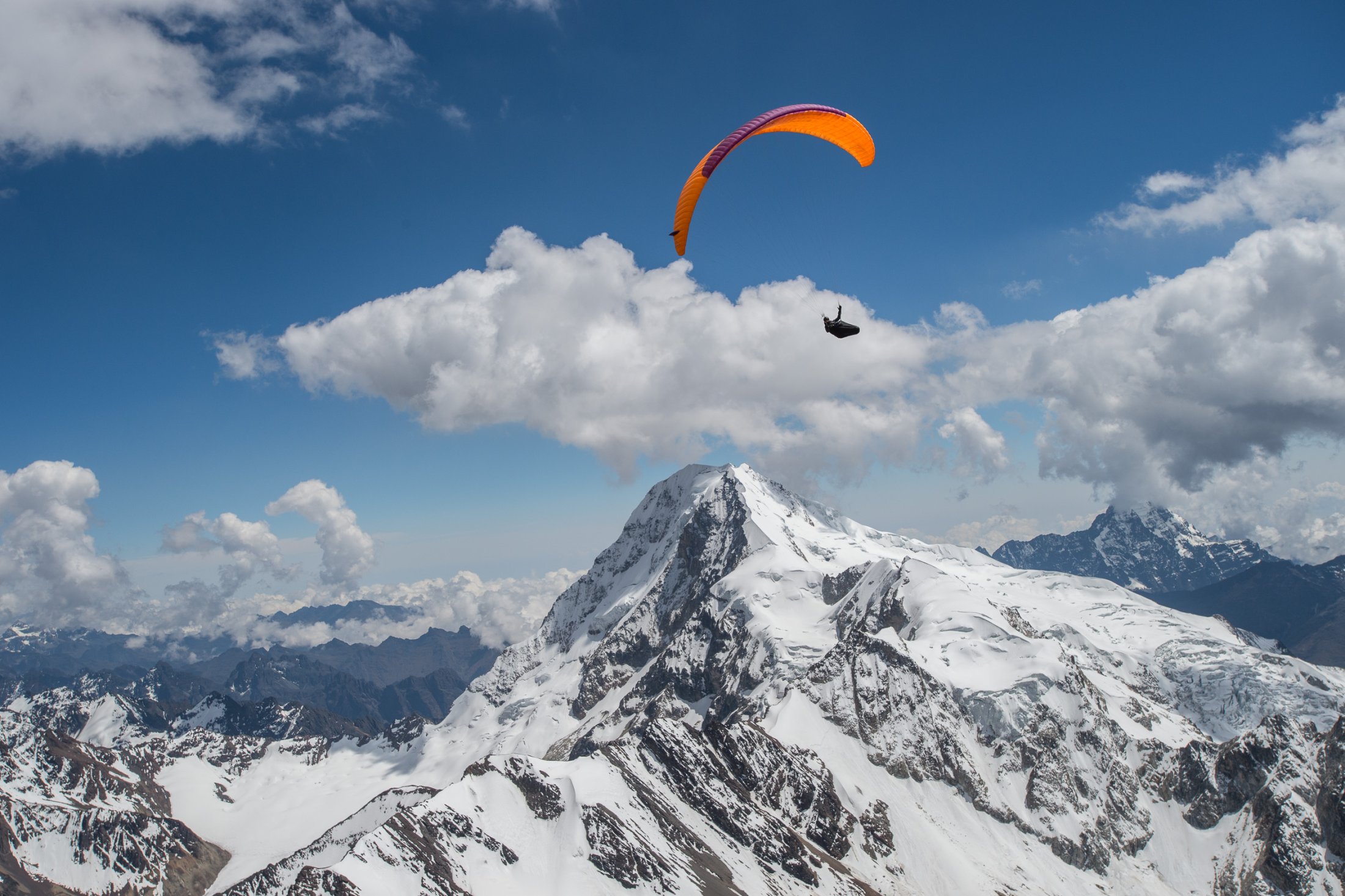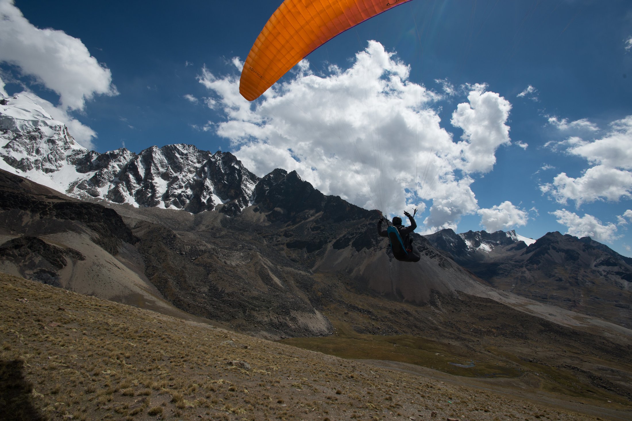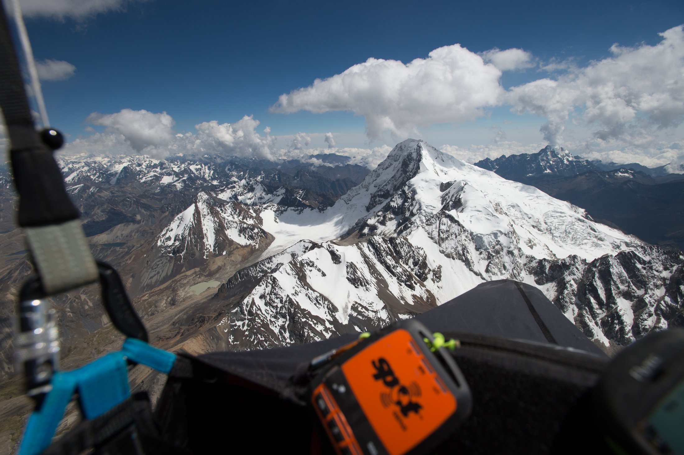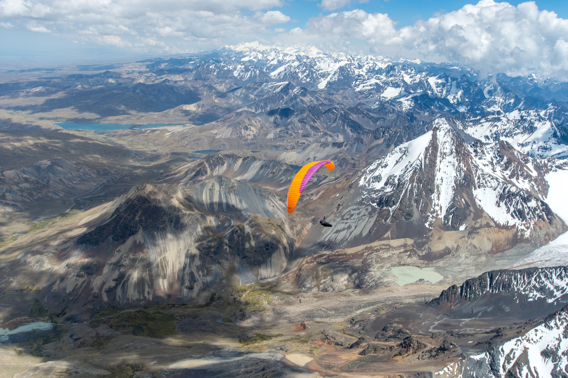 Wieder ein paar Tage später erreichen wir die Ausläufer der nördlich von La Paz gelegenen Cordillera Real. Die Nacht im Zelt war kalt, und wir stehen bereits um 9 Uhr in Vollmontur am Startplatz auf rund 4800 Metern, direkt am Fusse des Nevado Huayna Potosi (6088m). Einige friedlich weidende Lamas sind die einzigen, welche die Morgenstunden hier oben mit uns teilen. Wir befürchten schon, der Wind sei bereits wieder zu stark zum Starten. Also nichts wie raus, ein paar Mal hin und her soaren und der Einstieg in die Morgenthermik ist gefunden – und die ist gut, sogar sehr gut! Das Vario schreit unaufhörlich, und wir erreichen innert Kürze die 6000 Metermarke. Nachdem die warmen Handschuhe montiert sind - gut, das hätte man auch schon früher machen können - steige ich erneut in den Schlauch und folge Ueli auf knapp 6500 Meter. Handschuhe wieder runter, denn damit kann ich die Kamera nicht bedienen. Es ist saukalt hier oben, aber es reicht für ein paar schöne Bilder. Die Luft ist spürbar dünn, die Euphorie beinahe grenzenlos - zugegeben, ein bisschen Respekt vor der grossen Höhe schwingt auch noch mit. Doch als wir hoch über dem Gletscher auf den Gipfel des Nevado hinunterblicken, überwiegt die Freude definitiv und unter dem wärmenden Kopfstrumpf installiert sich ein nicht wegzubringendes Dauergrinsen. Die Szenerie: Gegen Norden öffnet sich der Blick weit auf die Cordillera Real, im Osten grüsst in weiter Ferne der Lago Titicaca, und im Süden steht der Moloch La Paz in der Morgensonne. Weit unter uns liegt die Laguna Milluni und einige weitere kleine Lagunen, deren Ufer vom erzhaltigen Gestein rötlich schimmern. Als Spielball der Elemente kommt man sich unendlich klein vor hier oben und fühlt sich dabei einfach grossartig - dass wir das erleben dürfen!