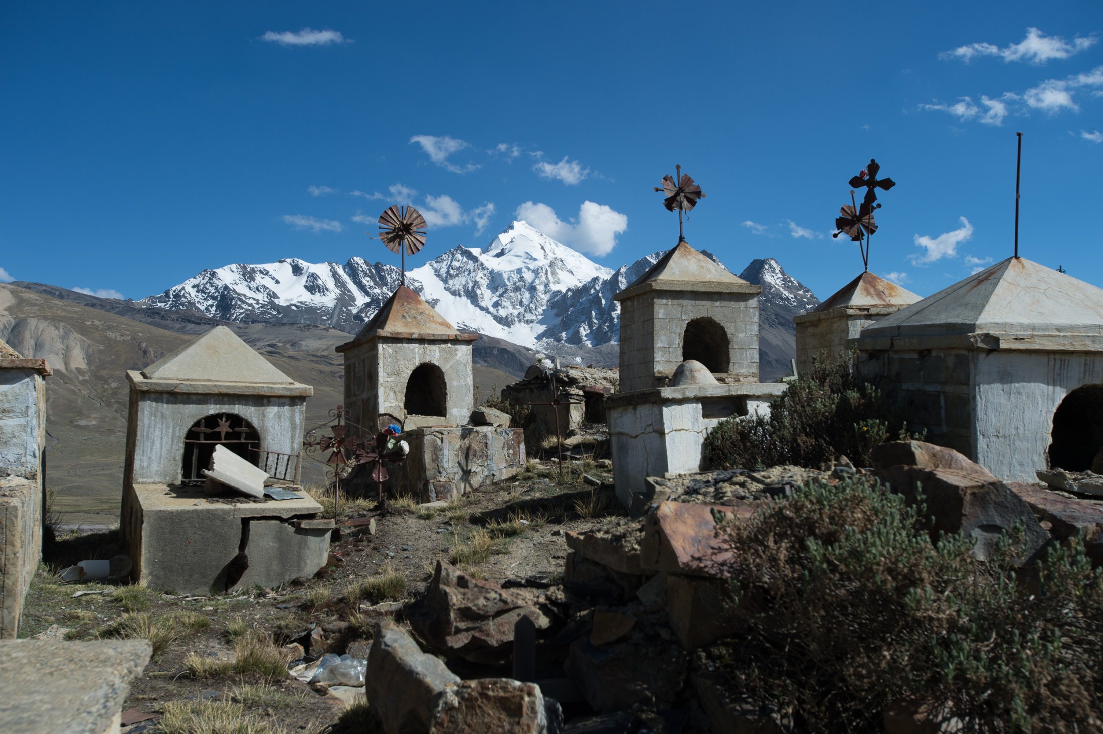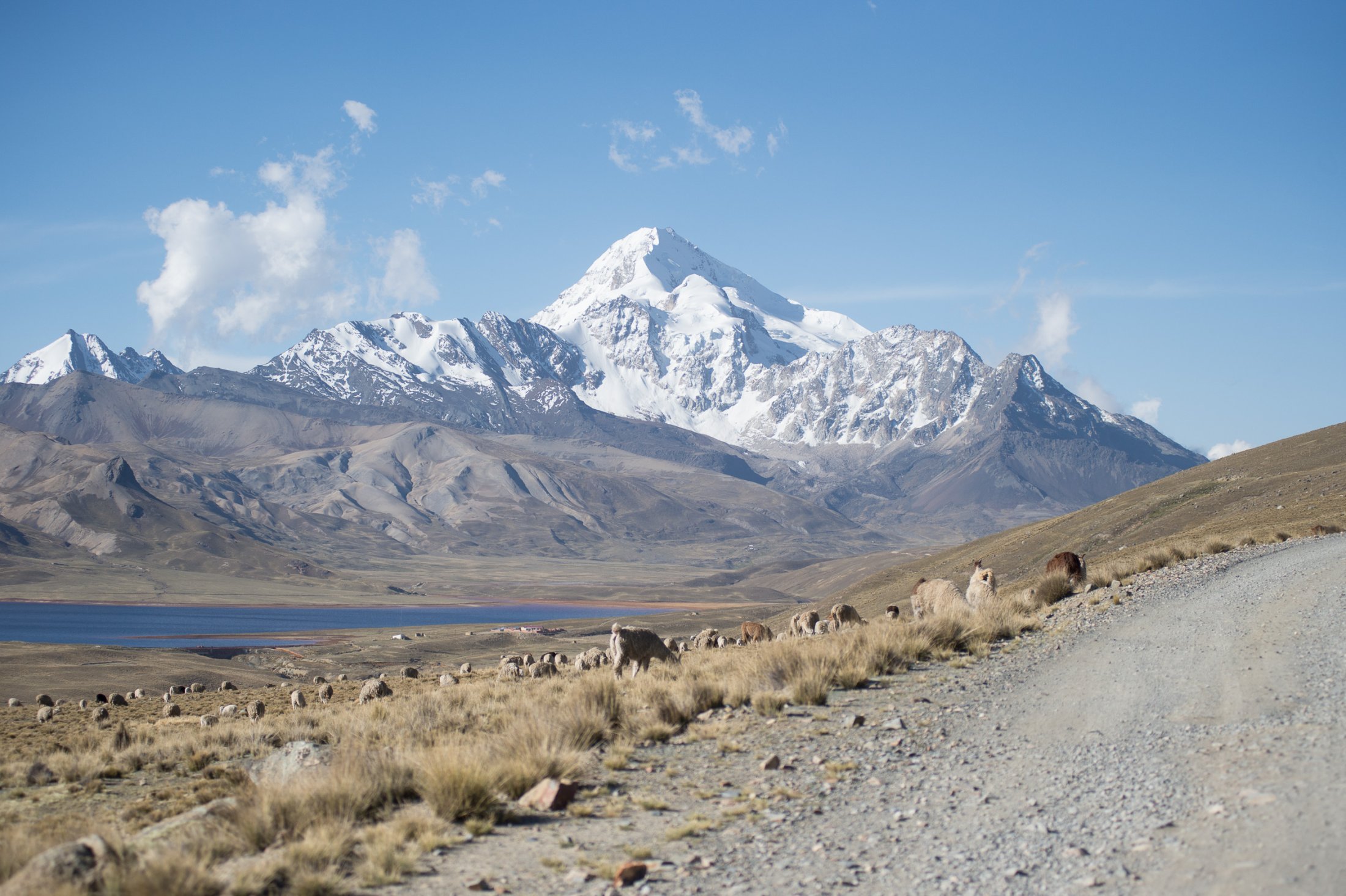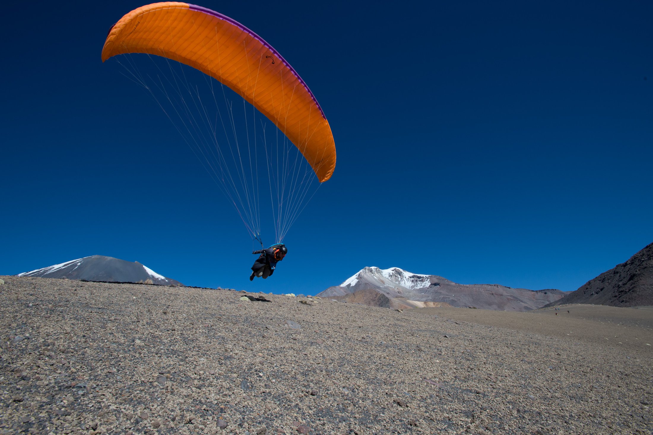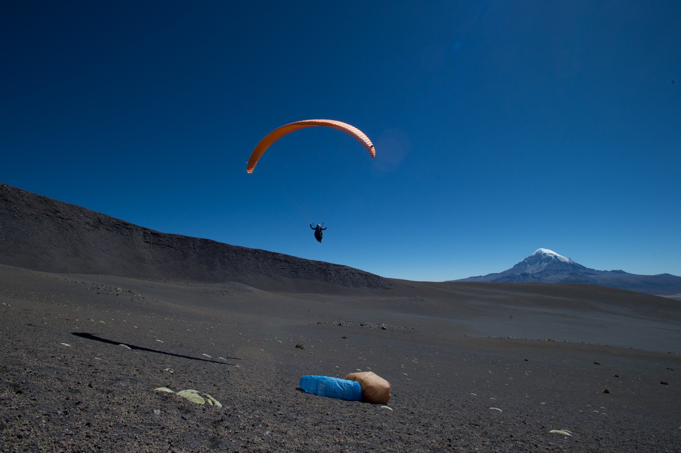Wieder ein paar Tage später erreichen wir die Ausläufer der nördlich von La Paz gelegenen Cordillera Real. Die Nacht im Zelt war kalt, und wir stehen bereits um 9 Uhr in Vollmontur am Startplatz auf rund 4800 Metern, direkt am Fusse des Nevado Huayna Potosi (6088m). Einige friedlich weidende Lamas sind die einzigen, welche die Morgenstunden hier oben mit uns teilen. Wir befürchten schon, der Wind sei bereits wieder zu stark zum Starten. Also nichts wie raus, ein paar Mal hin und her soaren und der Einstieg in die Morgenthermik ist gefunden – und die ist gut, sogar sehr gut! Das Vario schreit unaufhörlich, und wir erreichen innert Kürze die 6000 Metermarke. Nachdem die warmen Handschuhe montiert sind - gut, das hätte man auch schon früher machen können - steige ich erneut in den Schlauch und folge Ueli auf knapp 6500 Meter. Handschuhe wieder runter, denn damit kann ich die Kamera nicht bedienen. Es ist saukalt hier oben, aber es reicht für ein paar schöne Bilder. Die Luft ist spürbar dünn, die Euphorie beinahe grenzenlos - zugegeben, ein bisschen Respekt vor der grossen Höhe schwingt auch noch mit. Doch als wir hoch über dem Gletscher auf den Gipfel des Nevado hinunterblicken, überwiegt die Freude definitiv und unter dem wärmenden Kopfstrumpf installiert sich ein nicht wegzubringendes Dauergrinsen. Die Szenerie: Gegen Norden öffnet sich der Blick weit auf die Cordillera Real, im Osten grüsst in weiter Ferne der Lago Titicaca, und im Süden steht der Moloch La Paz in der Morgensonne. Weit unter uns liegt die Laguna Milluni und einige weitere kleine Lagunen, deren Ufer vom erzhaltigen Gestein rötlich schimmern. Als Spielball der Elemente kommt man sich unendlich klein vor hier oben und fühlt sich dabei einfach grossartig - dass wir das erleben dürfen!