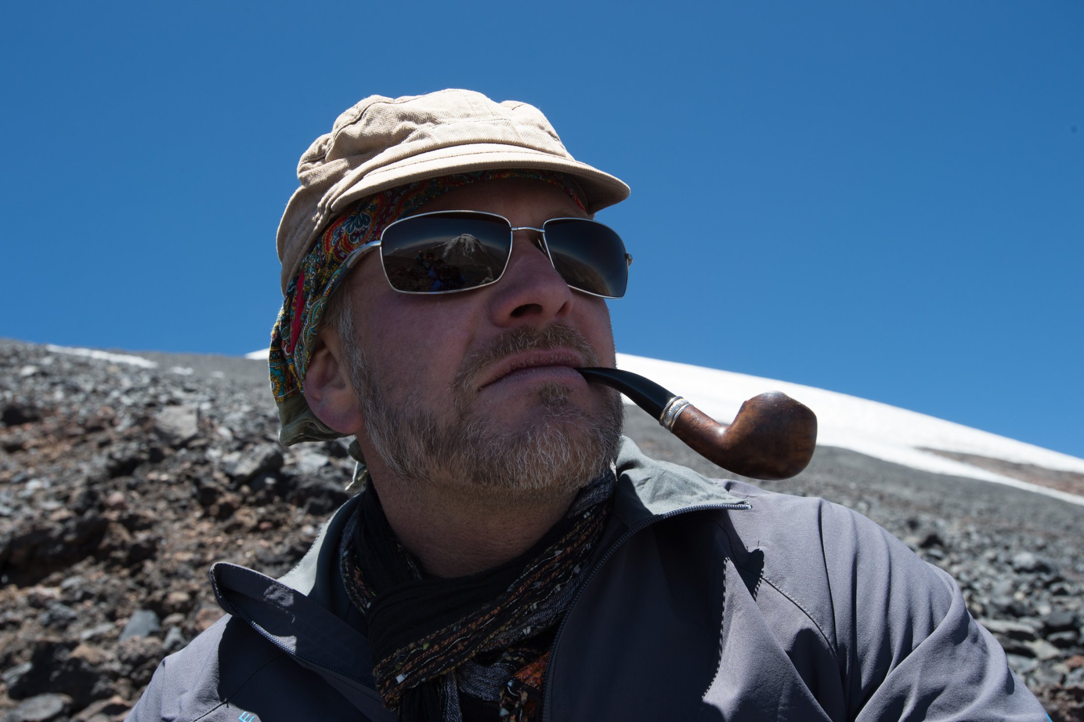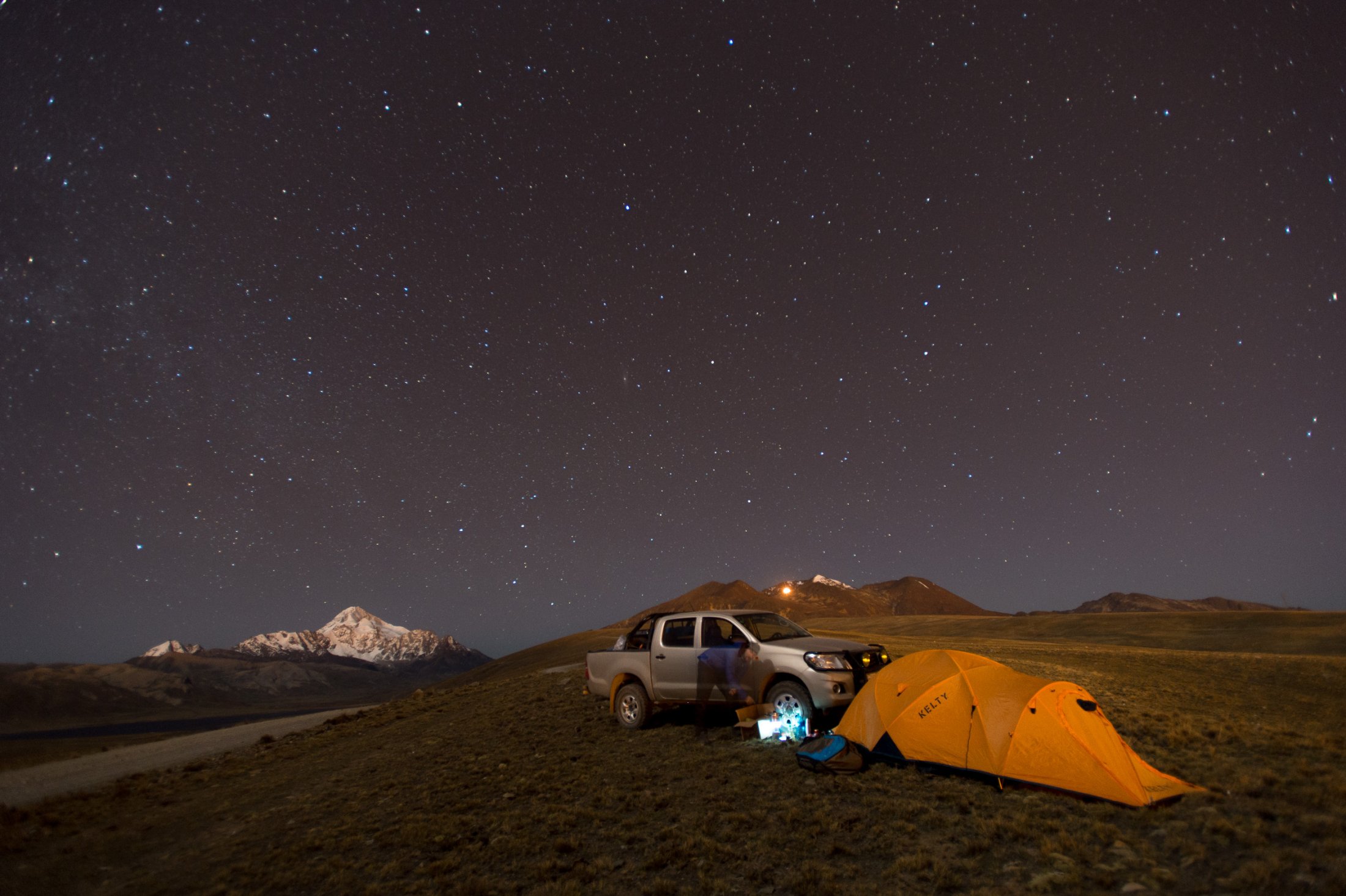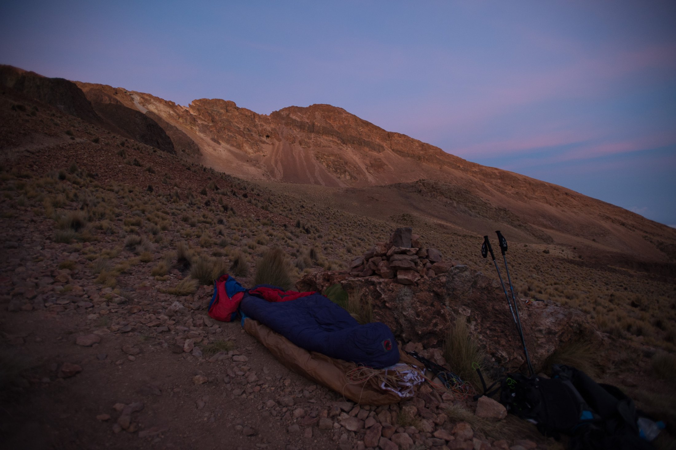 Nachdem wir unsere Ausrüstung bereit gemacht haben, dreht auch der Wind auf. Nur leider von hinten. Zwar kann sich hin und wieder auf unserer (bevorzugten) Startseite eine Ablösung durchsetzen, aber diese währt jeweils nicht lange. Eine Spur Verzweiflung kommt auf, haben wir doch lautstark zum Besten gegeben, dass wir hier garantiert nicht mehr hinunterlaufen würden. Doch auch ein paar hundert Meter tiefer, bessert sich die Situation nicht. Schnell ist uns beiden klar, dass der Weg zurück nicht durch die Luft gehen würde. Wir beginnen im steilen Gelände unsere Ausrüstung wieder einzupacken. Der Abstieg erweist sich als weit weniger beschwerlich als angenommen, und der immer stärker werdende Wind bestätigt die Richtigkeit unserer Entscheidung. Zwei Stunden später verstauen wir unsere Ausrüstung wieder auf dem Pickup. Trotz dem entgangenen Flug sind wir überglücklich, diesen Berg bezwungen zu haben. Die dünne Luft hat uns überhaupt nichts ausgemacht, und die gemütliche Nacht unter dem sternenbedeckten Himmelszelt war nicht nur erstaunlich warm, sondern auch bezaubernd schön.