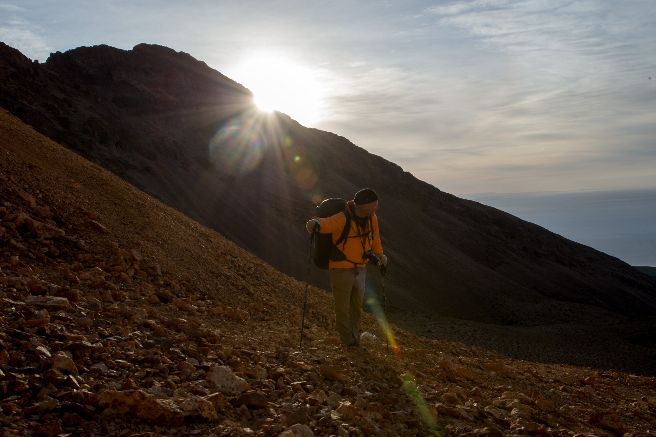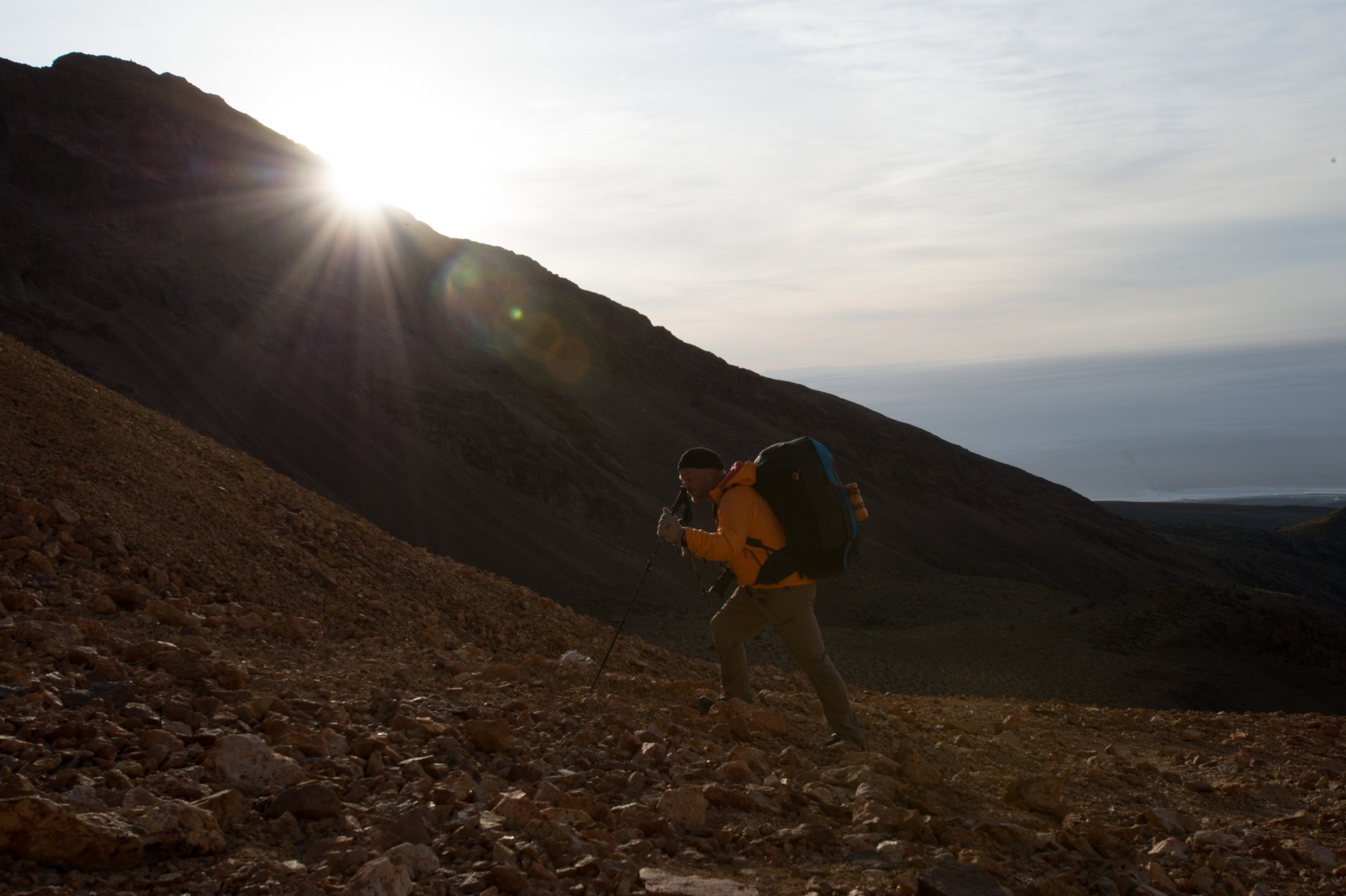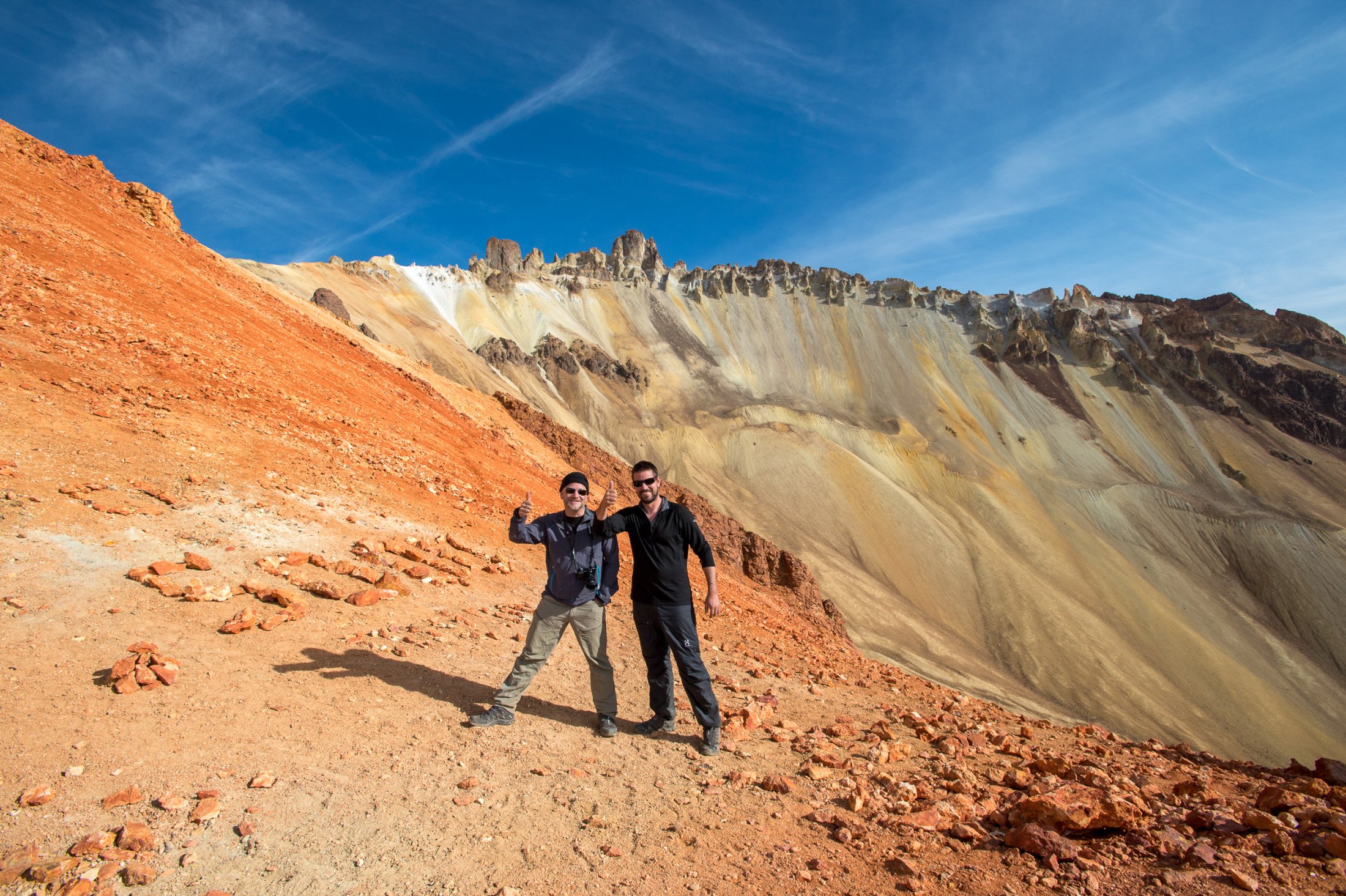 Nachdem wir unsere Ausrüstung bereit gemacht haben, dreht auch der Wind auf. Nur leider von hinten. Zwar kann sich hin und wieder auf unserer (bevorzugten) Startseite eine Ablösung durchsetzen, aber diese währt jeweils nicht lange. Eine Spur Verzweiflung kommt auf, haben wir doch lautstark zum Besten gegeben, dass wir hier garantiert nicht mehr hinunterlaufen würden. Doch auch ein paar hundert Meter tiefer, bessert sich die Situation nicht. Schnell ist uns beiden klar, dass der Weg zurück nicht durch die Luft gehen würde. Wir beginnen im steilen Gelände unsere Ausrüstung wieder einzupacken. Der Abstieg erweist sich als weit weniger beschwerlich als angenommen, und der immer stärker werdende Wind bestätigt die Richtigkeit unserer Entscheidung. Zwei Stunden später verstauen wir unsere Ausrüstung wieder auf dem Pickup. Trotz dem entgangenen Flug sind wir überglücklich, diesen Berg bezwungen zu haben. Die dünne Luft hat uns überhaupt nichts ausgemacht, und die gemütliche Nacht unter dem sternenbedeckten Himmelszelt war nicht nur erstaunlich warm, sondern auch bezaubernd schön.
