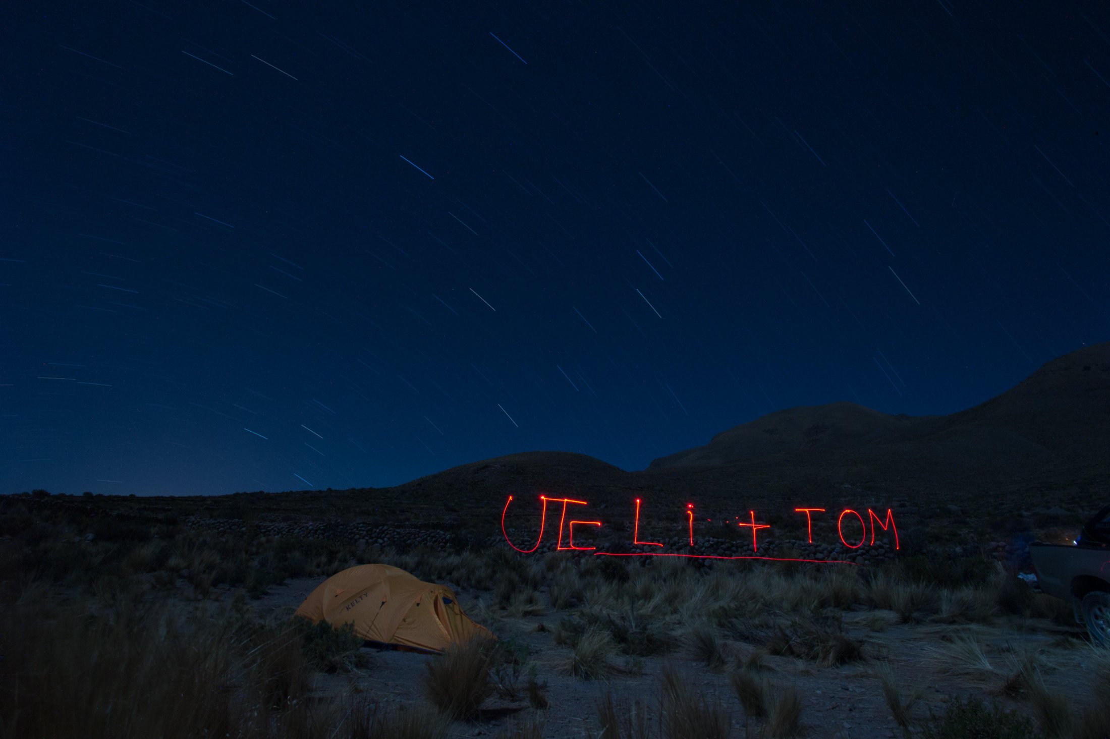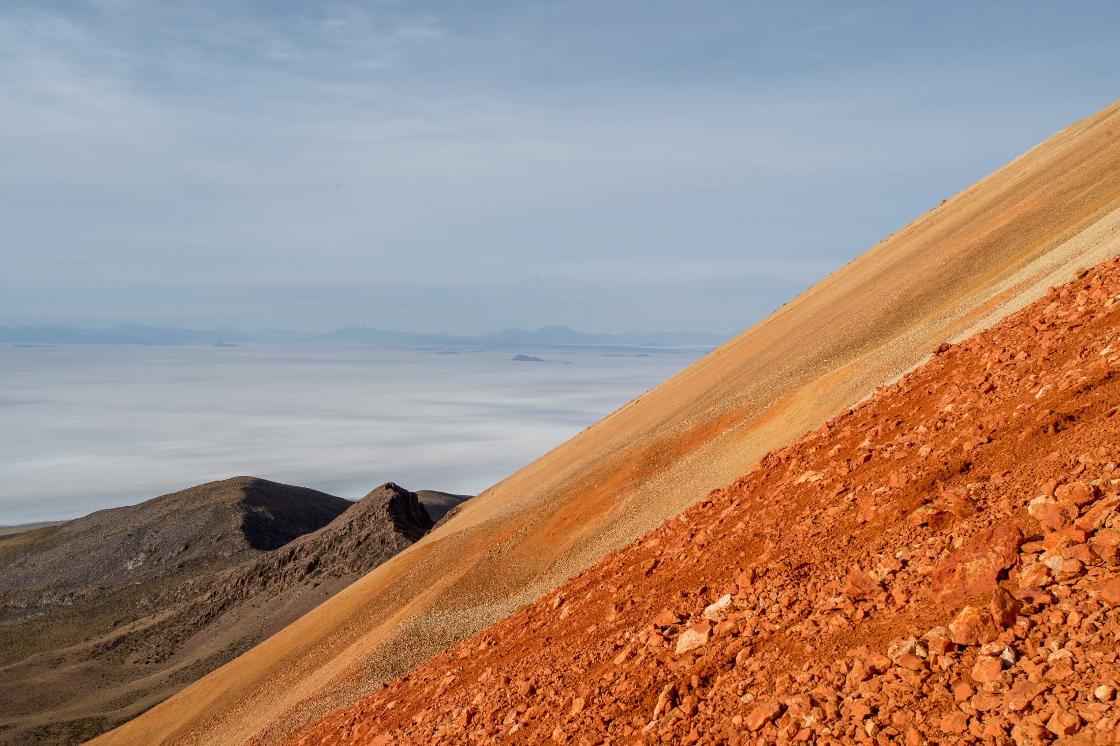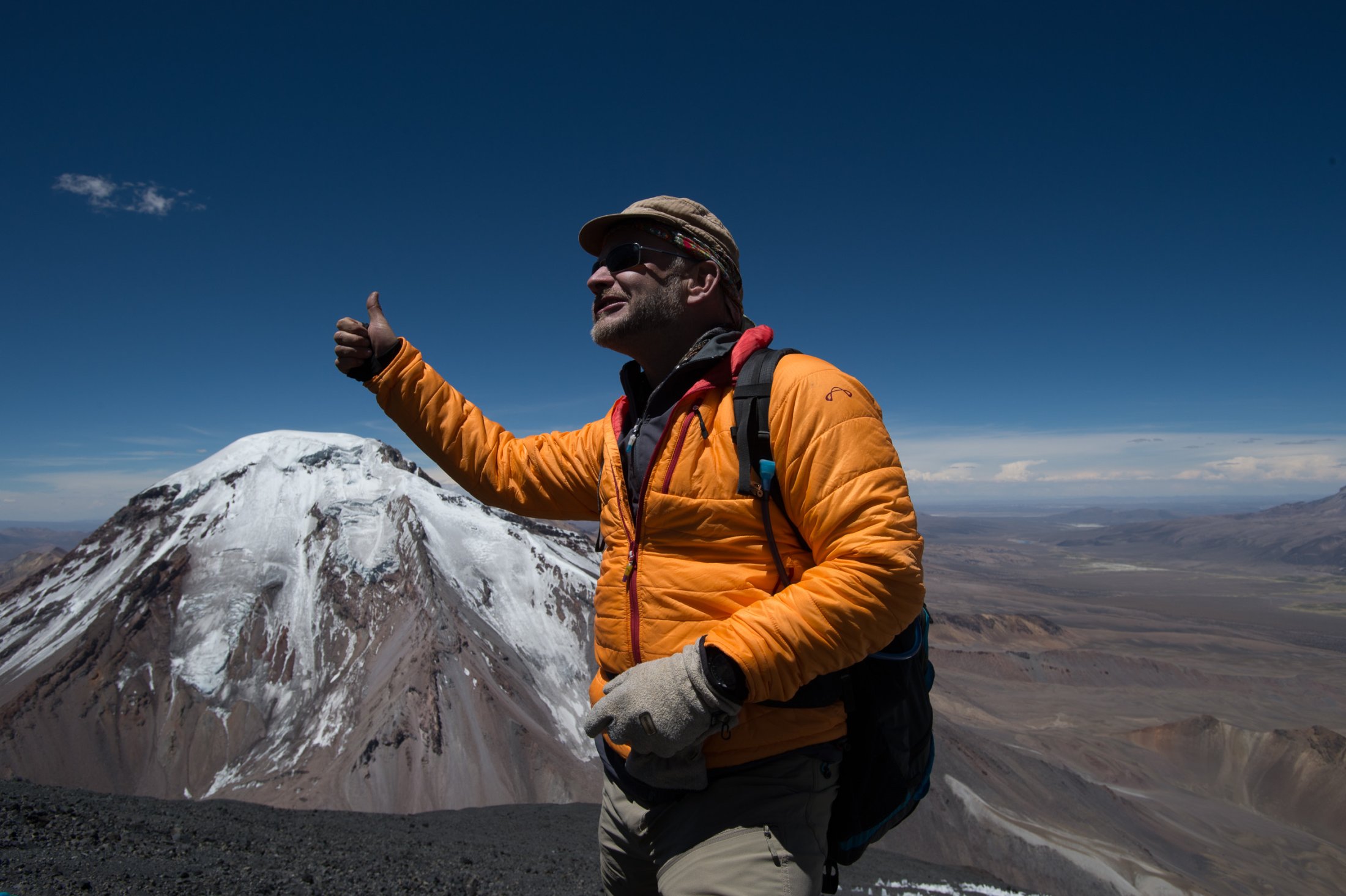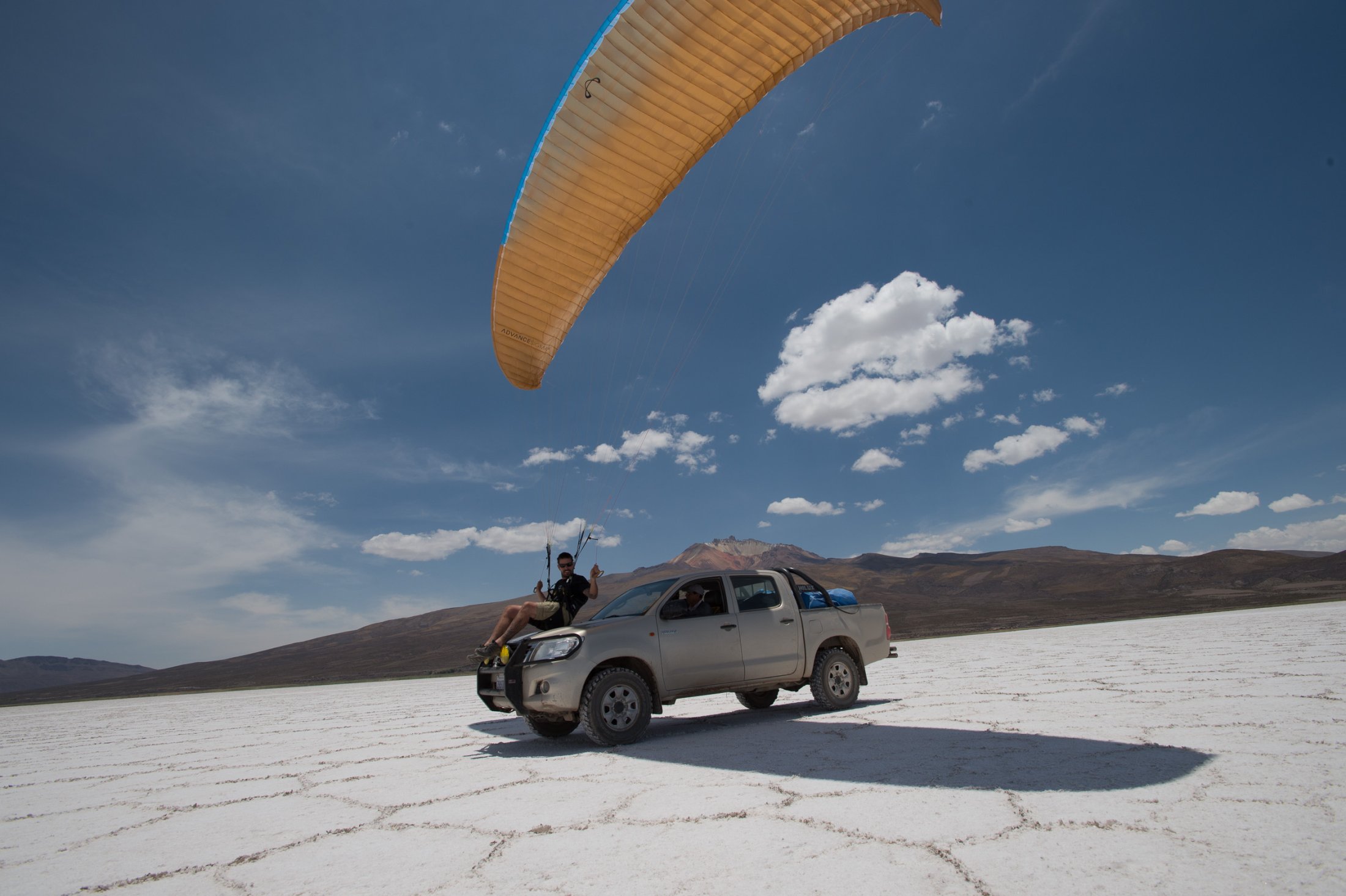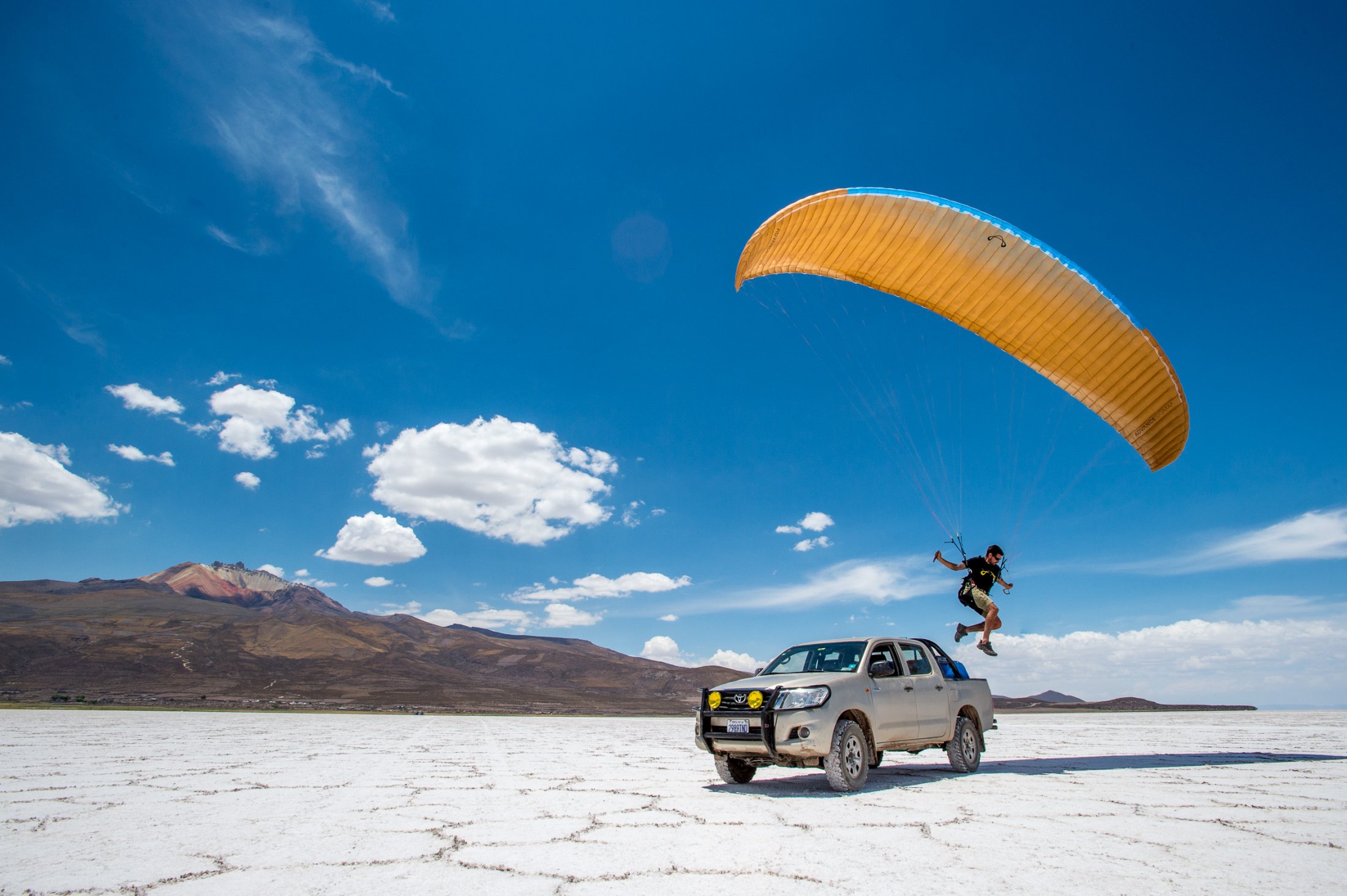 Doch wir wollen mehr und machen uns auf den Weg Richtung Süden zur Salar Uyuni, der mit über 10'000 Quadratkilometern grössten Salzpfanne der Erde. An deren nördlichen Ende erhebt sich der Vulkan Cerro Tunupa bis auf 5340 Meter. Dort wollen wir hinauf. Am späten Nachmittag erreichen wir den Fuss des Tunupa und machen uns mit Gleitschirm, Schlafsack und Verpflegung auf dem Rücken auf den langen Weg zum Gipfel. Im klassischen Alpinisten-Kriechgang (die dünne Luft verzeiht keine schnellen Schritte), erklimmen wir die von Dornbüschen und Wüstengras übersäten Ausläufer des Vulkans. Die Abendsonne bietet ein herrliches Schauspiel: Der zerklüftete Krater zeigt sich in seiner ganzen, rötlich-gelblich leuchtenden, Pracht. Auf ca. 4500 Metern - es wird bereits dunkel - schlagen wir im Schutze eines grossen Steines unser Nachtlager auf. Weit unter uns die grosse Salzwüste, über uns ein von wenigen Wolken verhangener Sternenhimmel mit einem halbvollen Mond, welcher die Landschaft um uns herum hell beleuchtet. Am nächsten Morgen erreichen wir um ca. halb acht den Kraterrand. Damit jeder sehen kann, dass sich die Mühe gelohnt hat, hat irgend jemand mit grossen Steinen die Zahl 5000 auf den Boden geschrieben - so hoch stehen wir hier. Wir blicken in einen gegen Osten offenen Kraterhalbkreis, welcher umsäumt ist von nochmals ca. 300 Meter höheren, zackigen Felsen, die sich majestätisch gegen den stahlblauen Himmel abheben. Weit unter uns die blendend weisse Endlosigkeit des Salzsees. Wir geniessen die Aussicht und beschliessen, noch eine halbe Stunde zu warten, in der Hoffnung, die Morgenthermik würde uns eine Überhöhung des Kraters ermöglichen.
