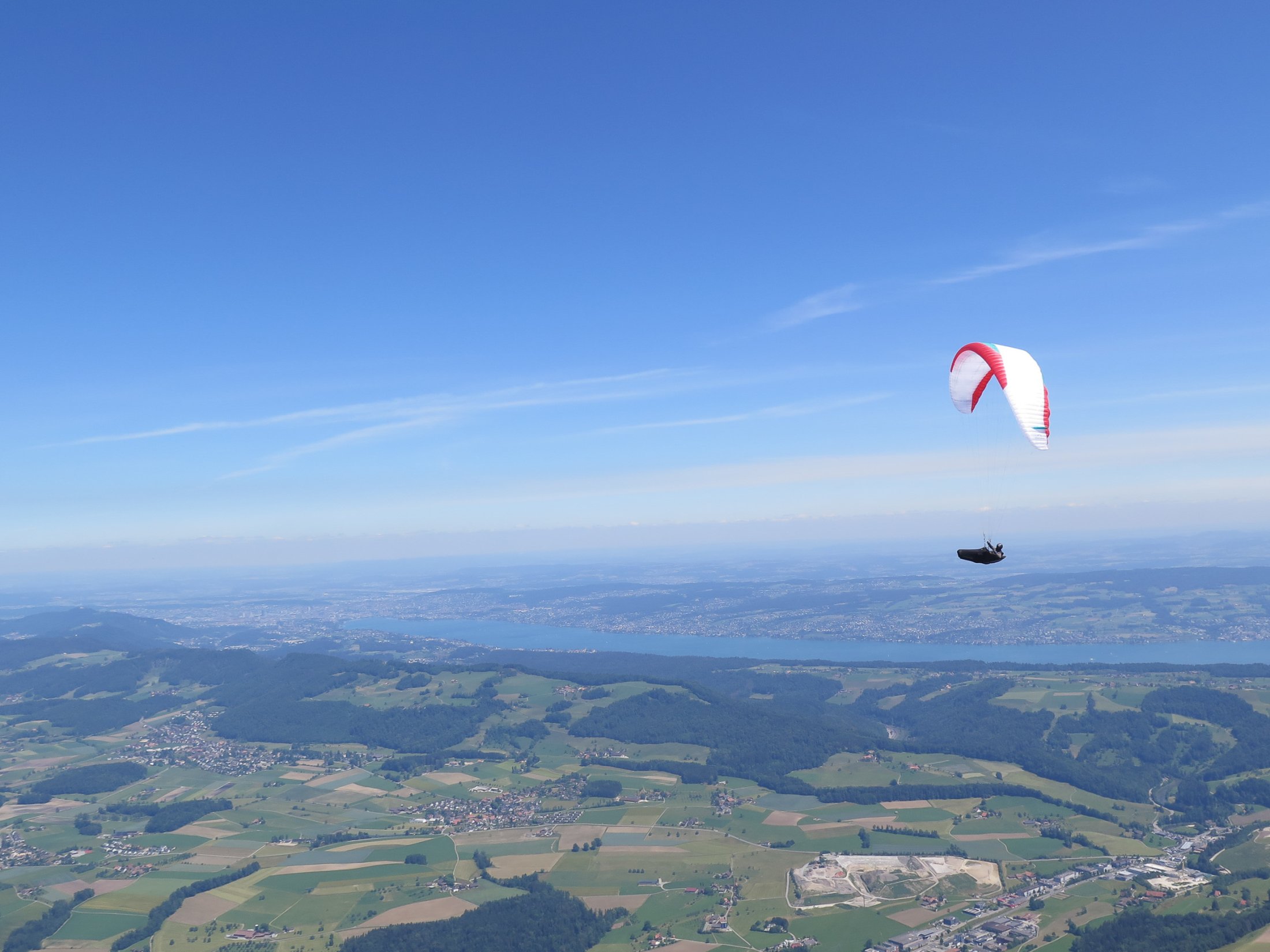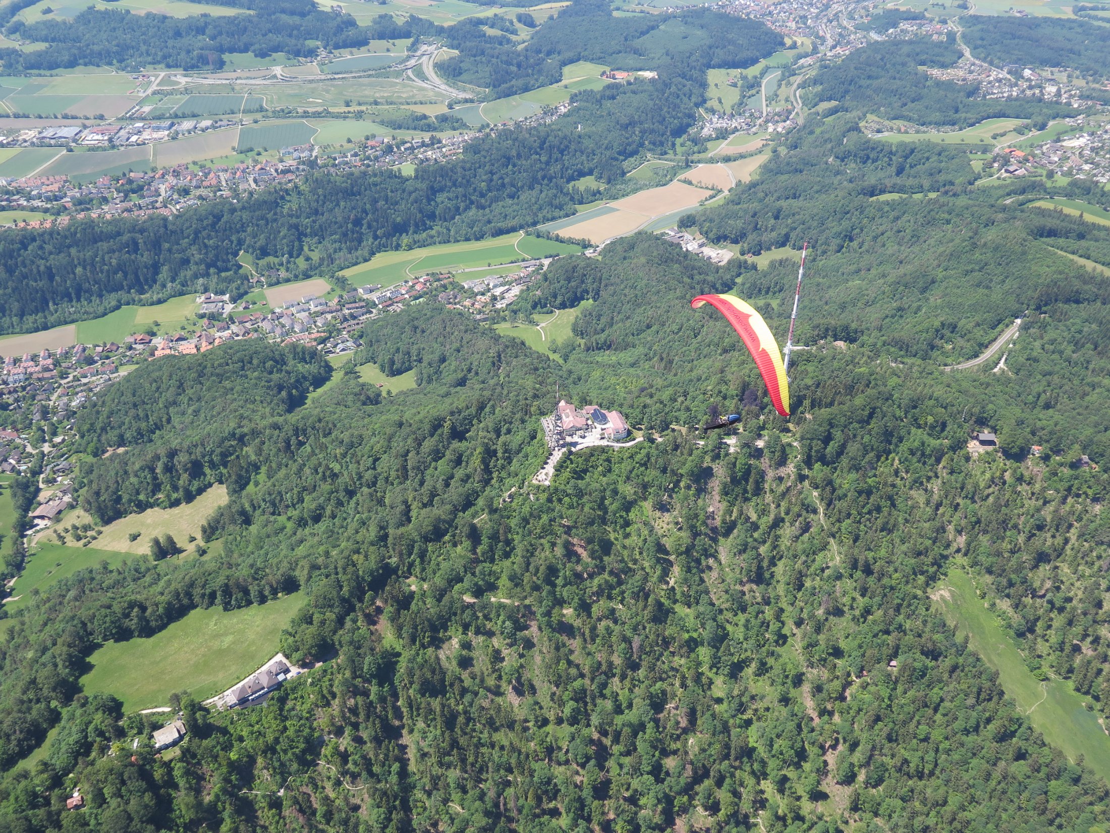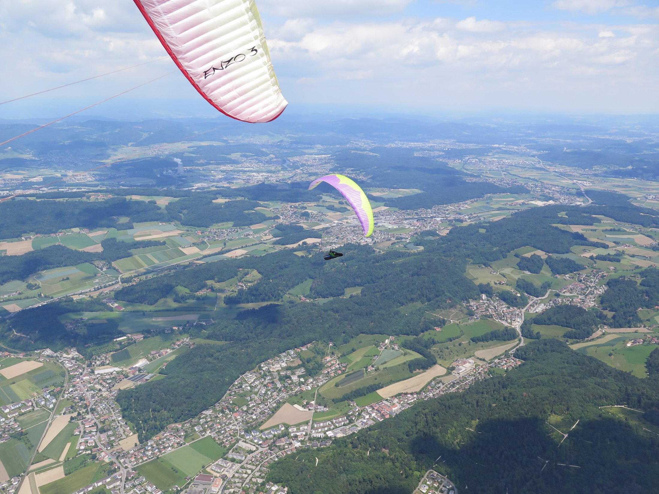 Recht zuverlässig drehen wir über der Fallätsche auf und lassen uns von der Bise in Richtung Hallwylersee spülen. Es ist schön mit anderen Piloten zusammen zu fliegen. Bei gleichem Pilotenniveau kann man im Flachland definitiv voneinander profitieren. Die Abrisskanten sind hier nicht ansatzweise so klar wie in den Bergen. Und die Chance dass ein Gleitschirm einer ganzen Gruppe auf Thermik trifft ist definitiv höher, als wenn man alleine unterwegs ist. Mal abgesehen von der mit 1350müM tief liegenden Luftraumuntergrenze gleich hinter dem Üetliberg, und der recht knackig-störrischen Thermik, fliegen wir ohne nenneswerte Zwischenfälle bis vor den Jura bei Oensingen.