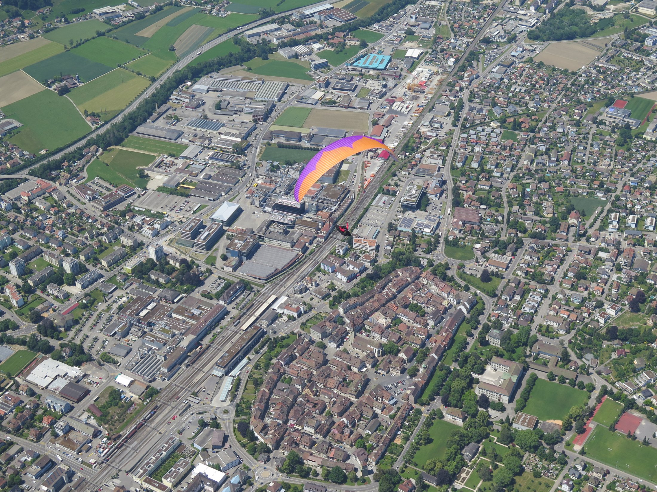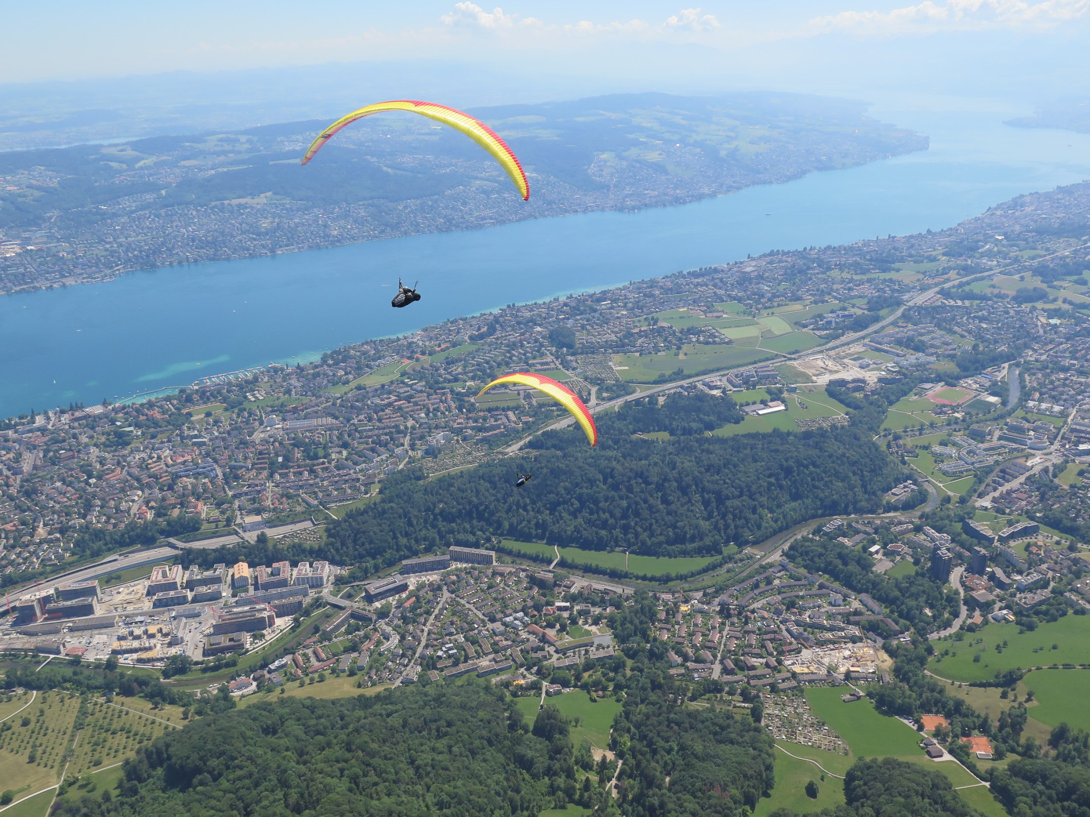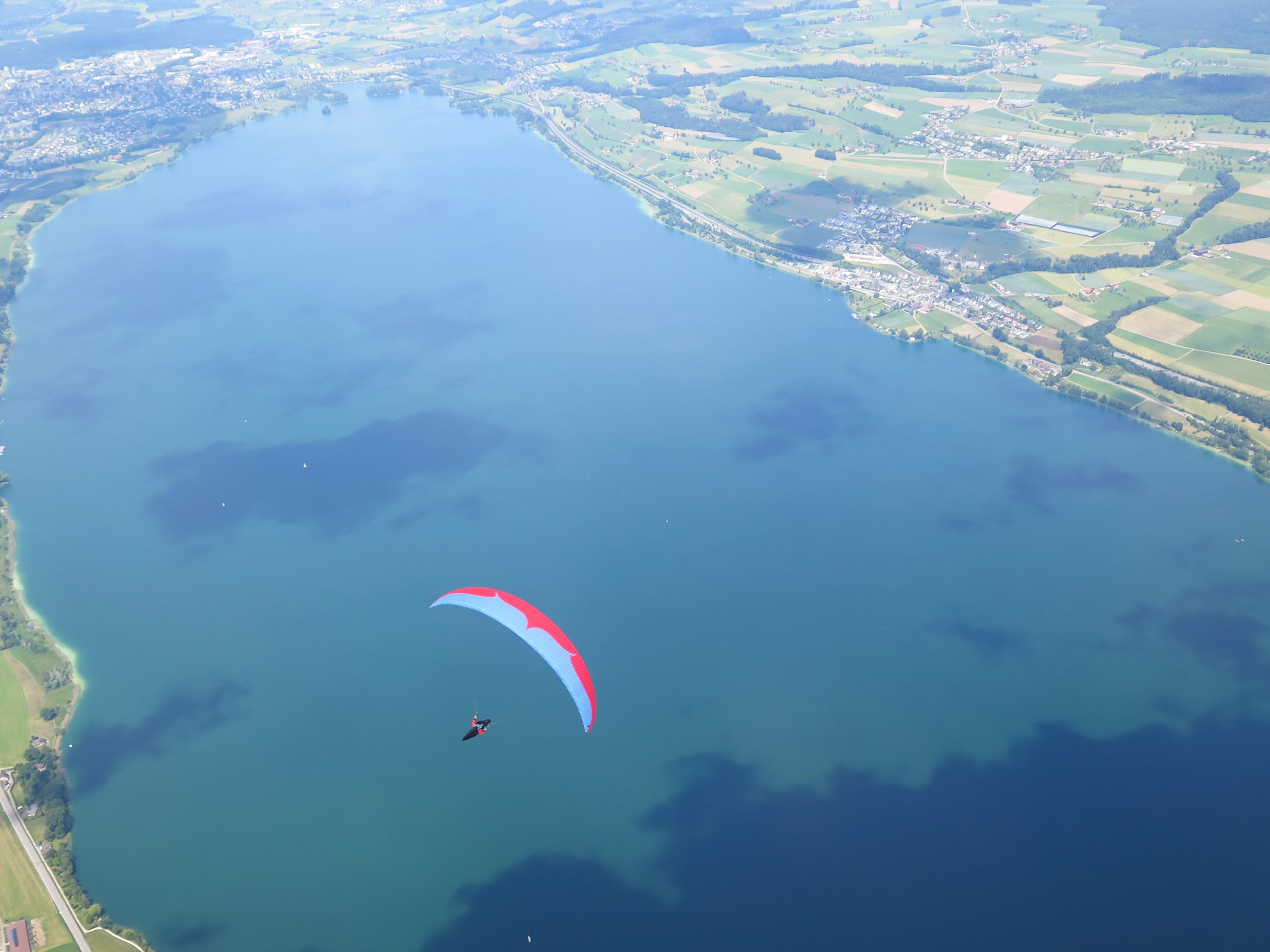Recht zuverlässig drehen wir über der Fallätsche auf und lassen uns von der Bise in Richtung Hallwylersee spülen. Es ist schön mit anderen Piloten zusammen zu fliegen. Bei gleichem Pilotenniveau kann man im Flachland definitiv voneinander profitieren. Die Abrisskanten sind hier nicht ansatzweise so klar wie in den Bergen. Und die Chance dass ein Gleitschirm einer ganzen Gruppe auf Thermik trifft ist definitiv höher, als wenn man alleine unterwegs ist. Mal abgesehen von der mit 1350müM tief liegenden Luftraumuntergrenze gleich hinter dem Üetliberg, und der recht knackig-störrischen Thermik, fliegen wir ohne nenneswerte Zwischenfälle bis vor den Jura bei Oensingen.