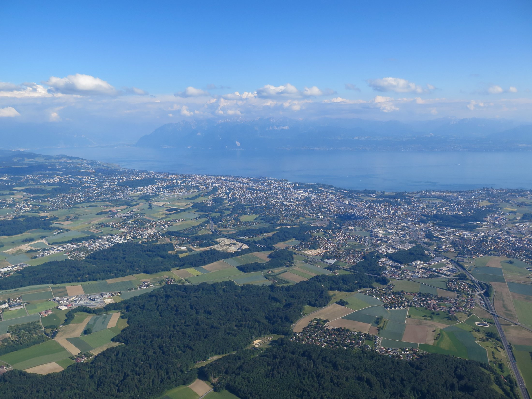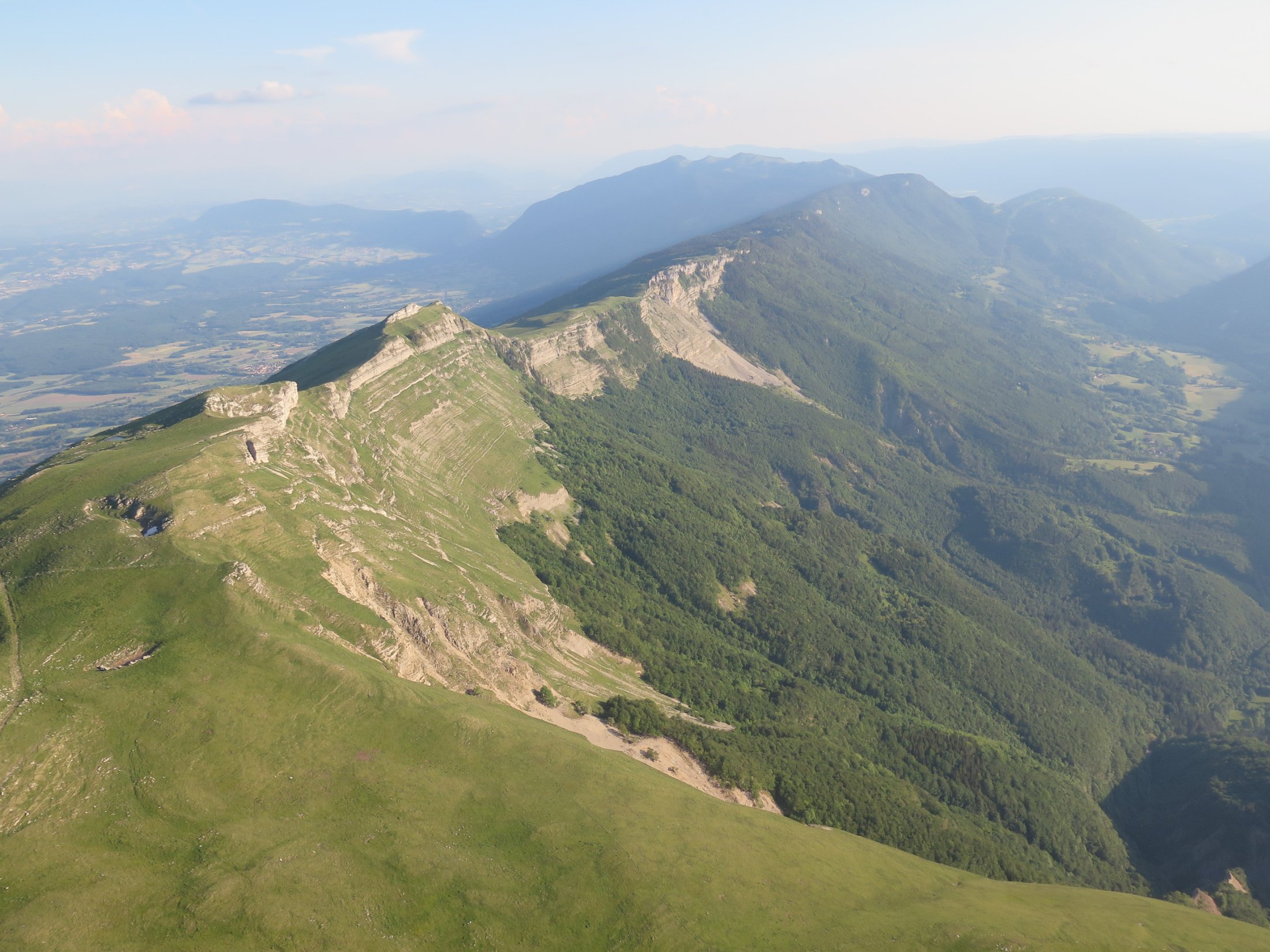 Die Sonne steht schon flach und taucht die saftiggrünen Weiden und die ausgedehnten Nadelwälder in ein sanftes Licht. Sanft ist jetzt auch die Thermik, die mich den mittlerweile fluffig klein süssen Cumulis entgegenträgt. Ich wechsle südlich an den Hauptkamm. Dort passiere ich Genf nördlich und überfliege den höchsten Punkt des Jura, den 1720m hohen Crêt de la Neige. Die letzte Flugstunde ist wunderschön und technisch supersimpel. Die Sonne wärmt die steilen Nordwestflanken nach wie vor zuverlässig und sorgt für sanfte Thermik. Der Wind bläst von schräg hinten, sorgt also für zusätzliche Aufwindkomponente und Extrageschwidigkeit. Überglücklich floate ich meinem Landeplatz in Bellegarde entgegen.