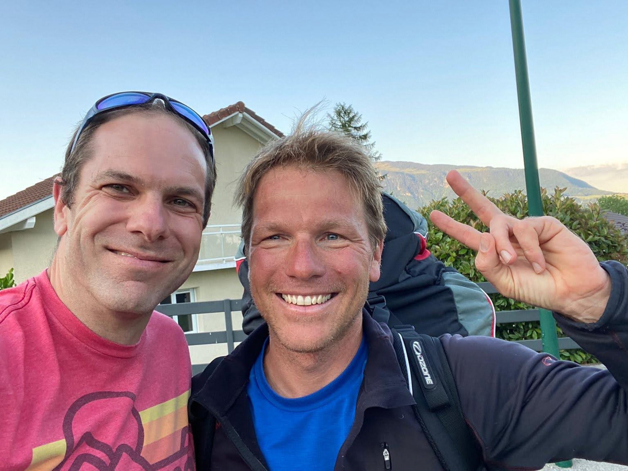 Als ich mit gepacktem Sack von meiner Landewiese trotte, hält ein schwarzer Kombi mit Genfer Nummer vor mir und ein strahlender Reynald Mumenthaler steigt aus. Meinen Track verfolgend hat er sich schon vor meiner Landung auf den Weg gemacht, um mich in die Schweiz zurückzuholen. Ein riesiges Dankeschön an Reynald an dieser Stelle, der mich ohne Zwischenfälle durch den Zoll brachte, mich verköstigte und beherrbergte. So sollte der Spirit unter Piloten immer sein.