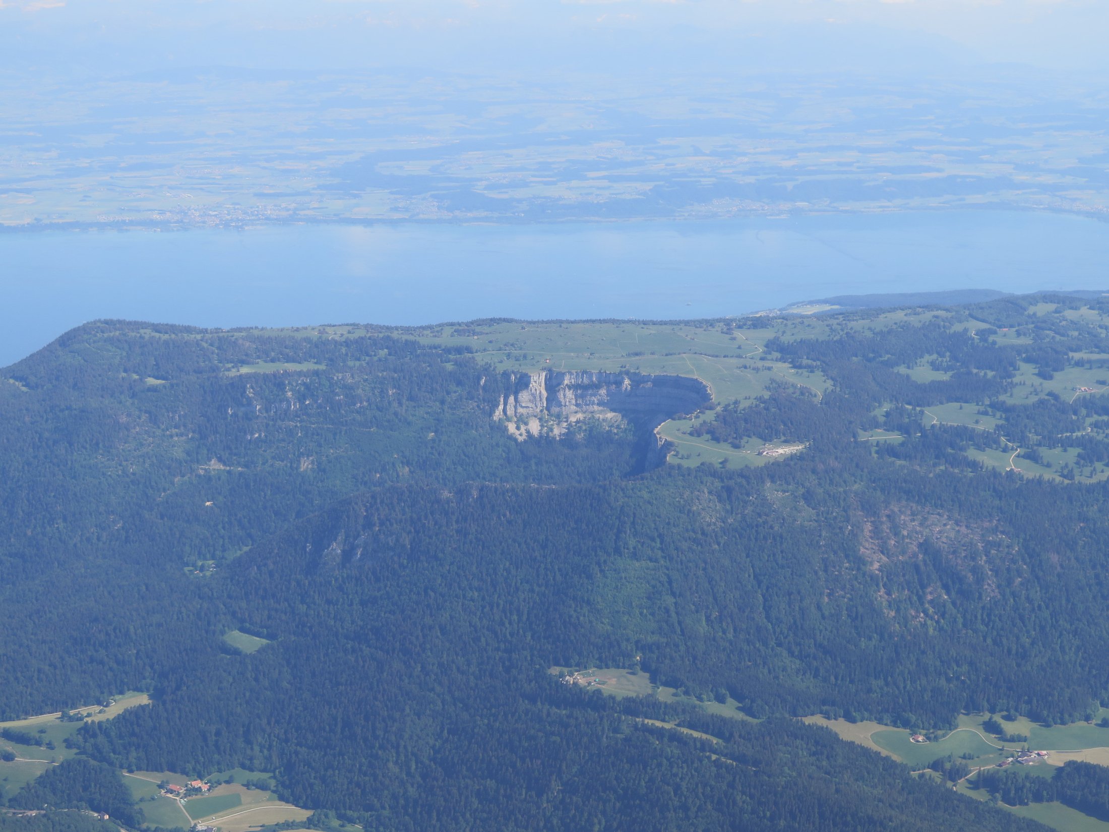 Vorbeiflug an der Creux du Van. Im Hintergrund der Neuenburgersee.