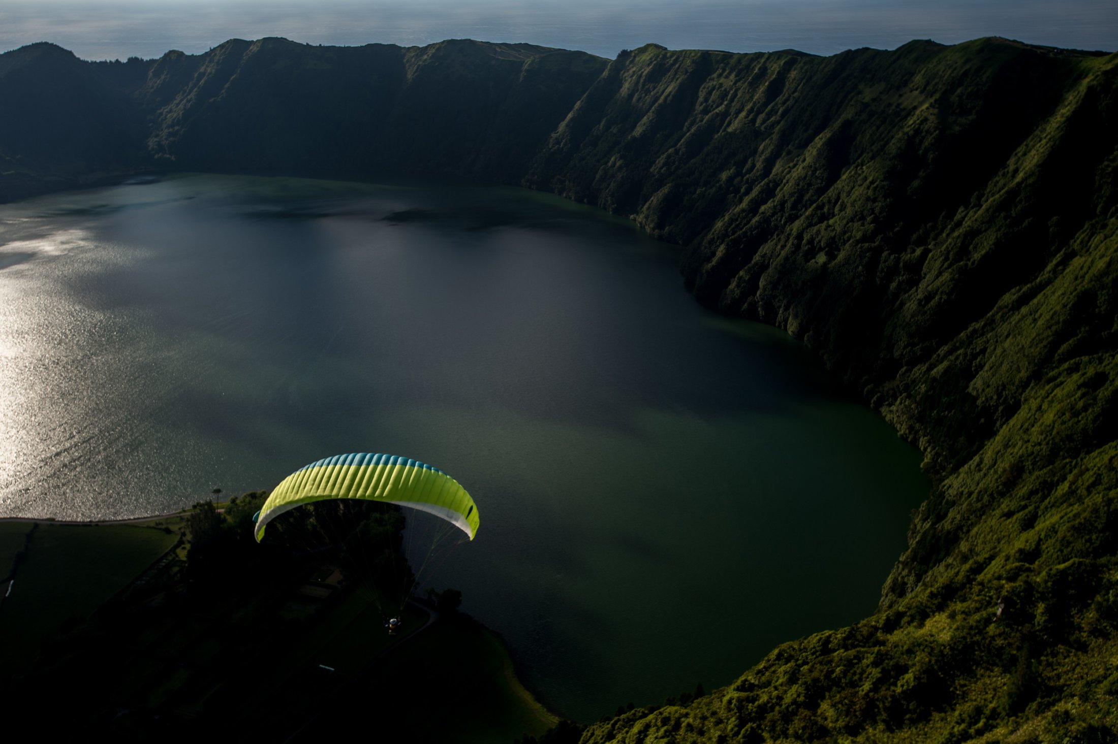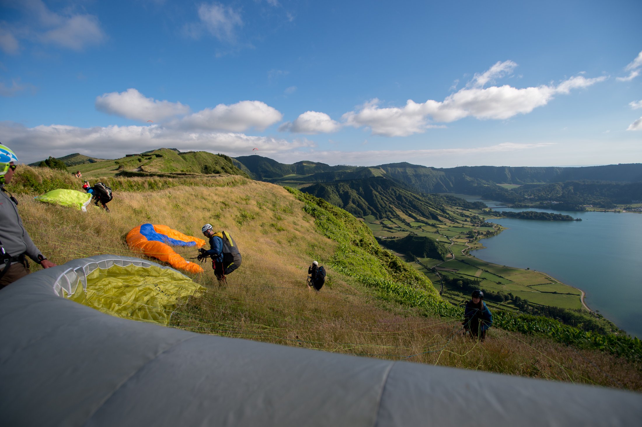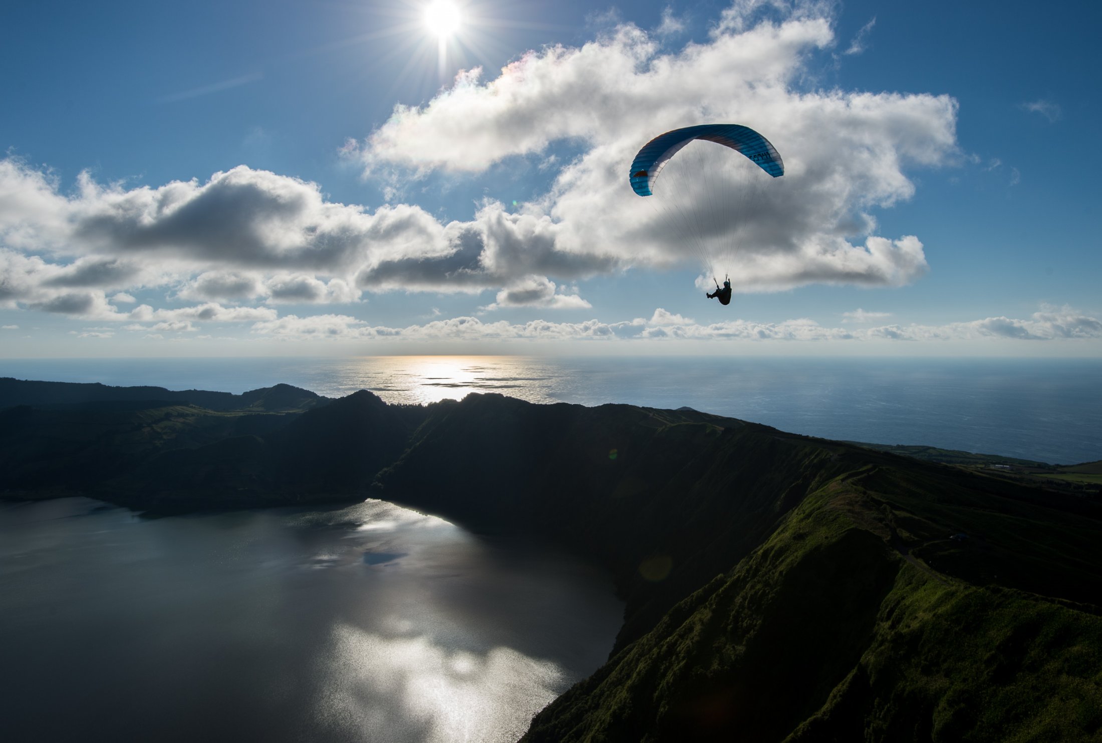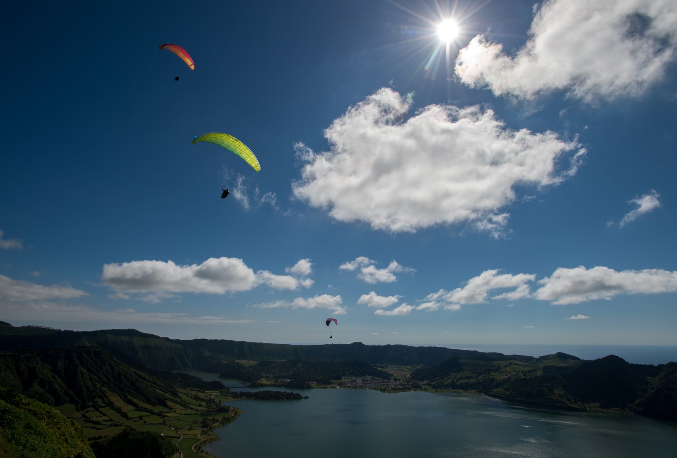 Sao Miguel, die grösste der Azoreninseln, erwartete uns mit viel Wind und Wolken. Das Azorenhochs legte sich für einmal Quer und so fanden wir uns in einer hartnäckigen Nordströmung wieder, die das Gleitschirmfliegen schwierig machte. Trotzdem fanden wir ein paar schöne Flugtage, unvergesslich die Flüge im Vulkankrater von Sete Cidades!