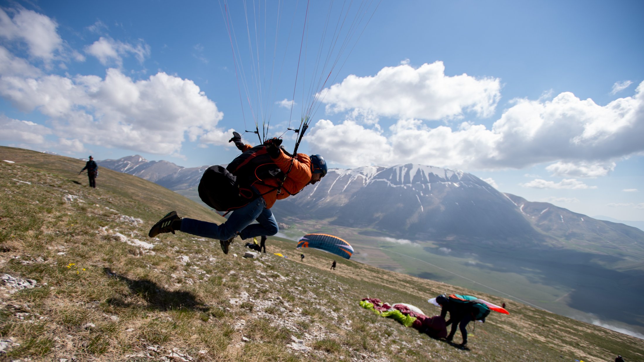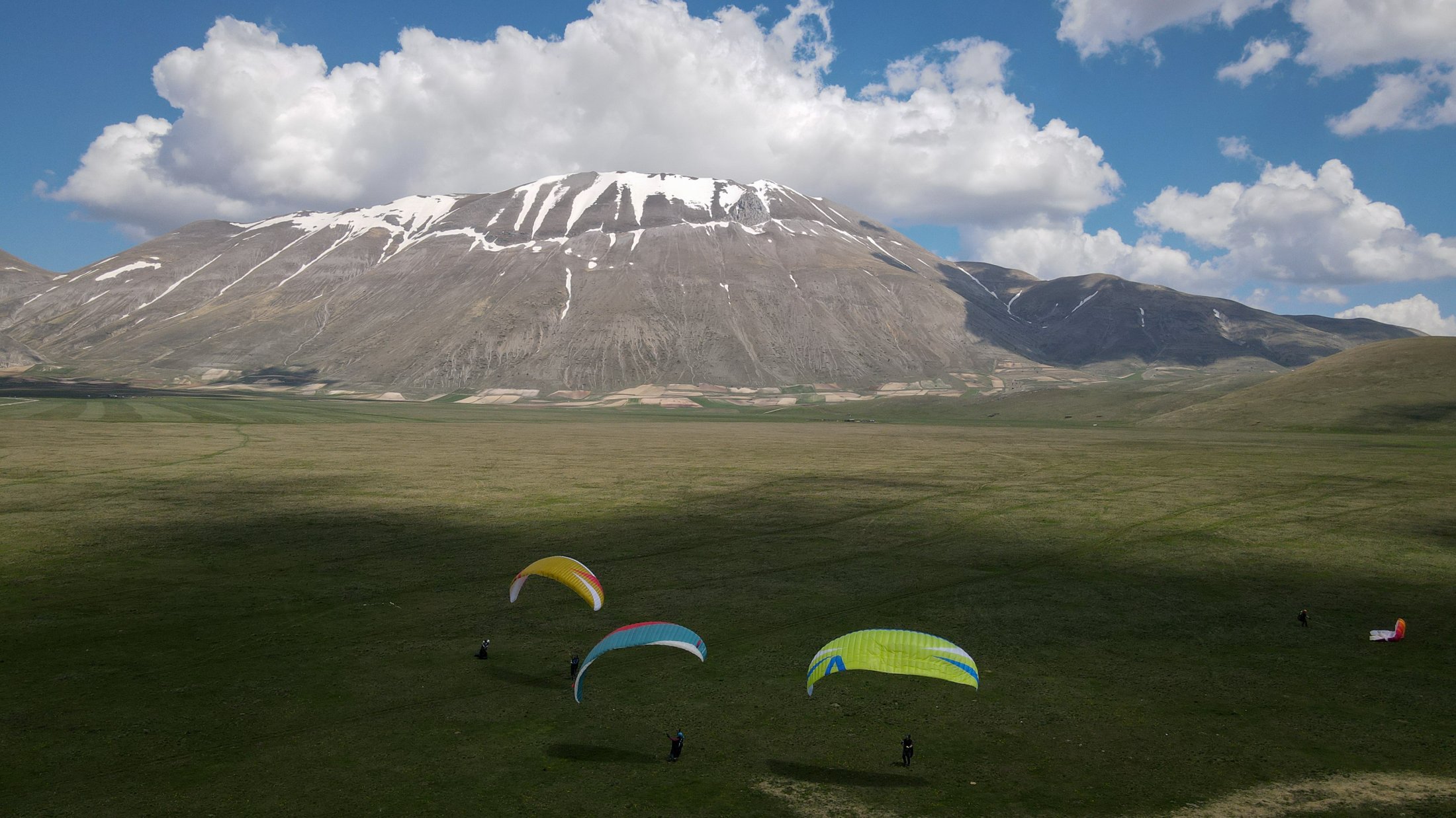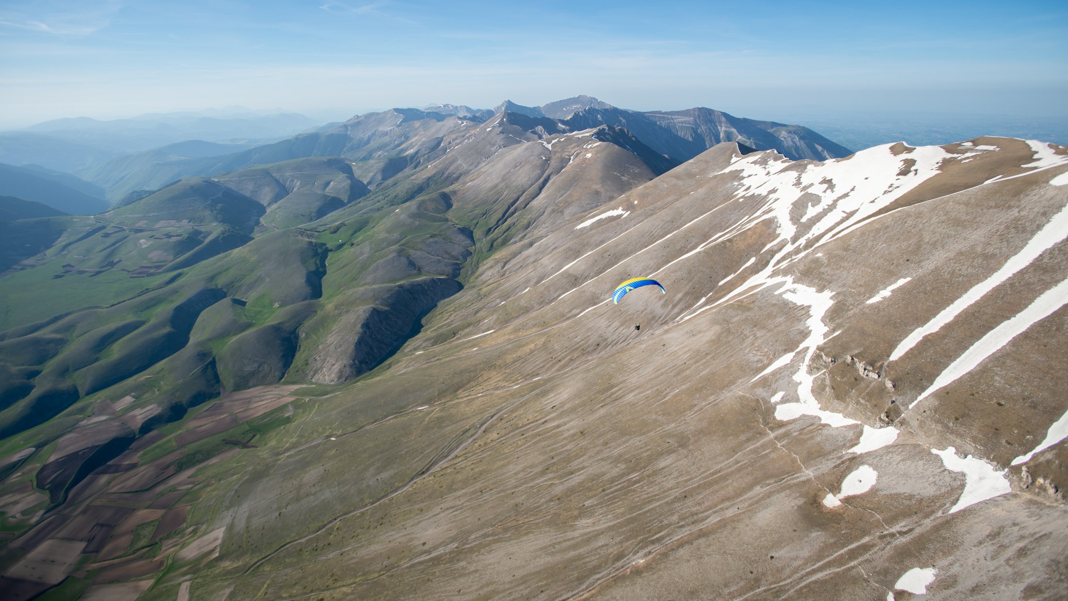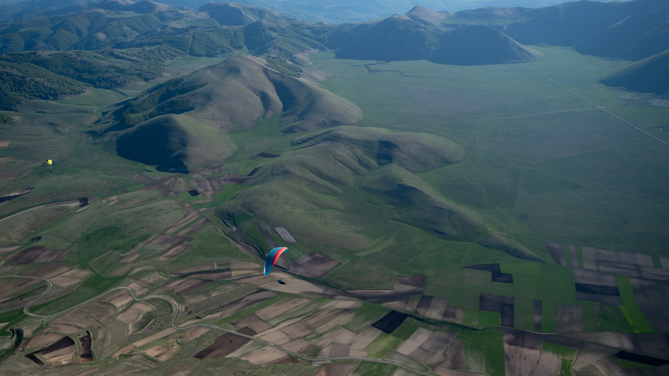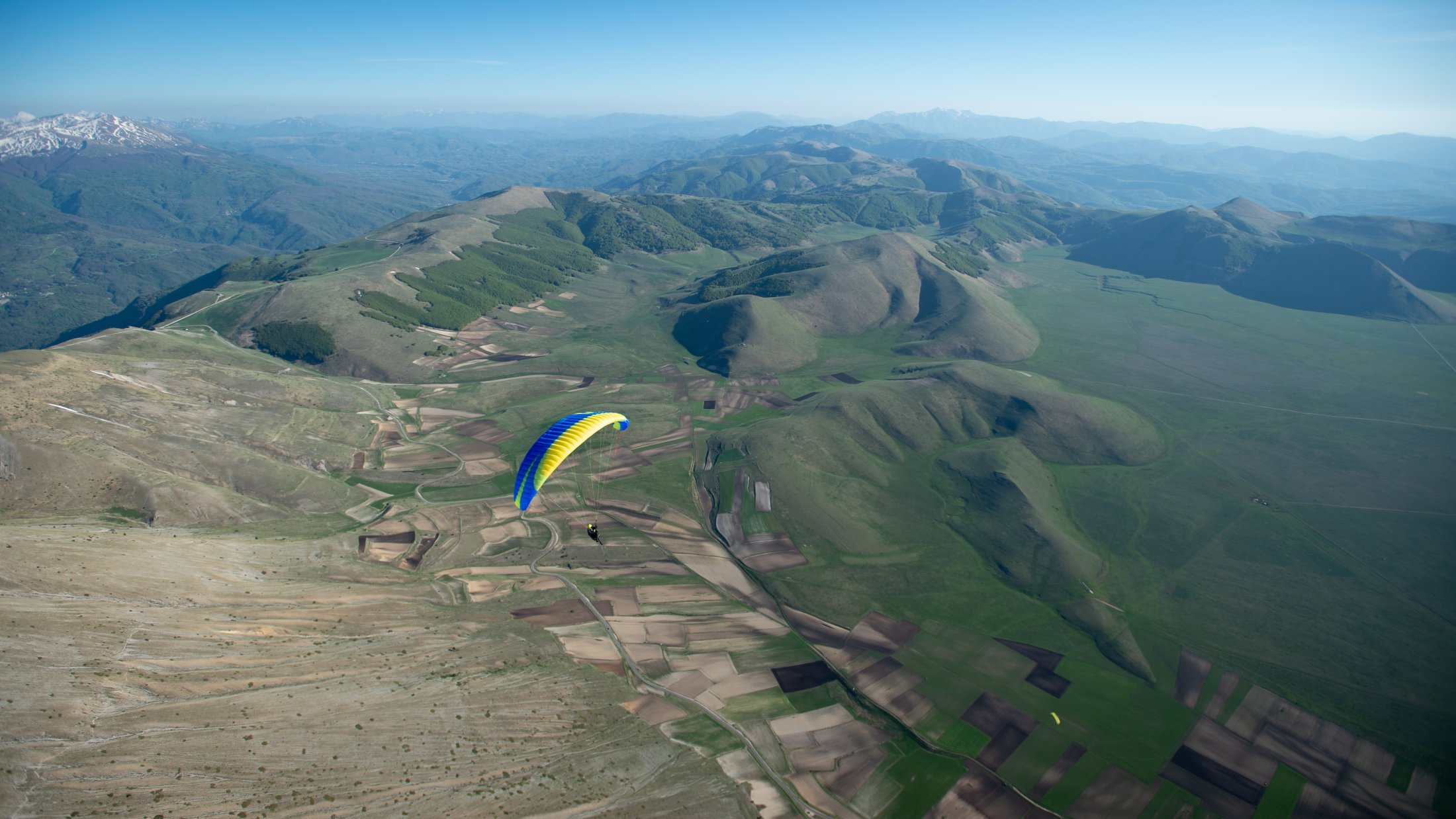 Die lokalen Windsysteme und die Frühlingsthermik schufen absolut grandiose Bedingungen. Durch die Tage konnten wir im mässigen Wind die weitläufige Ebene und die sanften Hügel des zentralen Apennins für unser Bodentraining nutzen. Die Basics zu Starkwindstarts, Kiten und diverse Tricks am Schirm waren bald gelernt. Am Nachmittag gab uns die im Westen stehende Nachmittagssonne noch bis zum eindunkeln viel Magic Air am Monte Vettore. Grossflächiges Steigen an den steilen Flanken des Berges und auch über der riesigen Ebene bis auf über 2500 Meter, ermöglichte uns oft einen hohen Rundumblick. Bis hinter die Berge und runter zum adriatischen Meer!