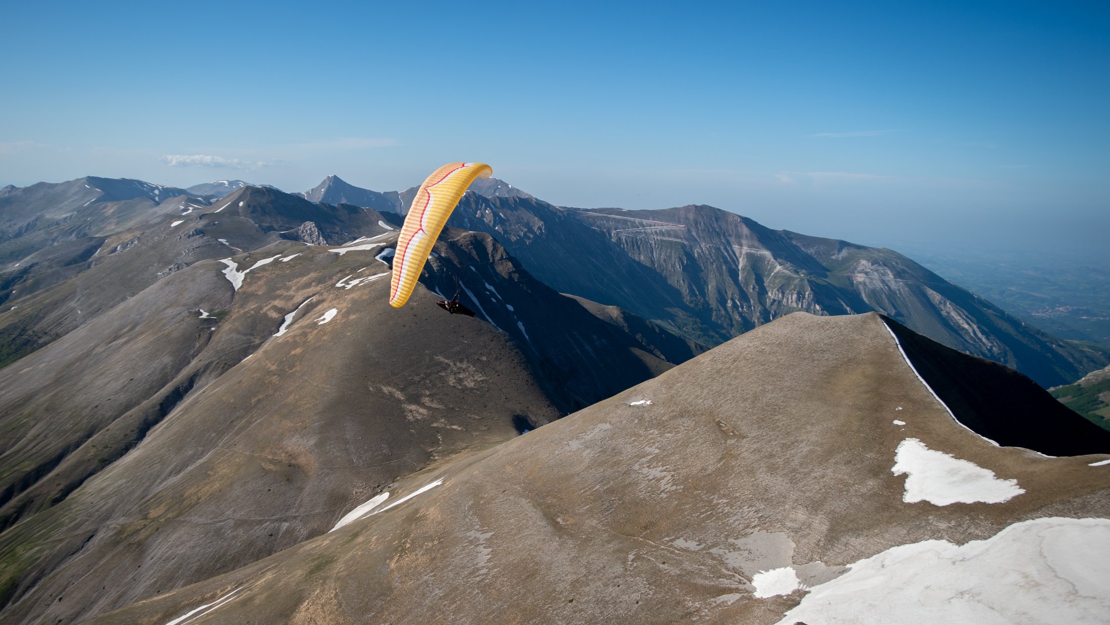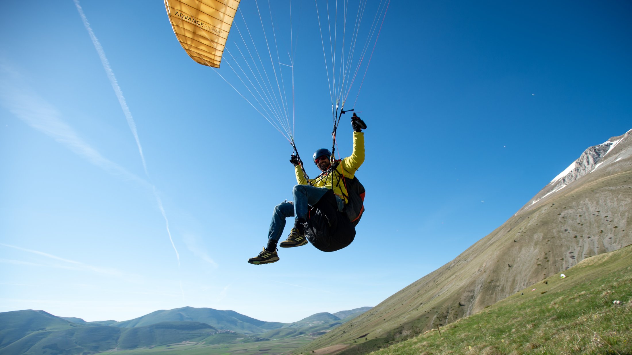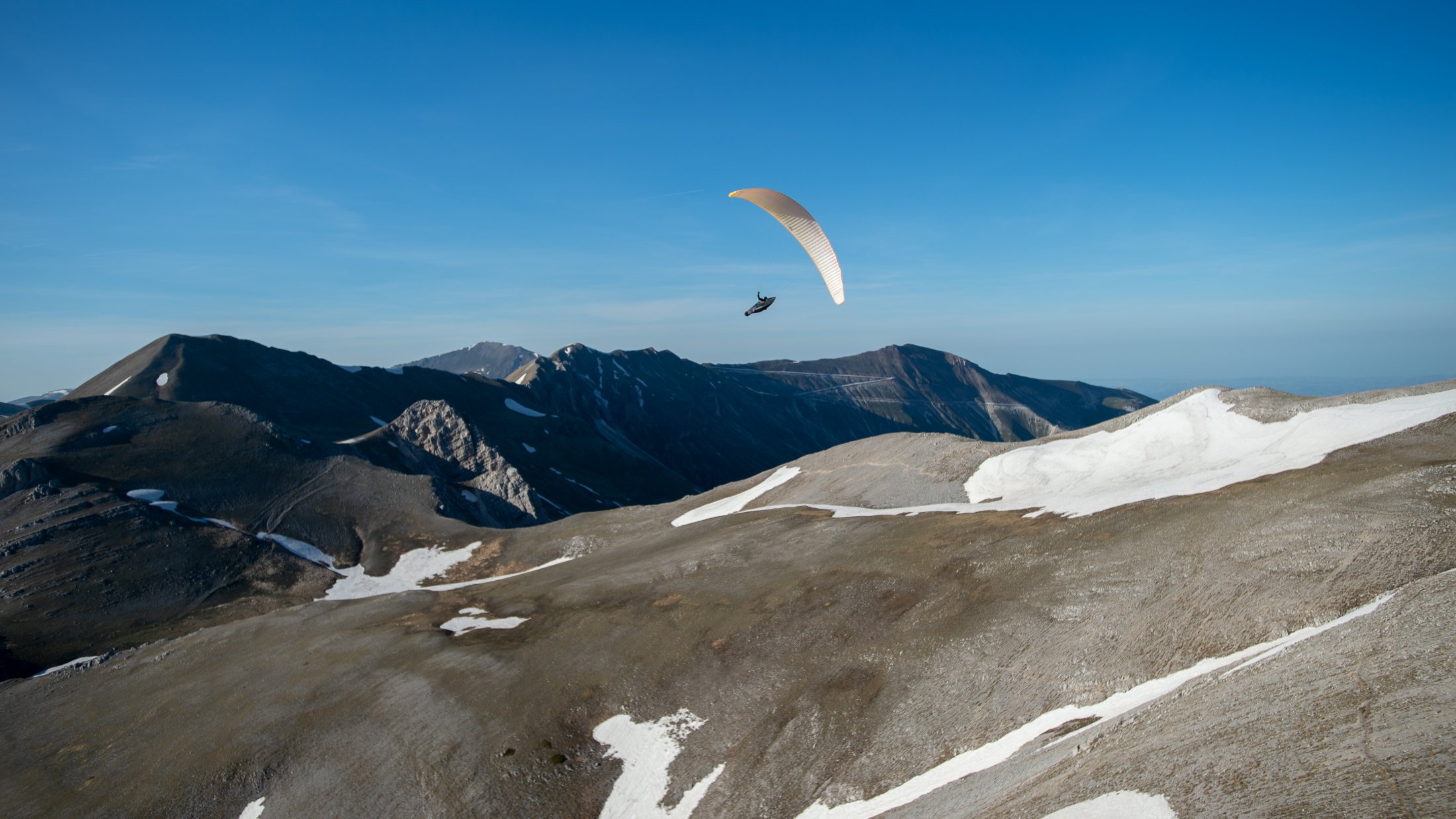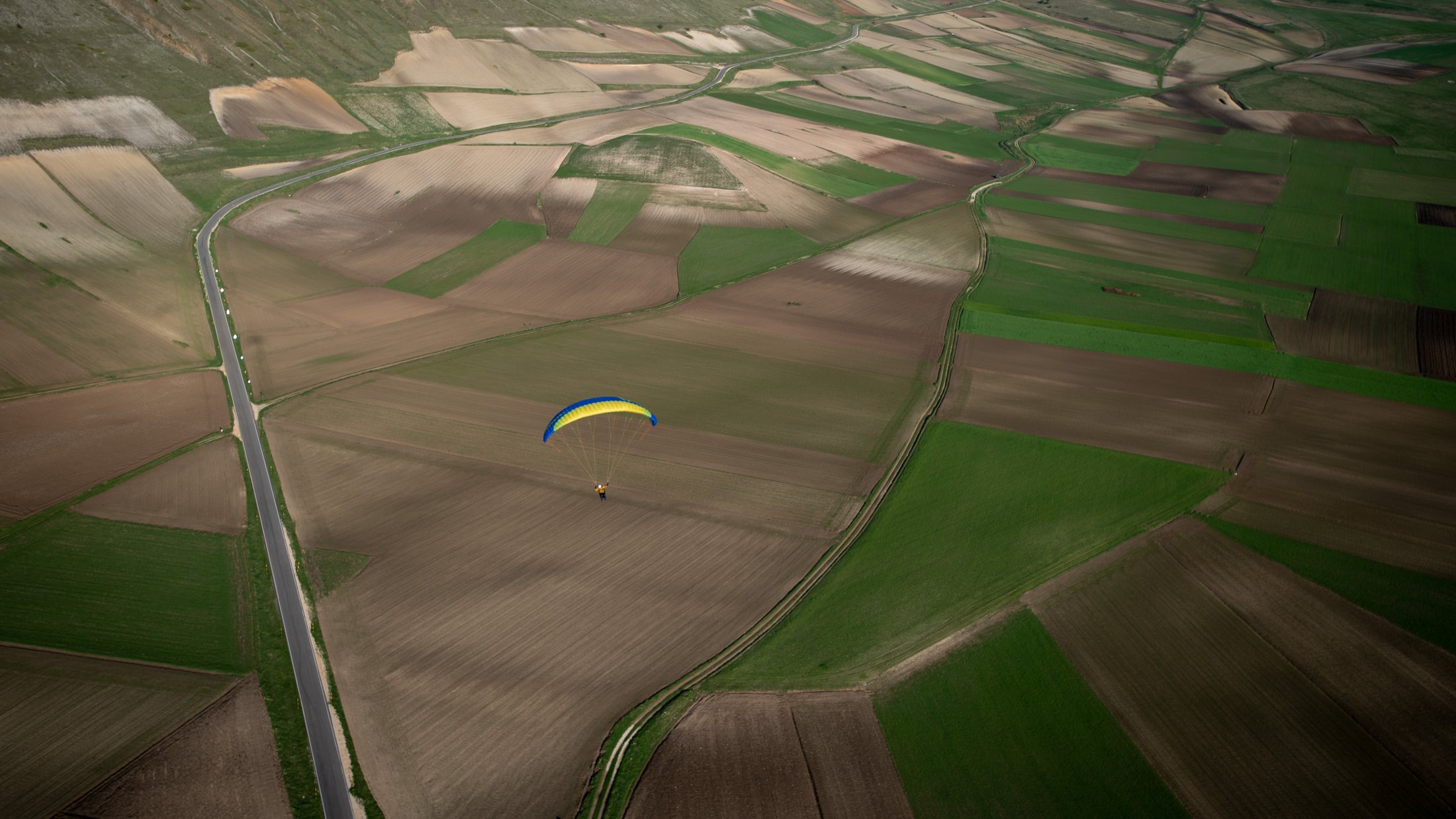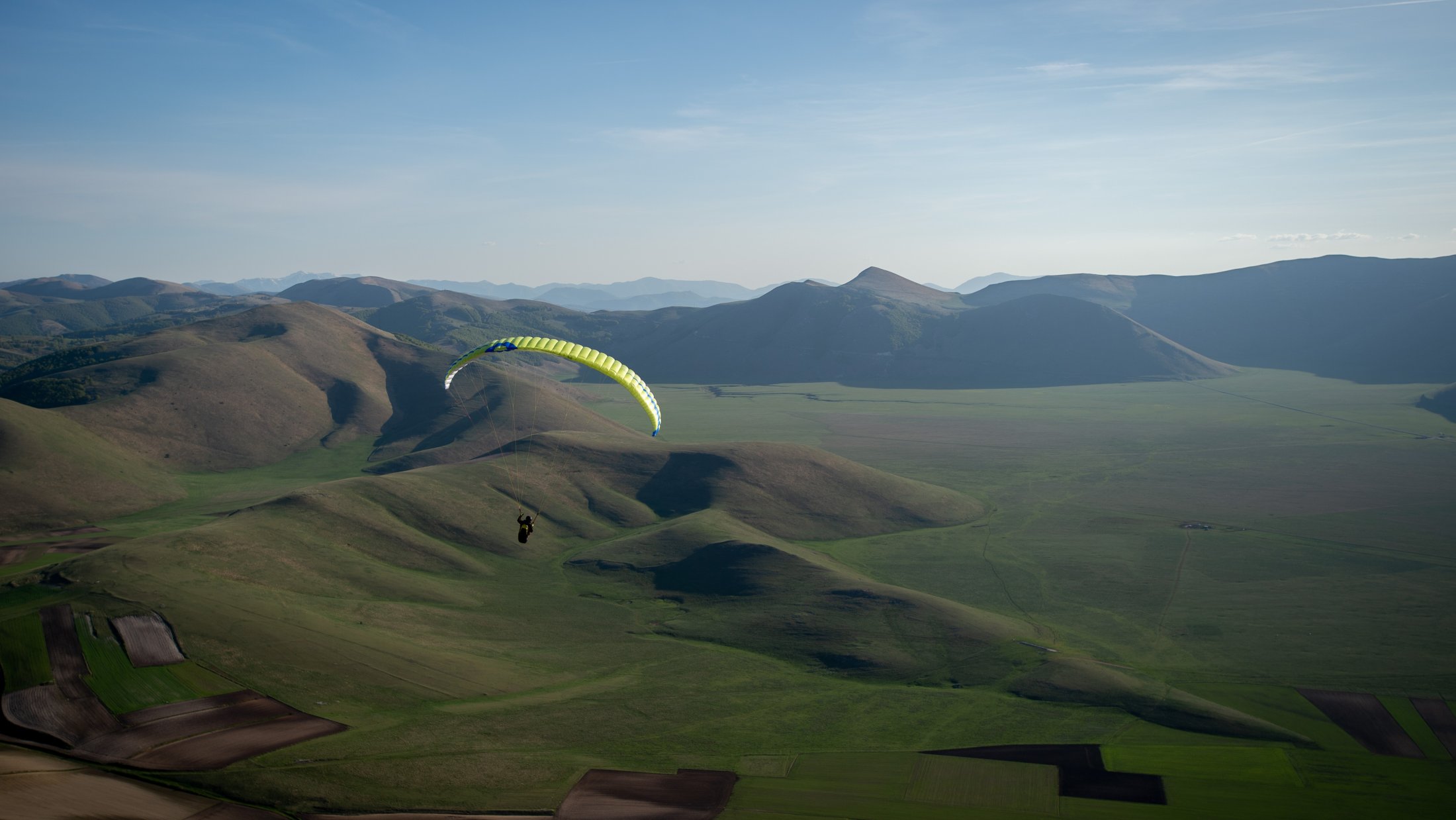 Die lokalen Windsysteme und die Frühlingsthermik schufen absolut grandiose Bedingungen. Durch die Tage konnten wir im mässigen Wind die weitläufige Ebene und die sanften Hügel des zentralen Apennins für unser Bodentraining nutzen. Die Basics zu Starkwindstarts, Kiten und diverse Tricks am Schirm waren bald gelernt. Am Nachmittag gab uns die im Westen stehende Nachmittagssonne noch bis zum eindunkeln viel Magic Air am Monte Vettore. Grossflächiges Steigen an den steilen Flanken des Berges und auch über der riesigen Ebene bis auf über 2500 Meter, ermöglichte uns oft einen hohen Rundumblick. Bis hinter die Berge und runter zum adriatischen Meer!