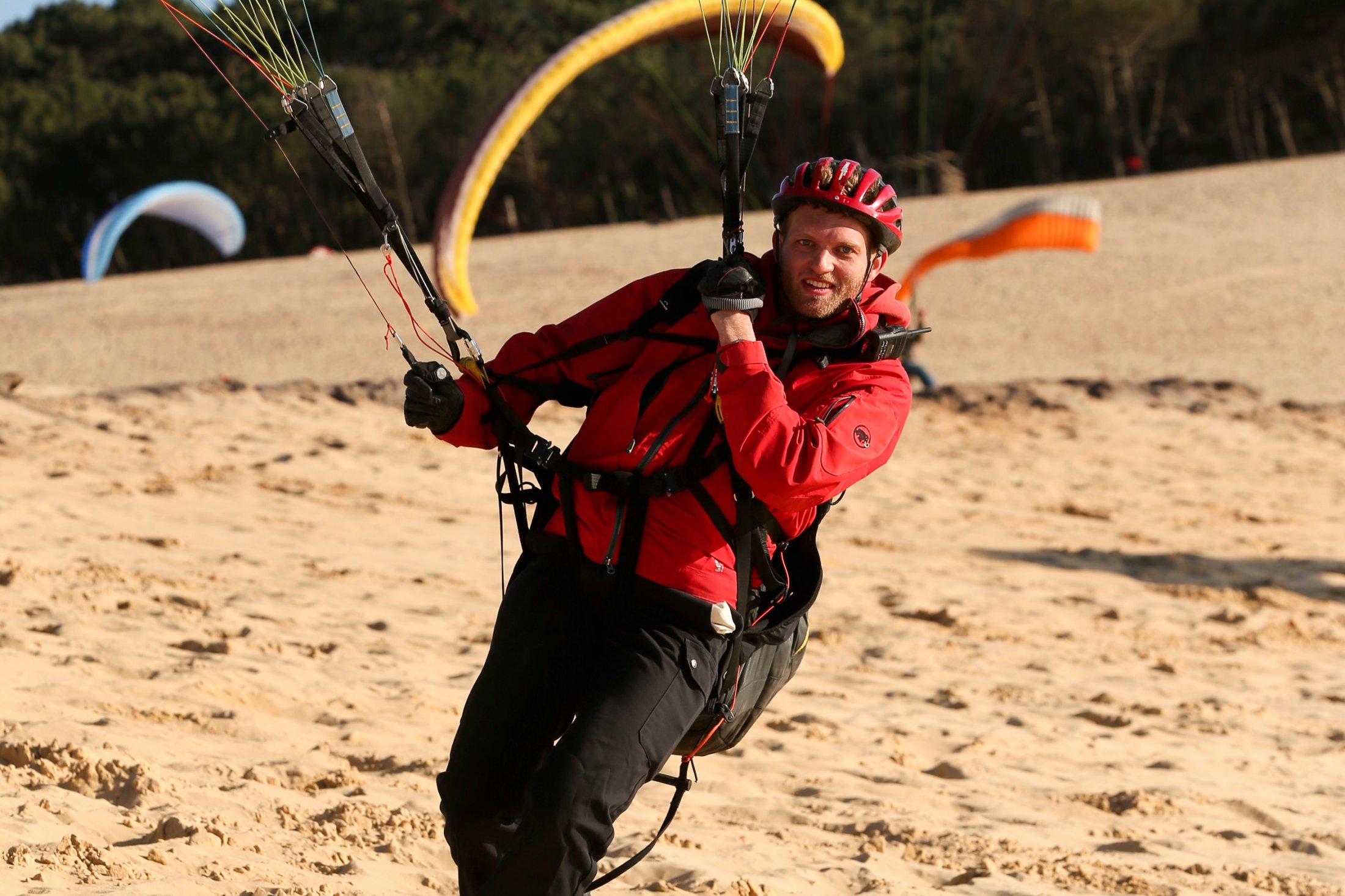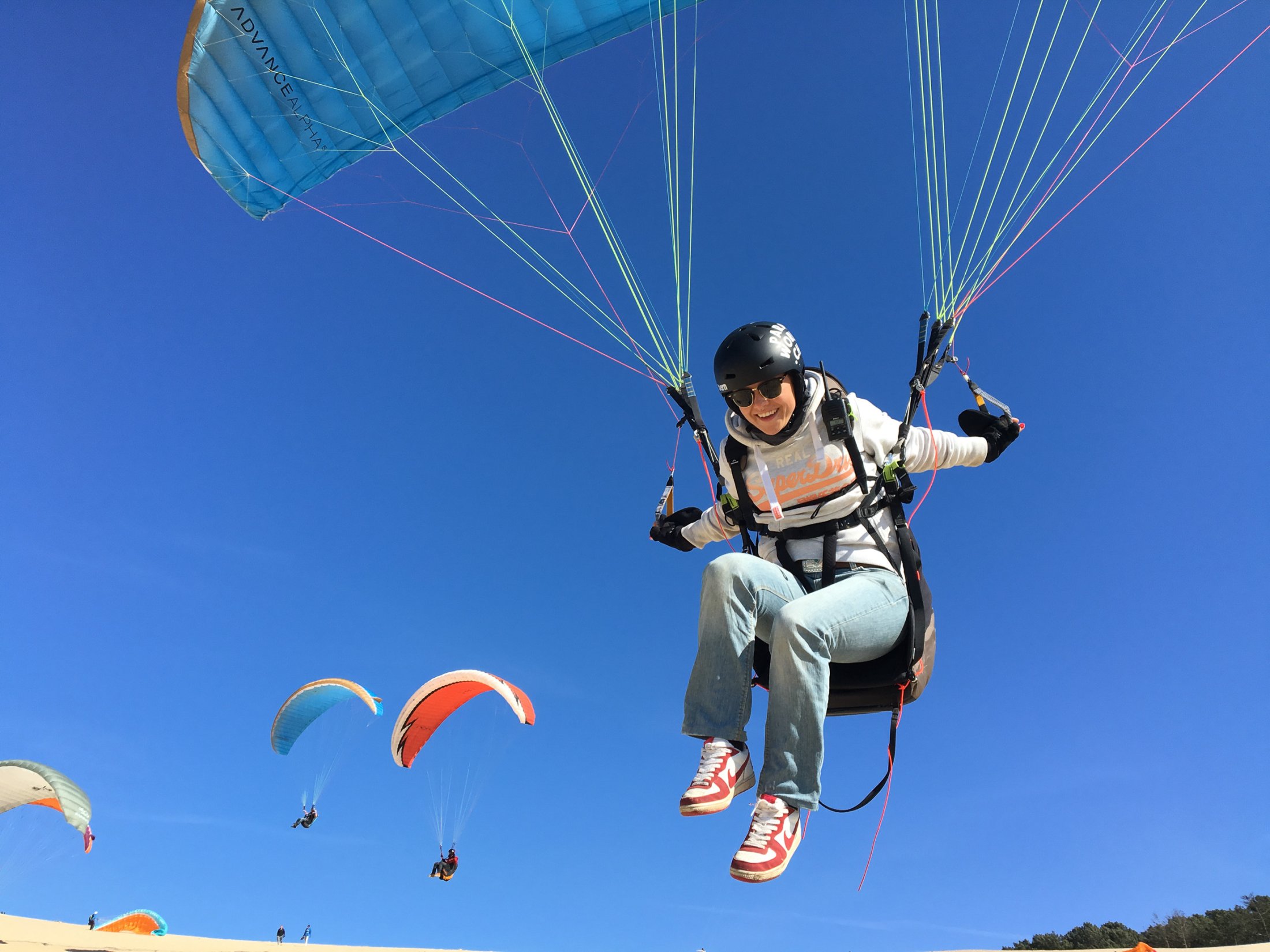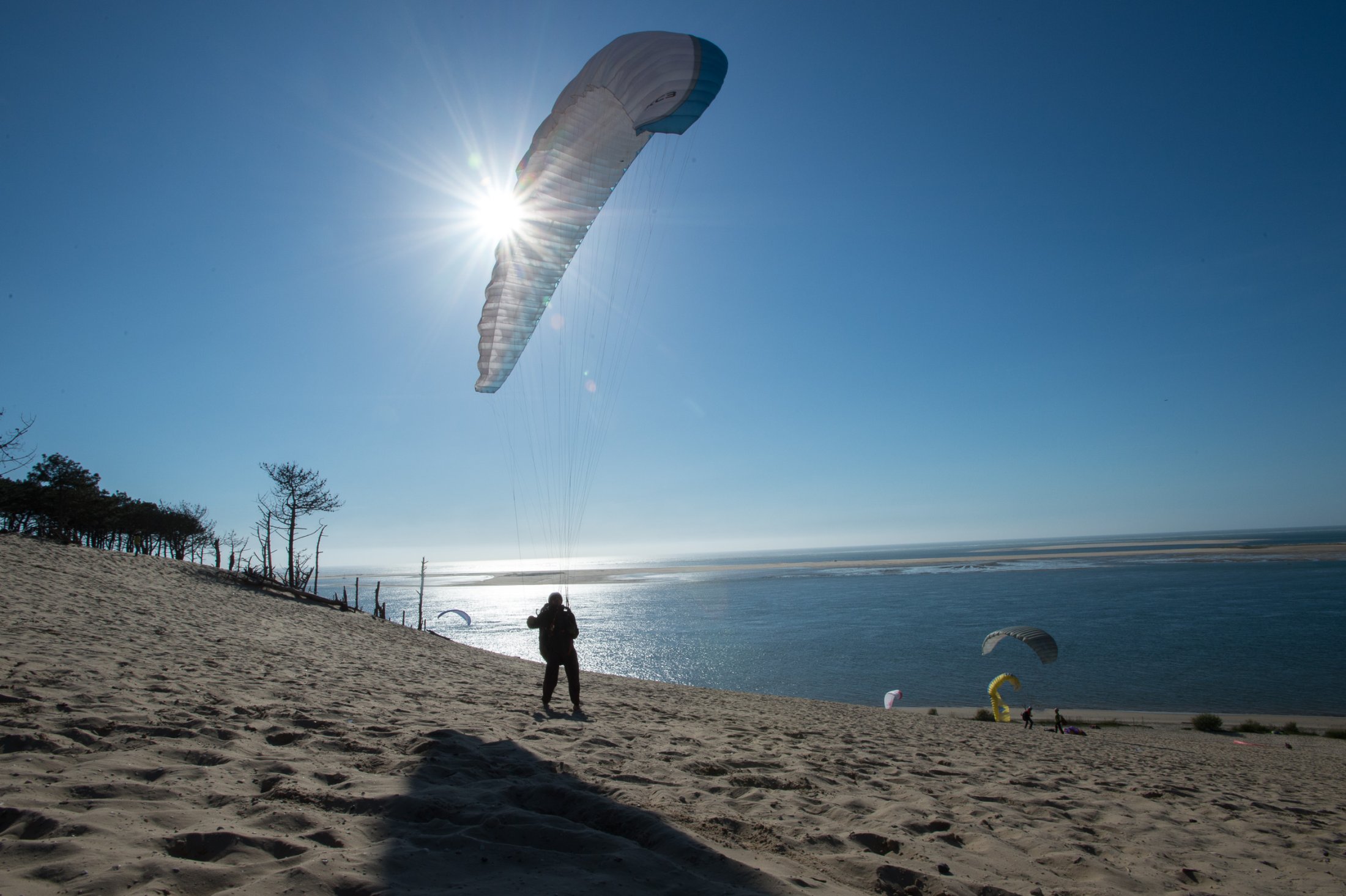 Auf der Düne lernten wir schon vom ersten Tag an, den Schirm in stärksten Bedingungen zu bändigen. Nach ein paar grossen Bissen Sand und viel vergossenem Schweiss, handelten alle, auch in Starkwind, ihren Schirm wie die Profis.
