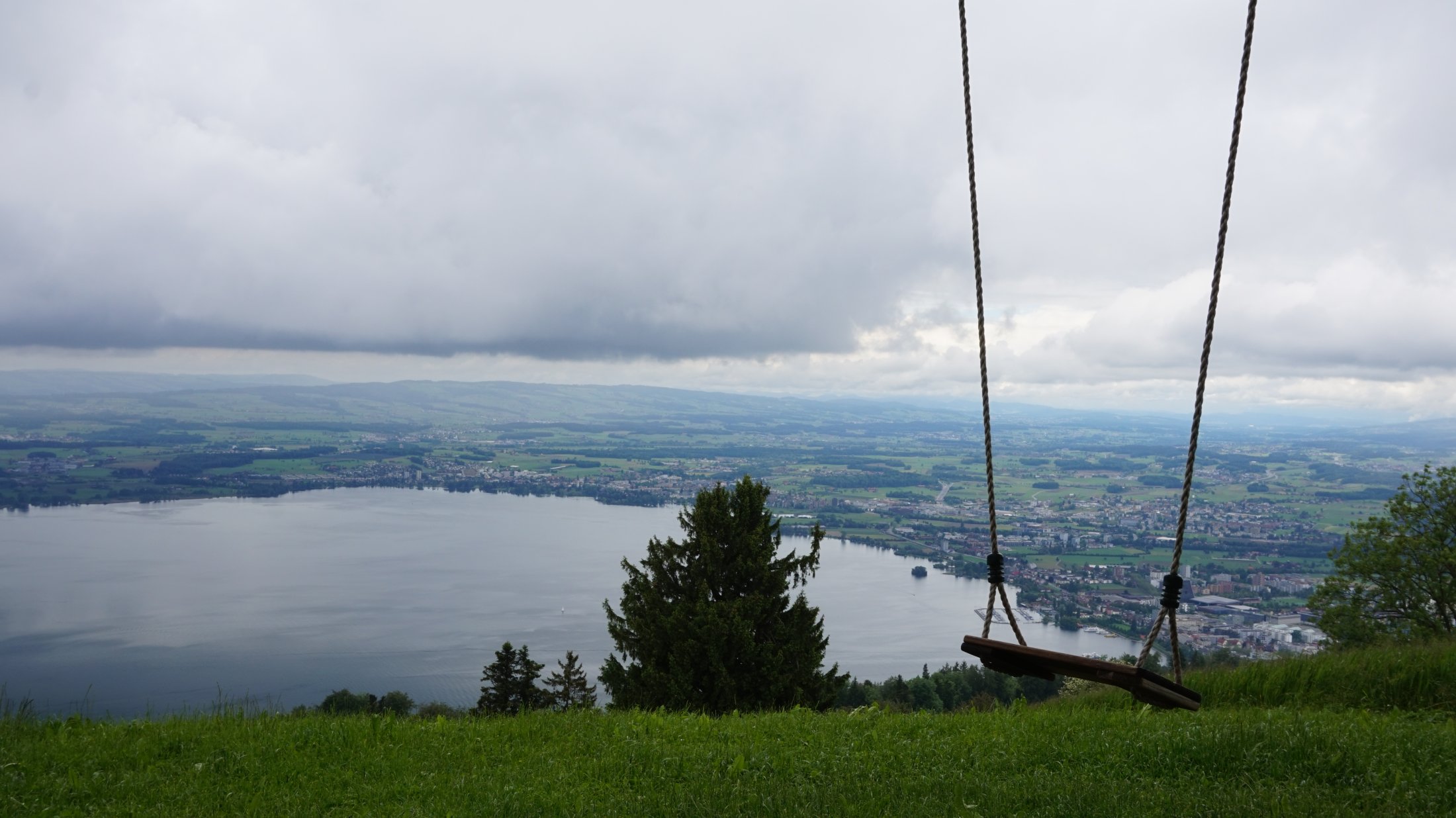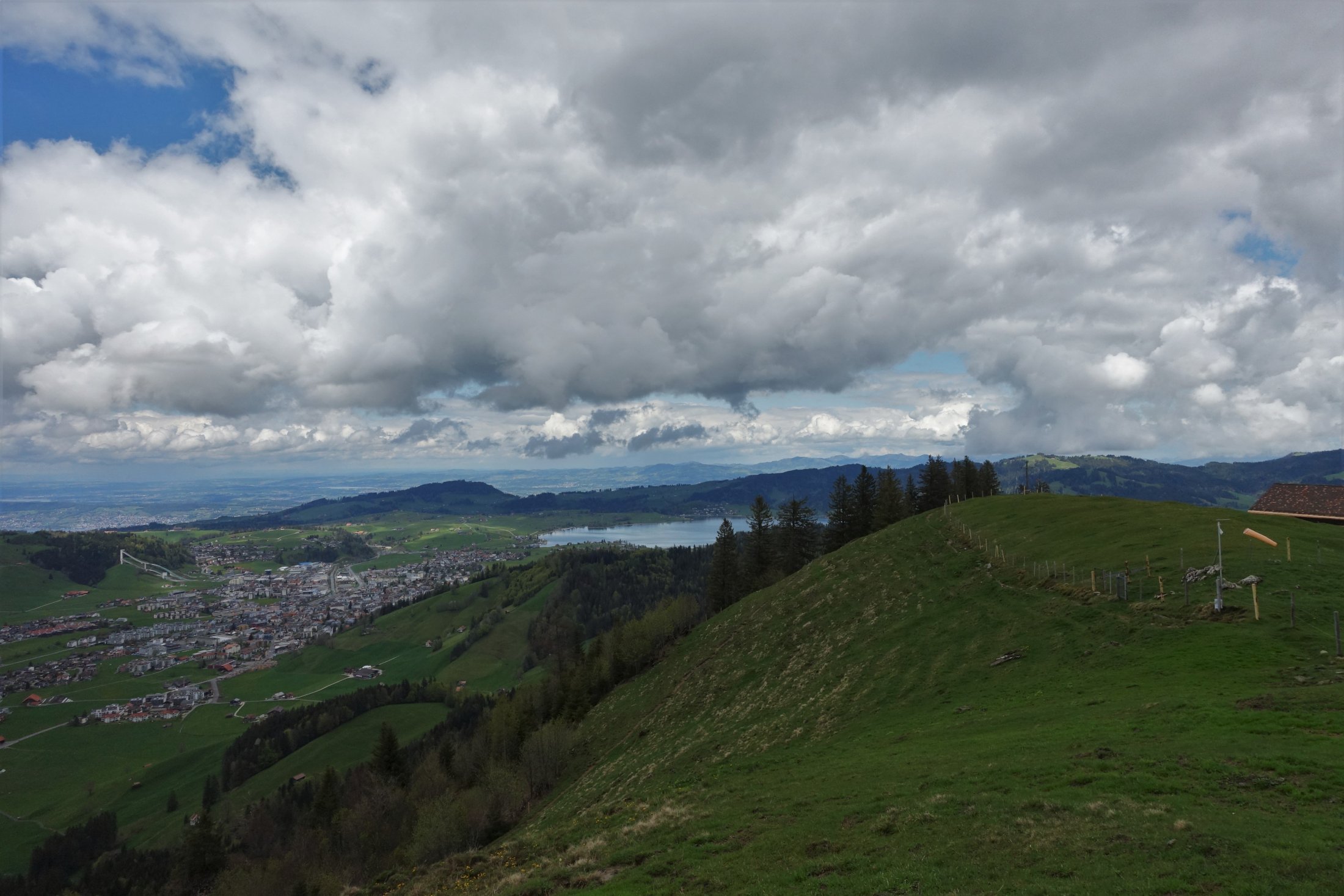 Blick vom Tritt über Einsiedeln in Richtung NO, wo formierte Wolken der durchgezogenen Kaltfront auszumachen sind.
