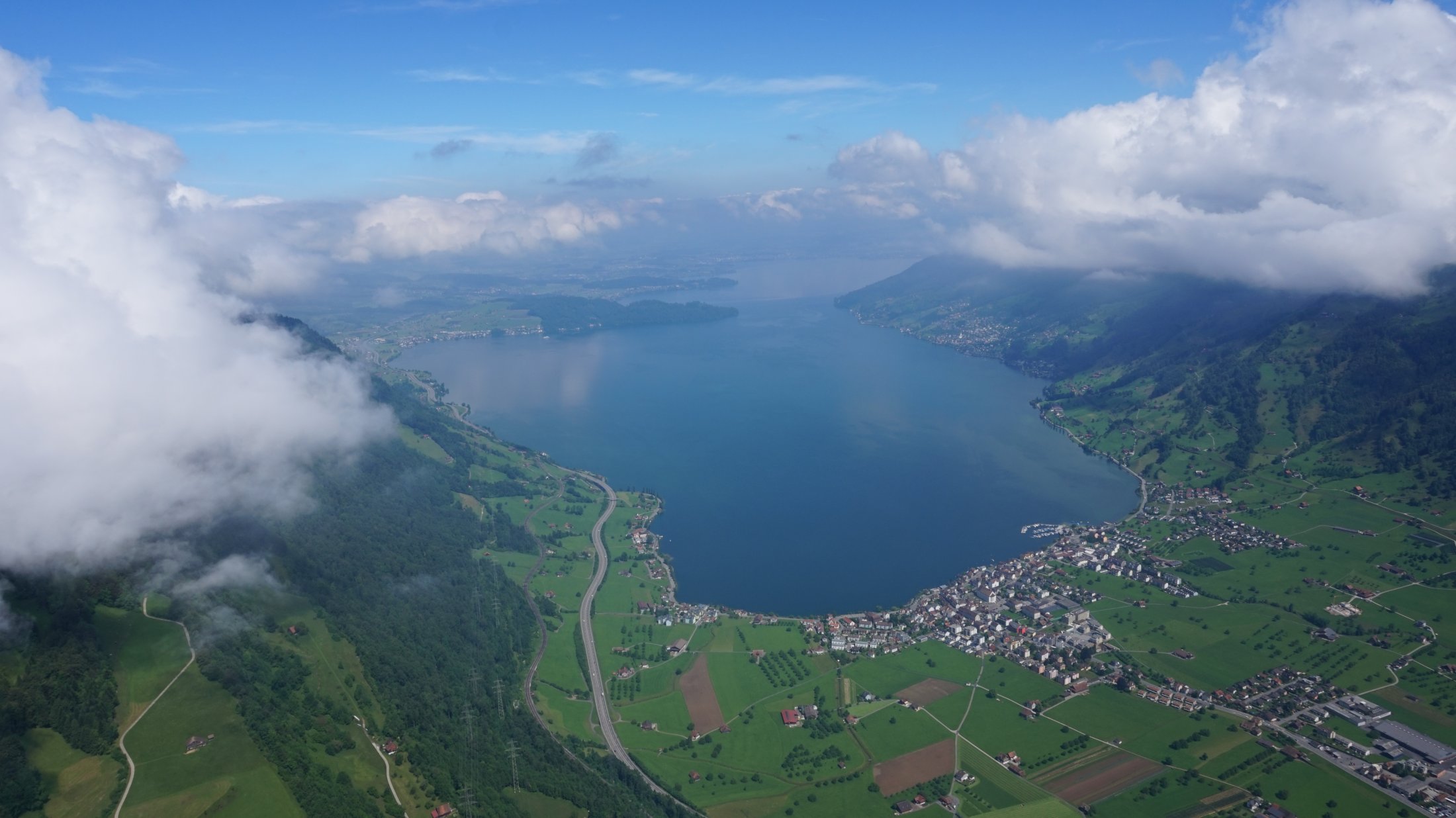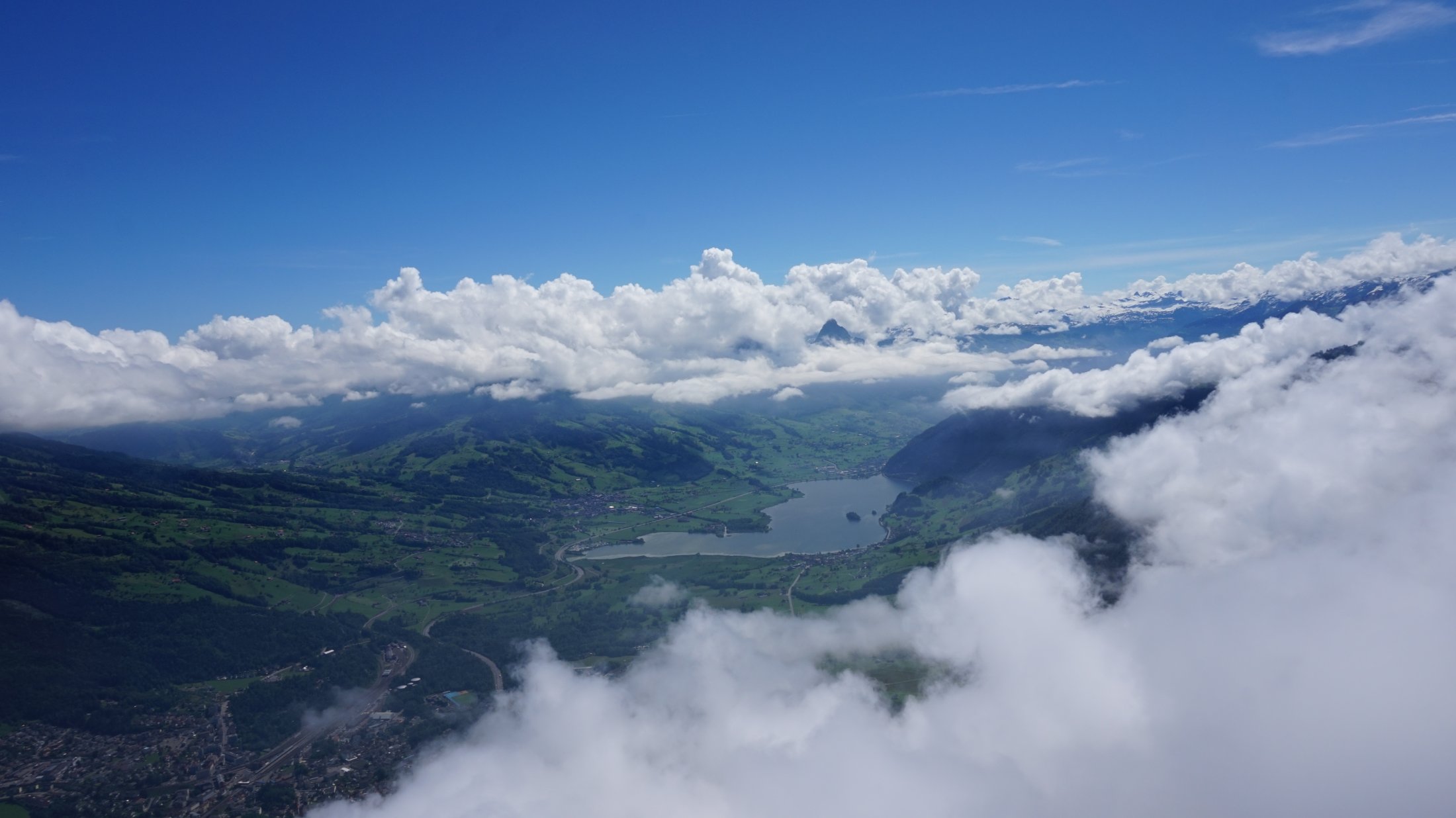 Flug von Rigi Kulm mit Blick in Richtung SO, Lauerzersee und Chli und Gross Mythen. Die Front zog am Nachmittag des Vortags durch, noch sitzt die Restfeuchtigkeit in den Hängen, der Hochdruck macht jedoch seinen Einfluss geltend.