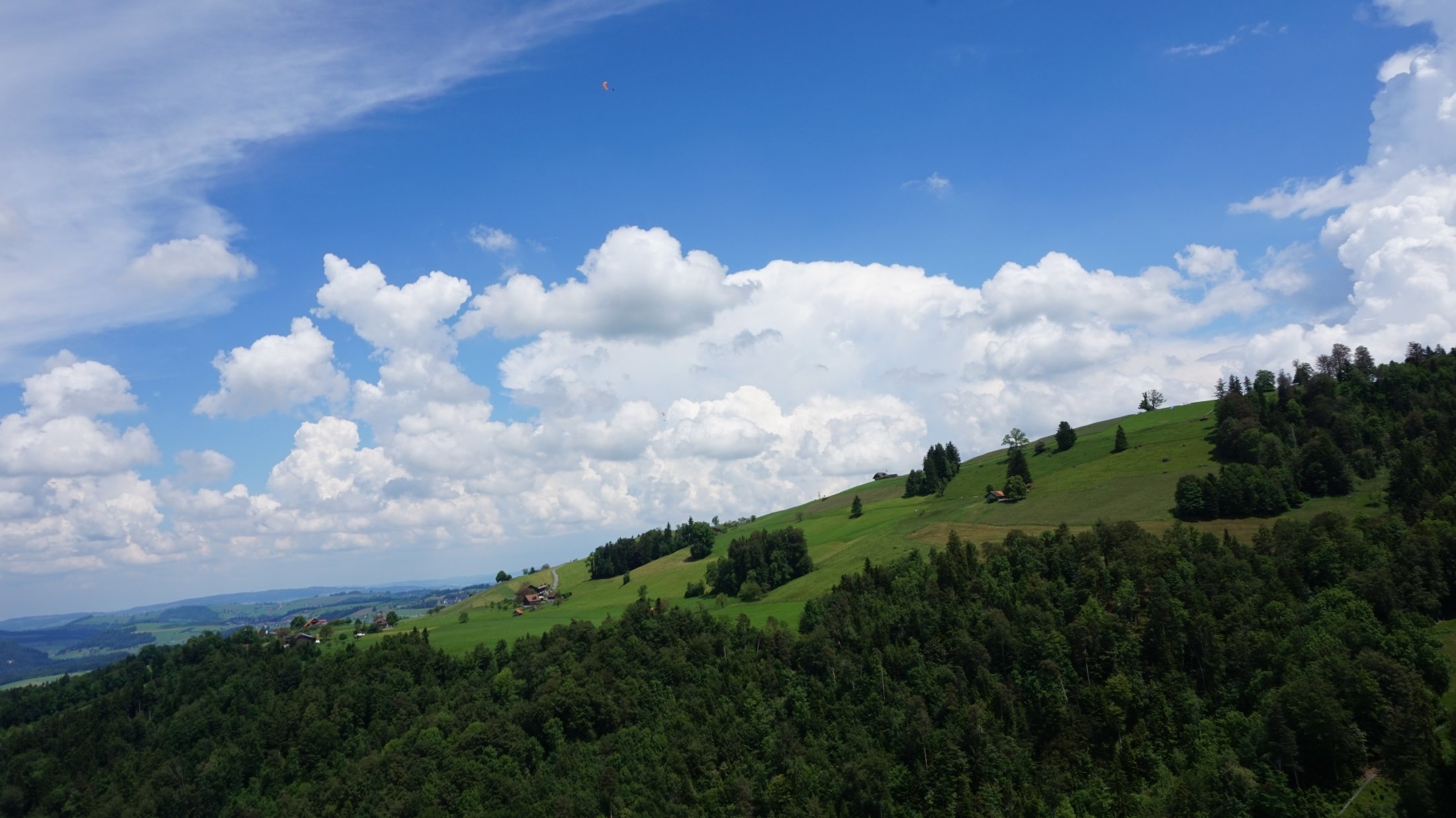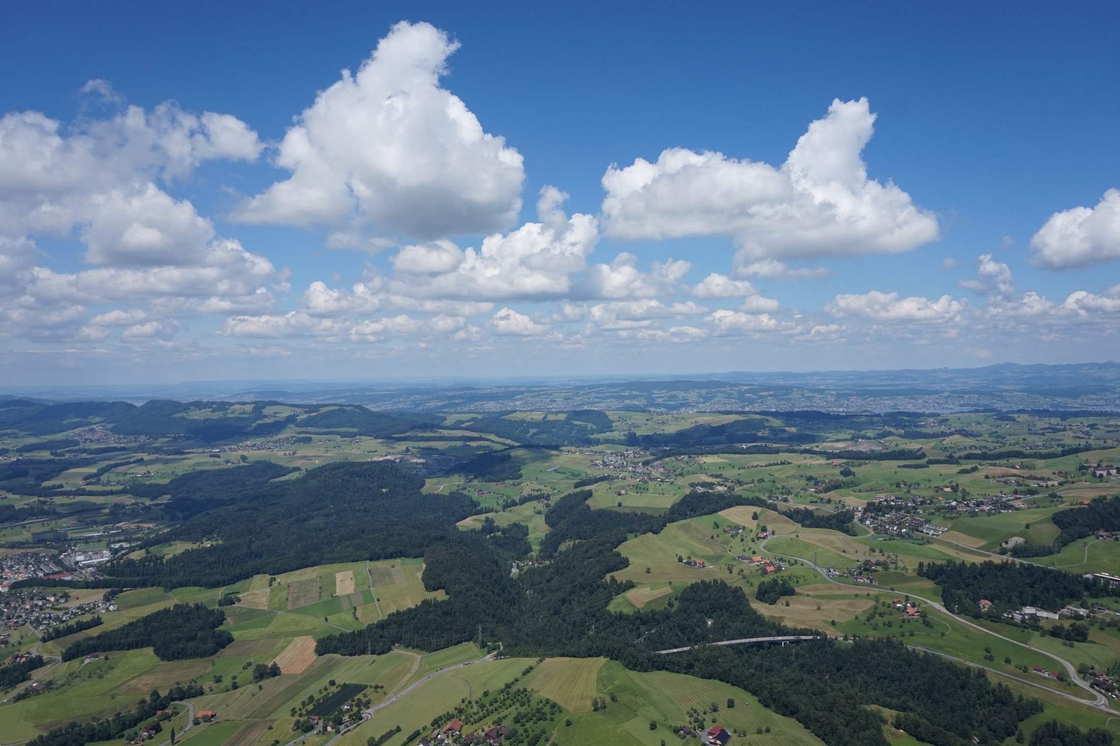 Im Flug vom Zugi, Blickrichtung NO. Der Hochdruck ist bemerkbar, noch kontrolliert und stabilisiert er jedoch nicht genug und Überentwicklungen sind an der Tagesgangordnung.