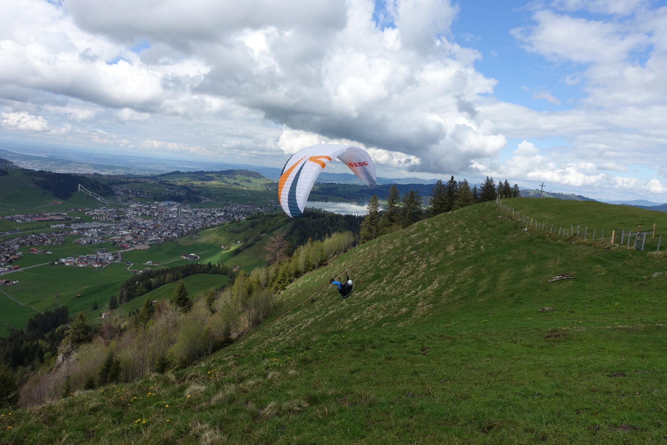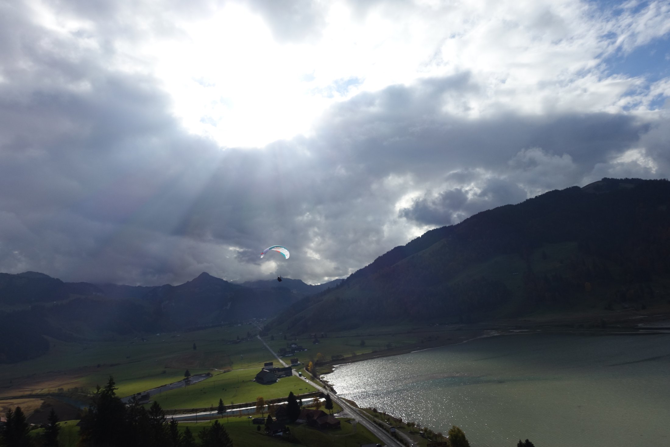 3 h nach dem Durchzug der Front: Hike & Fly vom Chli Aubrig, postfrontale Subsidenz und erstes Aufklaren am Sihlsee.